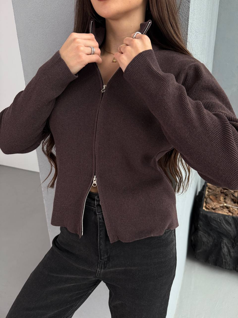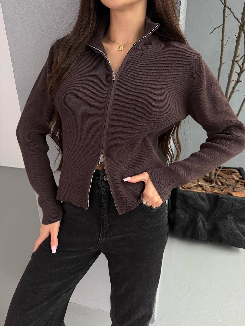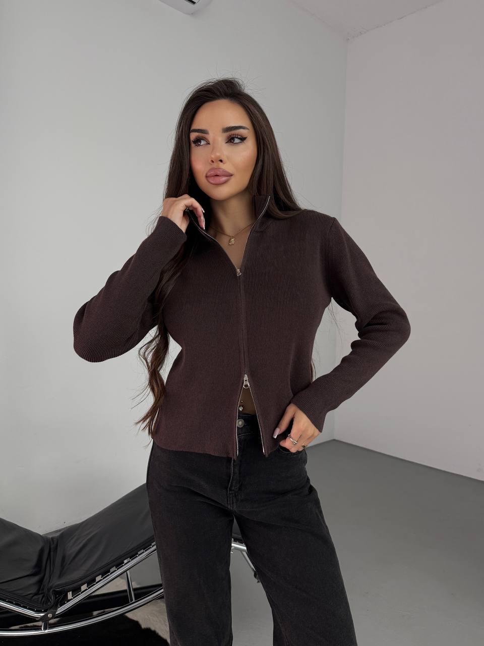 Жіноча Укорочена Трикотажна Коричнева Кофта на Блискавці