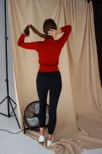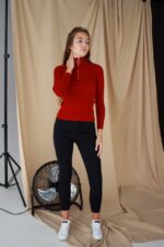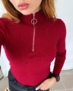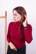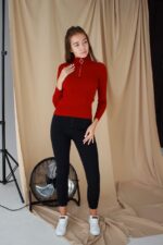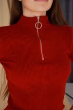 Жіночий Червоний Гольф у Рубчик з Блискавкою на Комірі та Укороченими Рукава