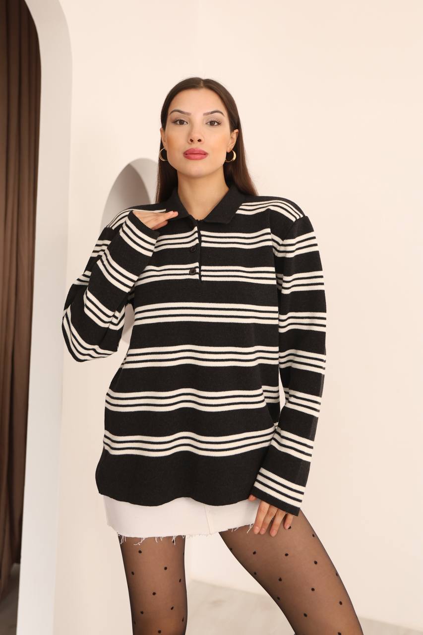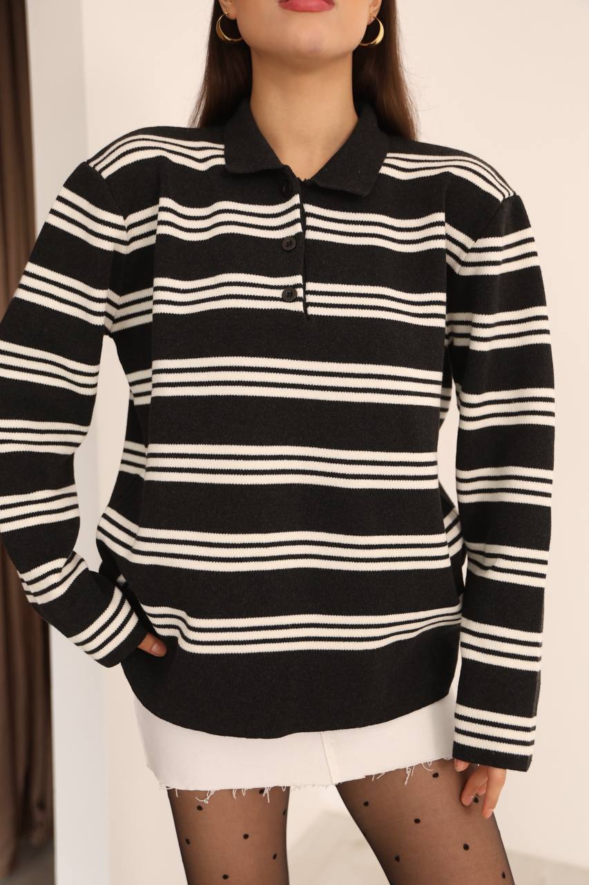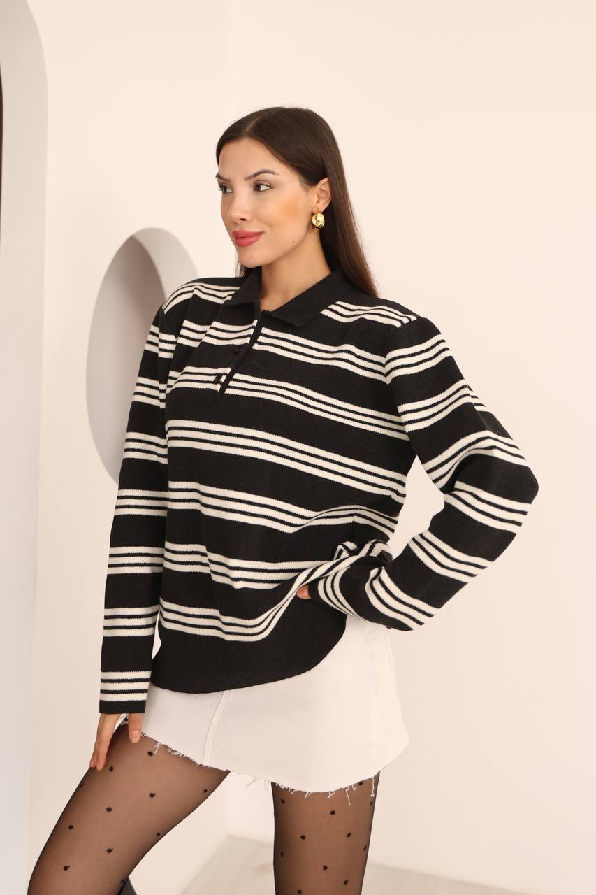 Женский Черный Джемпер Свободного Кроя с Полосками и Воротником Поло