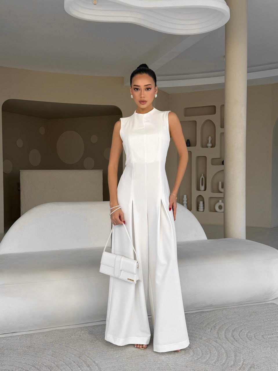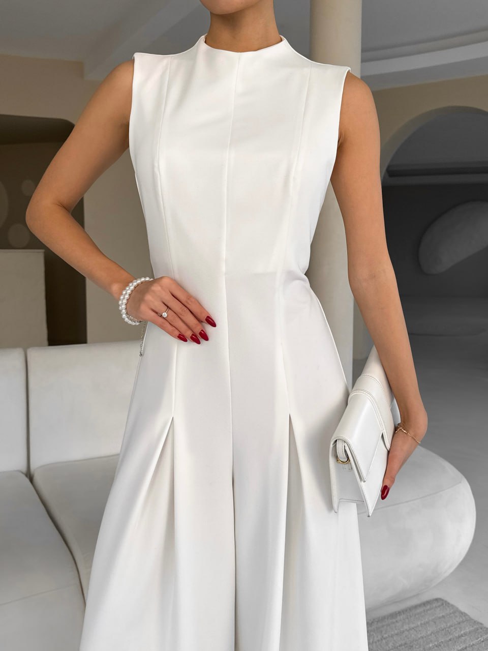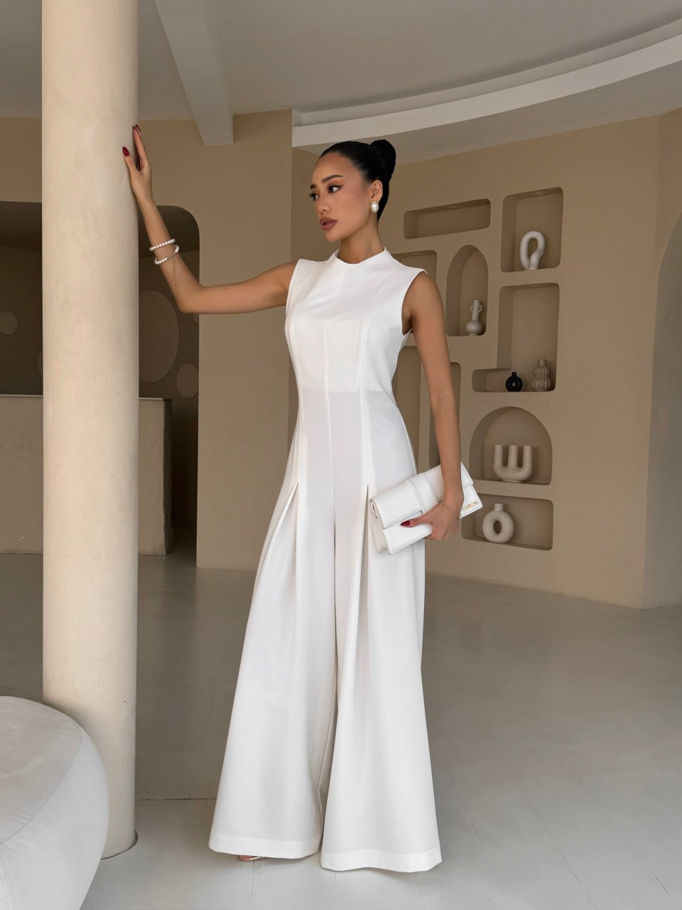 Жіночий Довгий Білий Комбінезон Лакі без Рукавів зі Складками