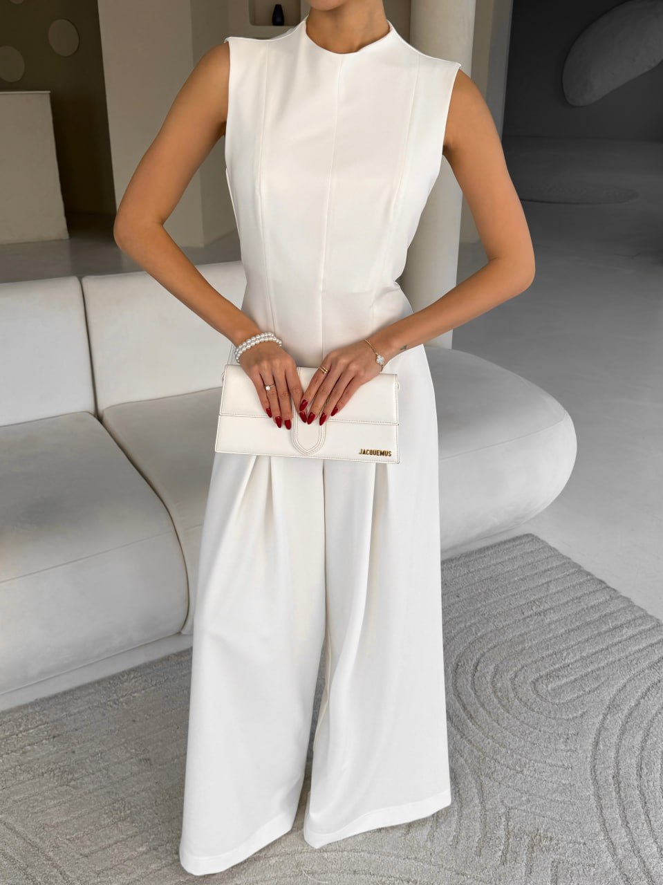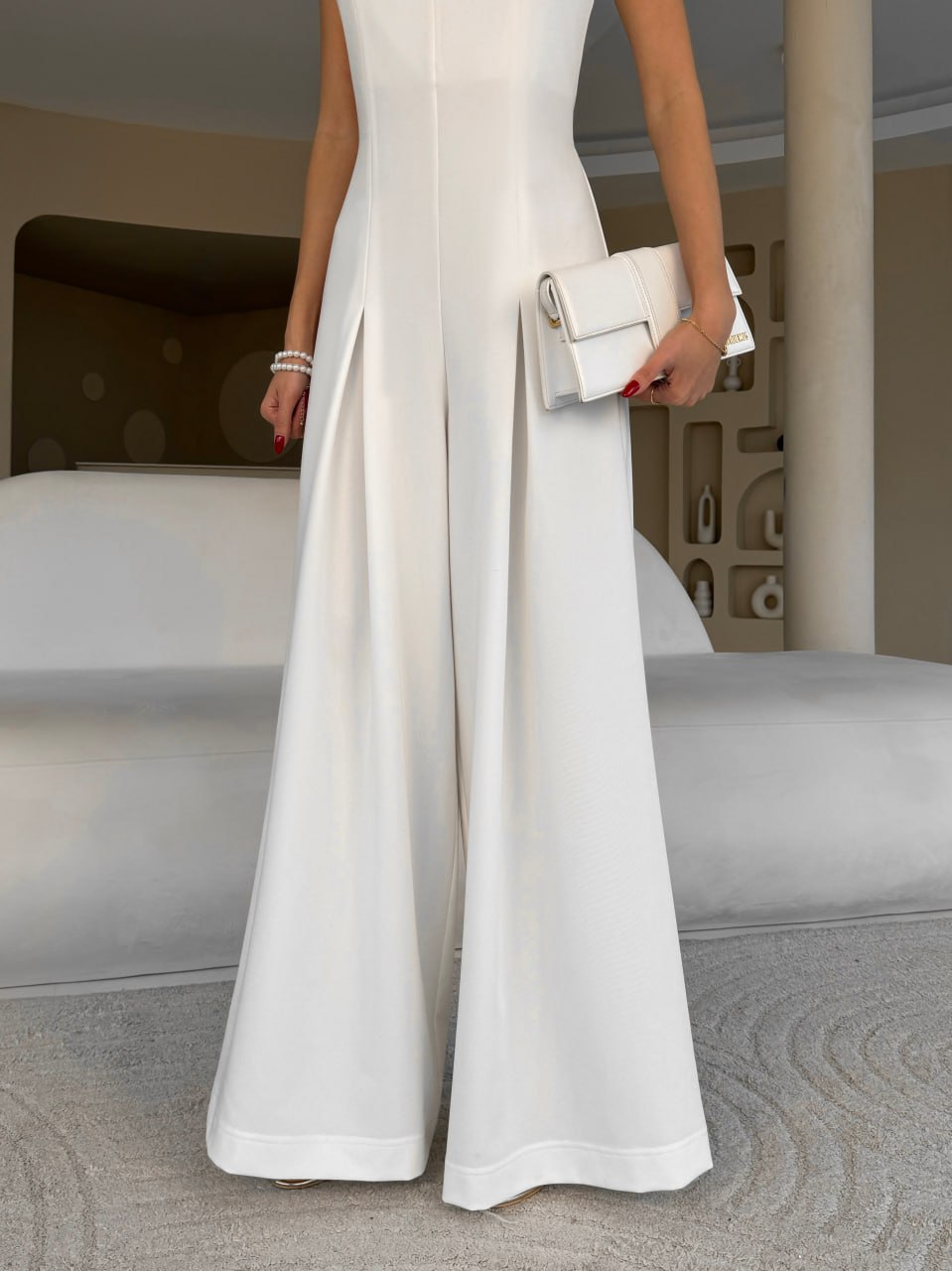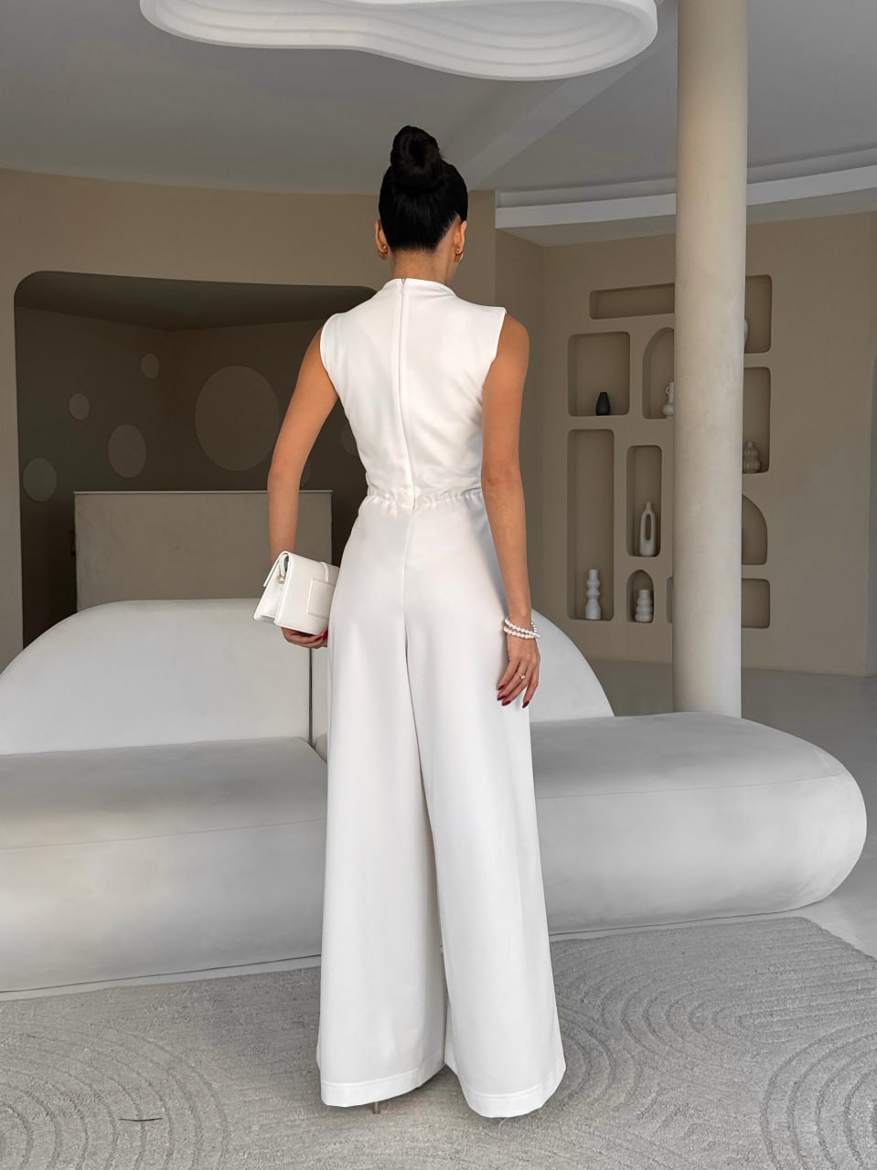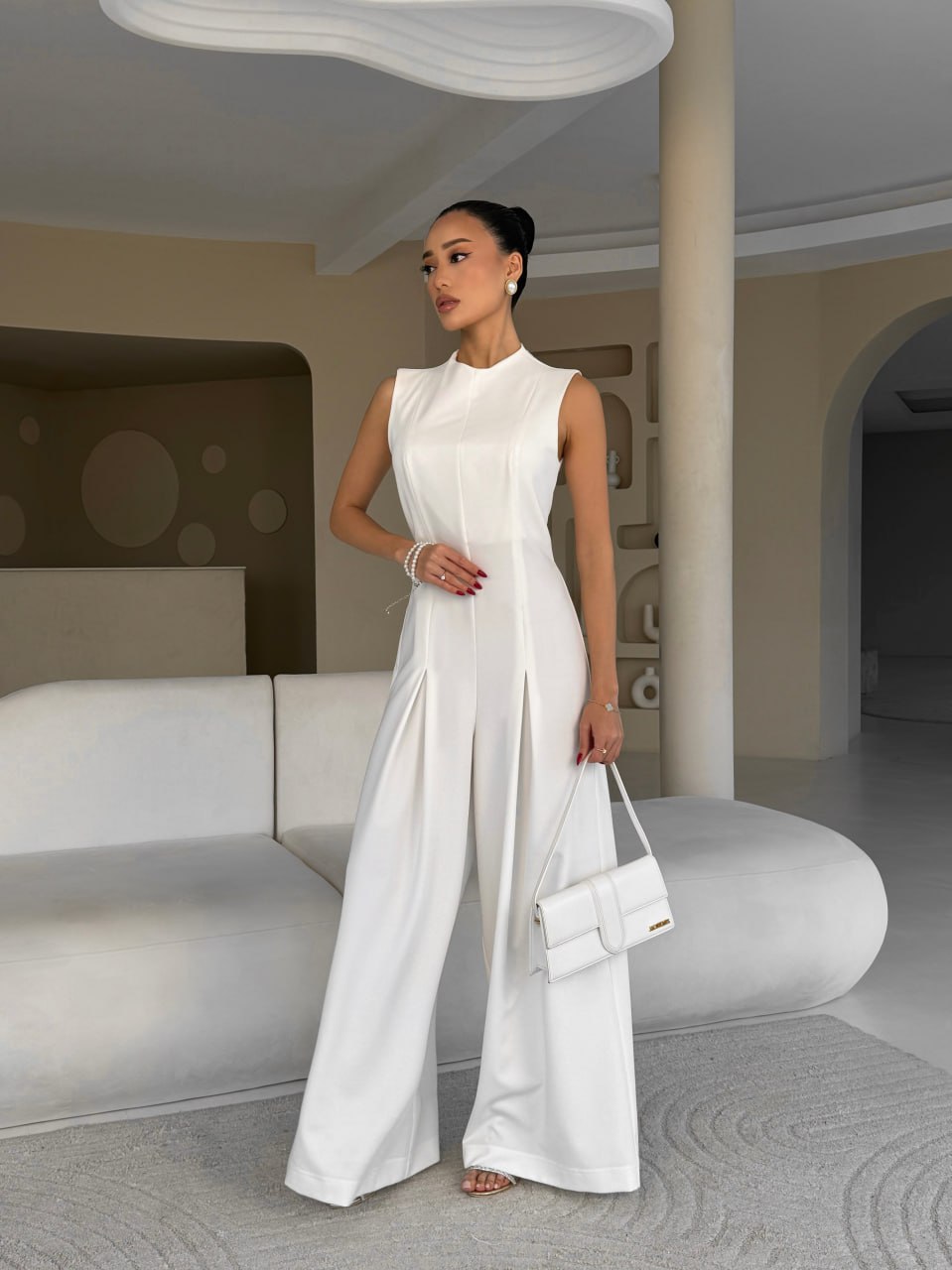 Жіночий Довгий Білий Комбінезон Лакі без Рукавів зі Складками