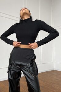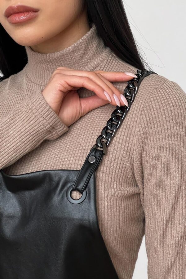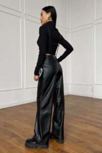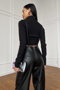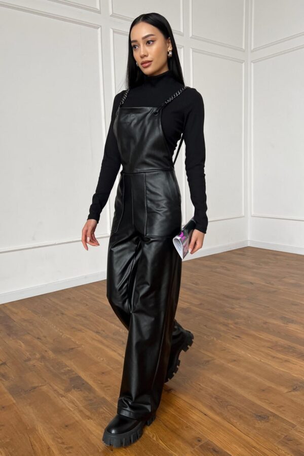 Жіночий Шкіряний Чорний Комбінезон Харлі з Штанами Палаццо на Бретелях з Декоративним Ланцюгом