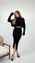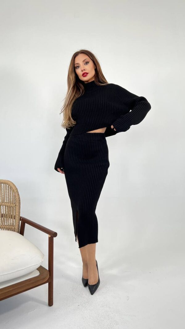 Трикотажний Жіночий Чорний Комплект Двійка – Вільний Укорочений Светр + Приталена Спідниця Міді з Розрізом