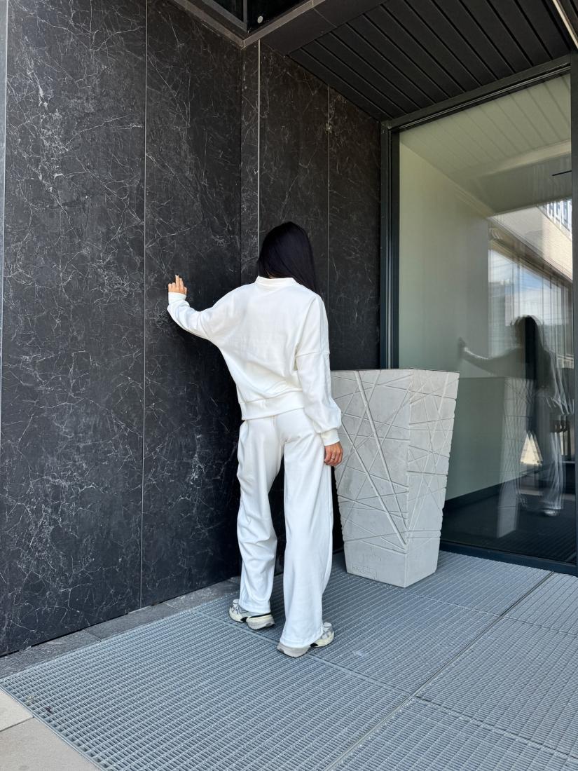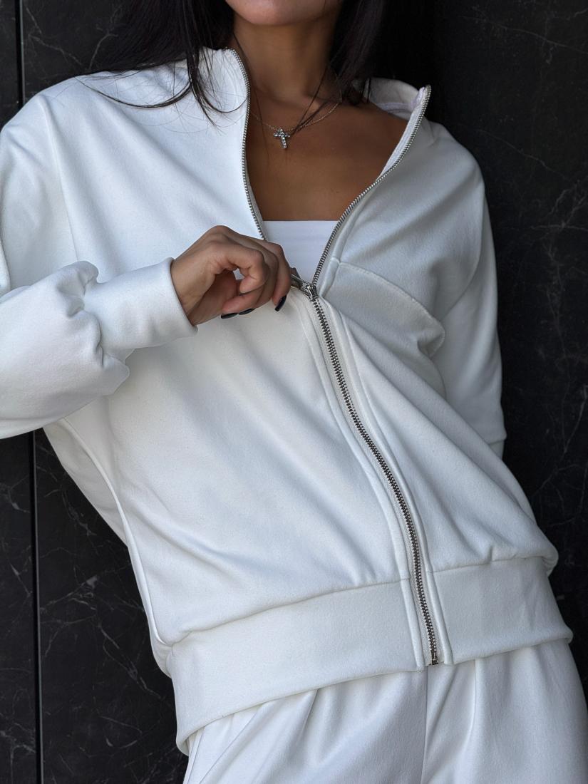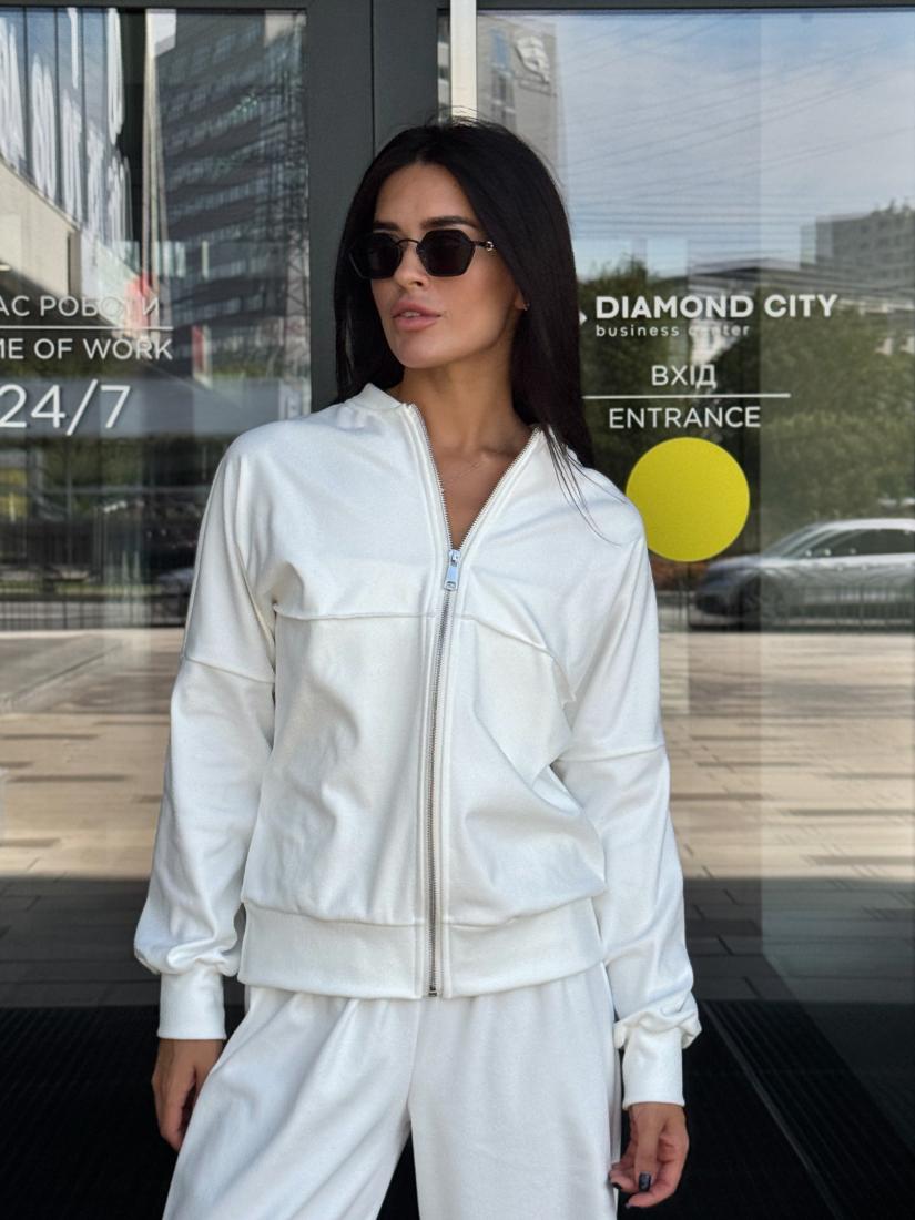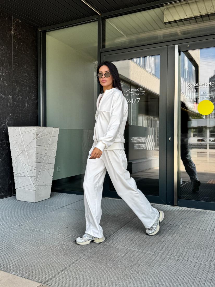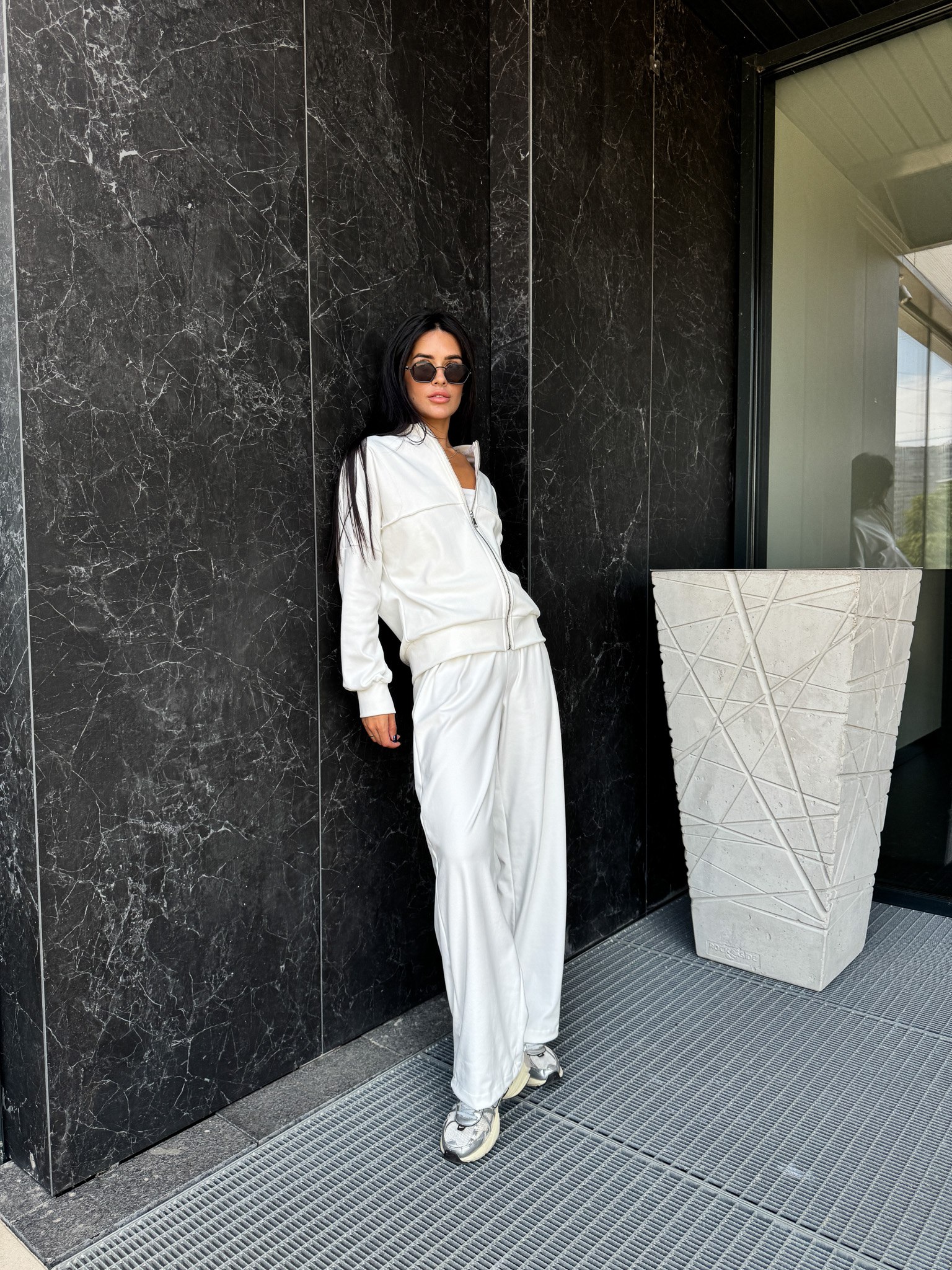 Жіночий Базовий Білий Костюм – Кофта Бомбер на Блискавці + Широкі Штани