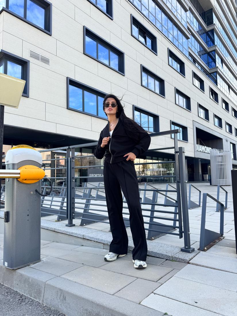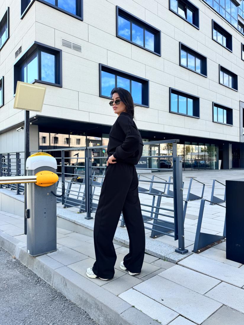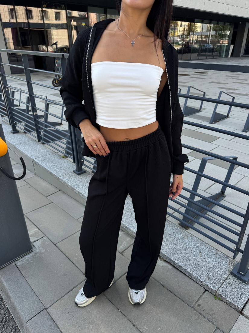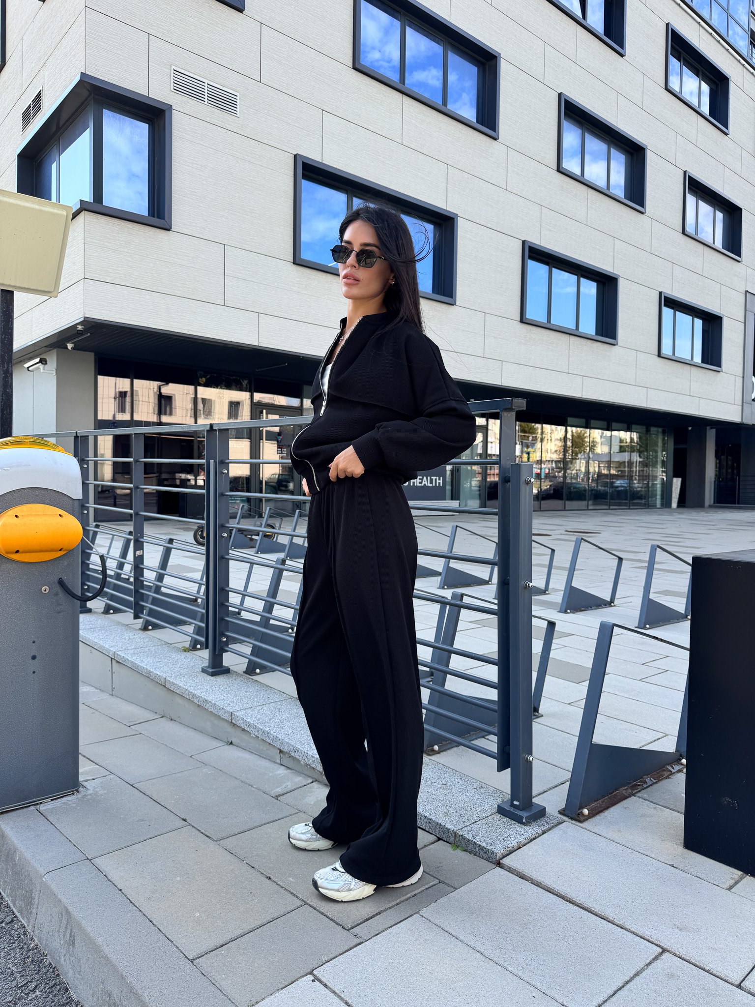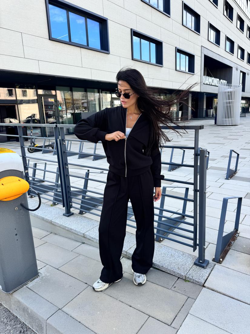 Жіночий Базовий Чорний Костюм – Кофта Бомбер на Блискавці + Широкі Штани