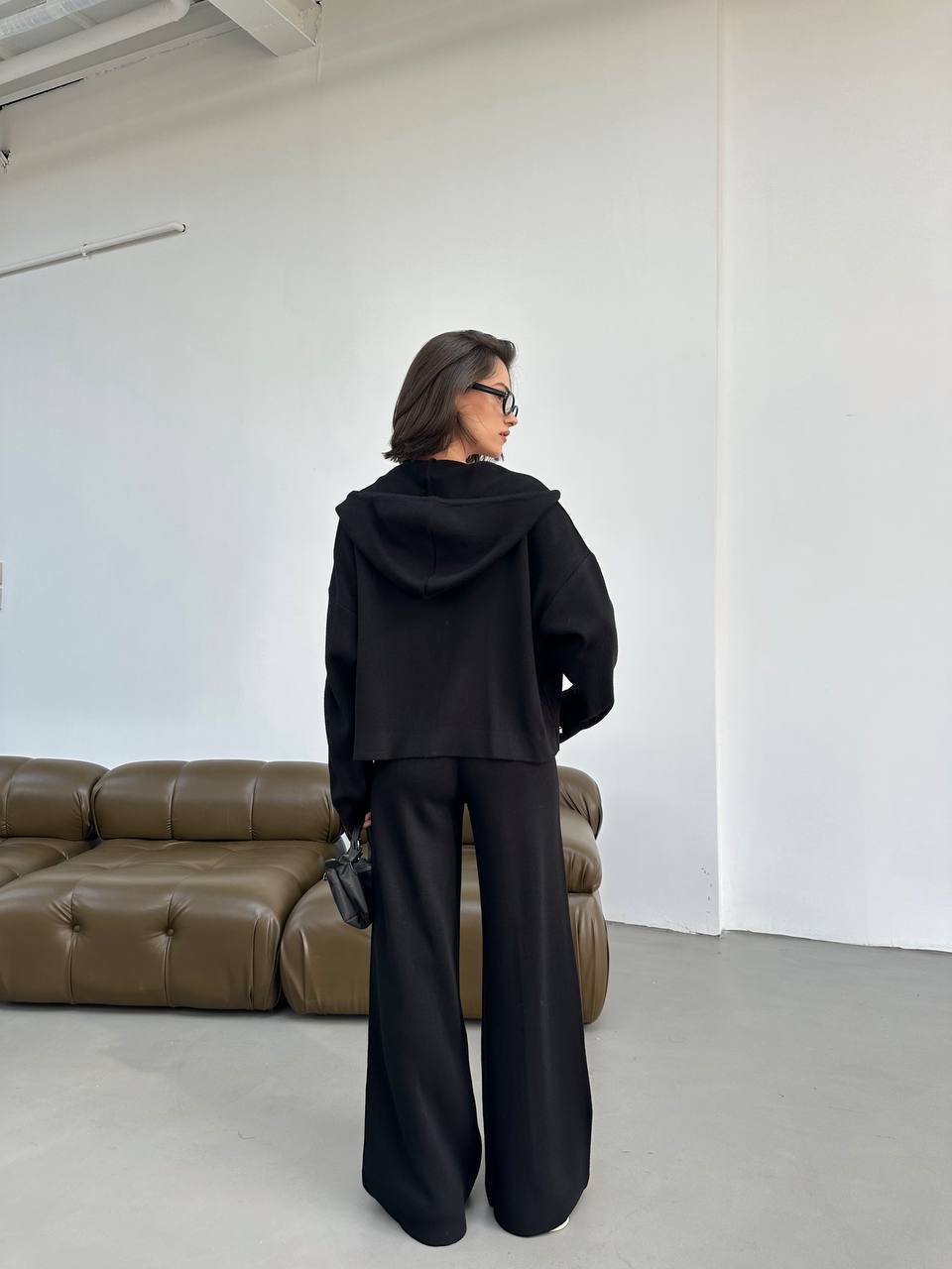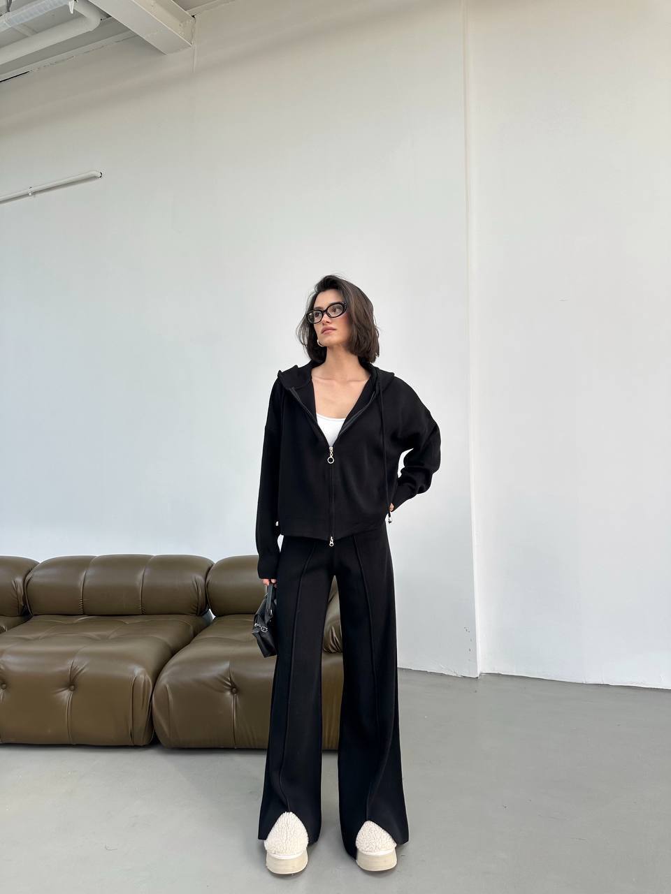Жіночий Базовий Трикотажний Чорний Костюм – Зіп Кофта на Блискавці + Широкі Штани Палаццо