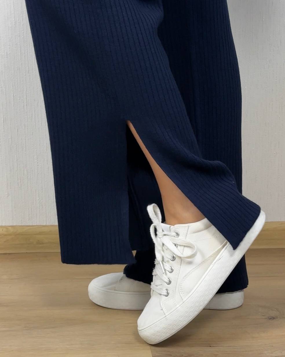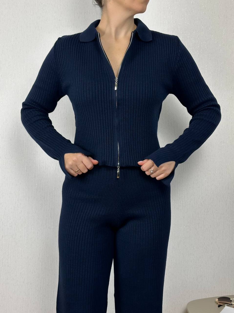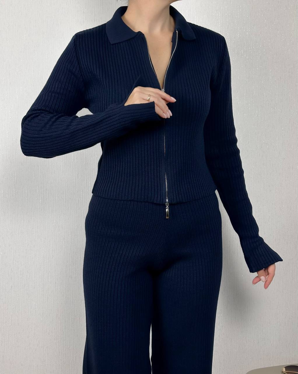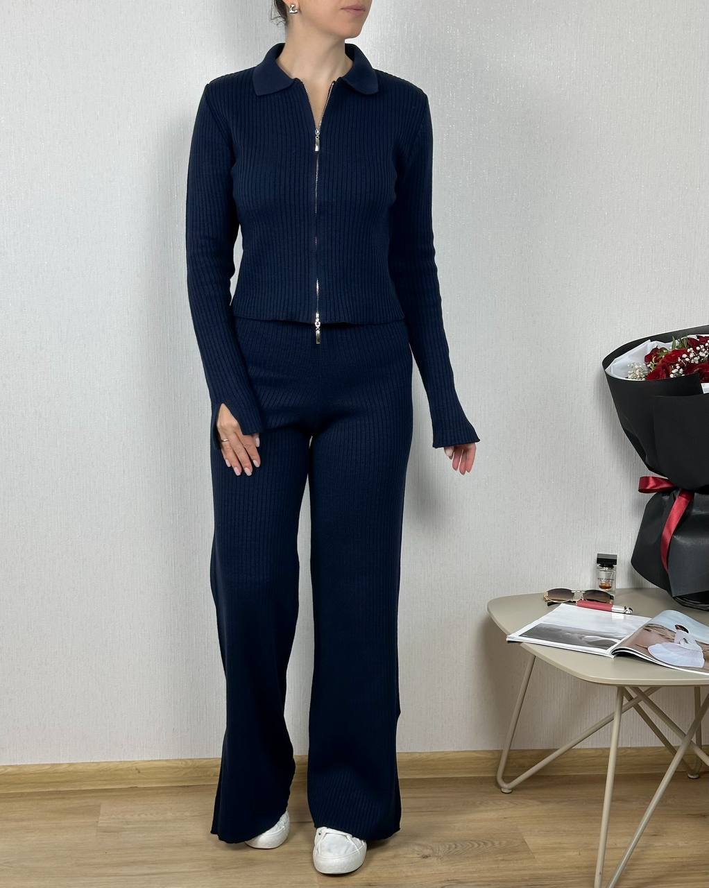 Жіночий Базовий Трикотажний Темно-Синій Костюм у Рубчик з Розрізами – Кофта Поло на Блискавці + Штани Прямого Крою