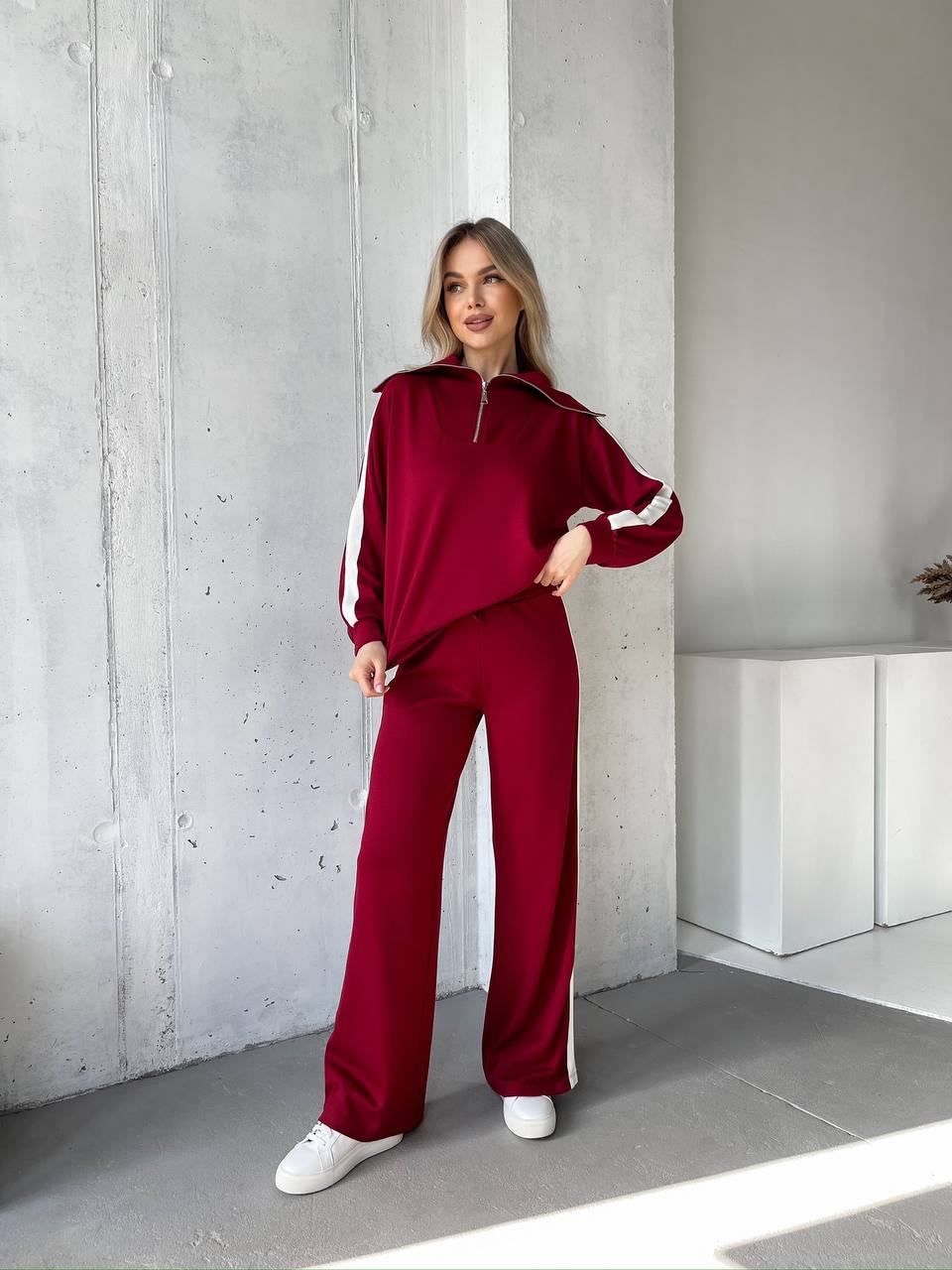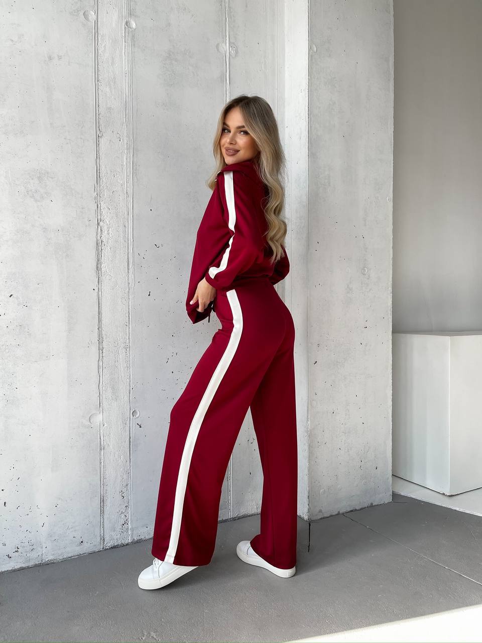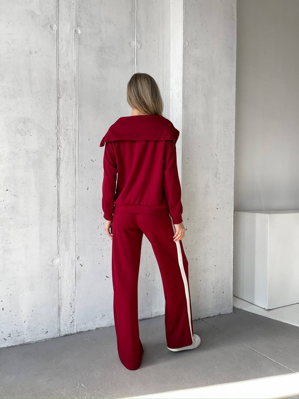 Жіночий Бордовий Трикотажний Костюм з Лампасами – Кофта з Широким Коміром + Штани Палаццо