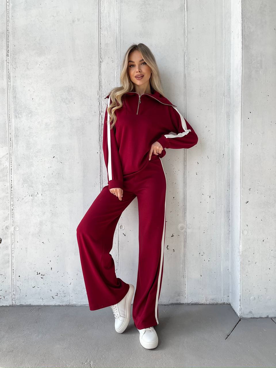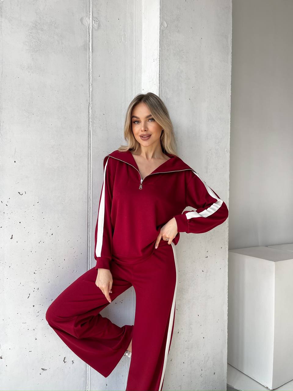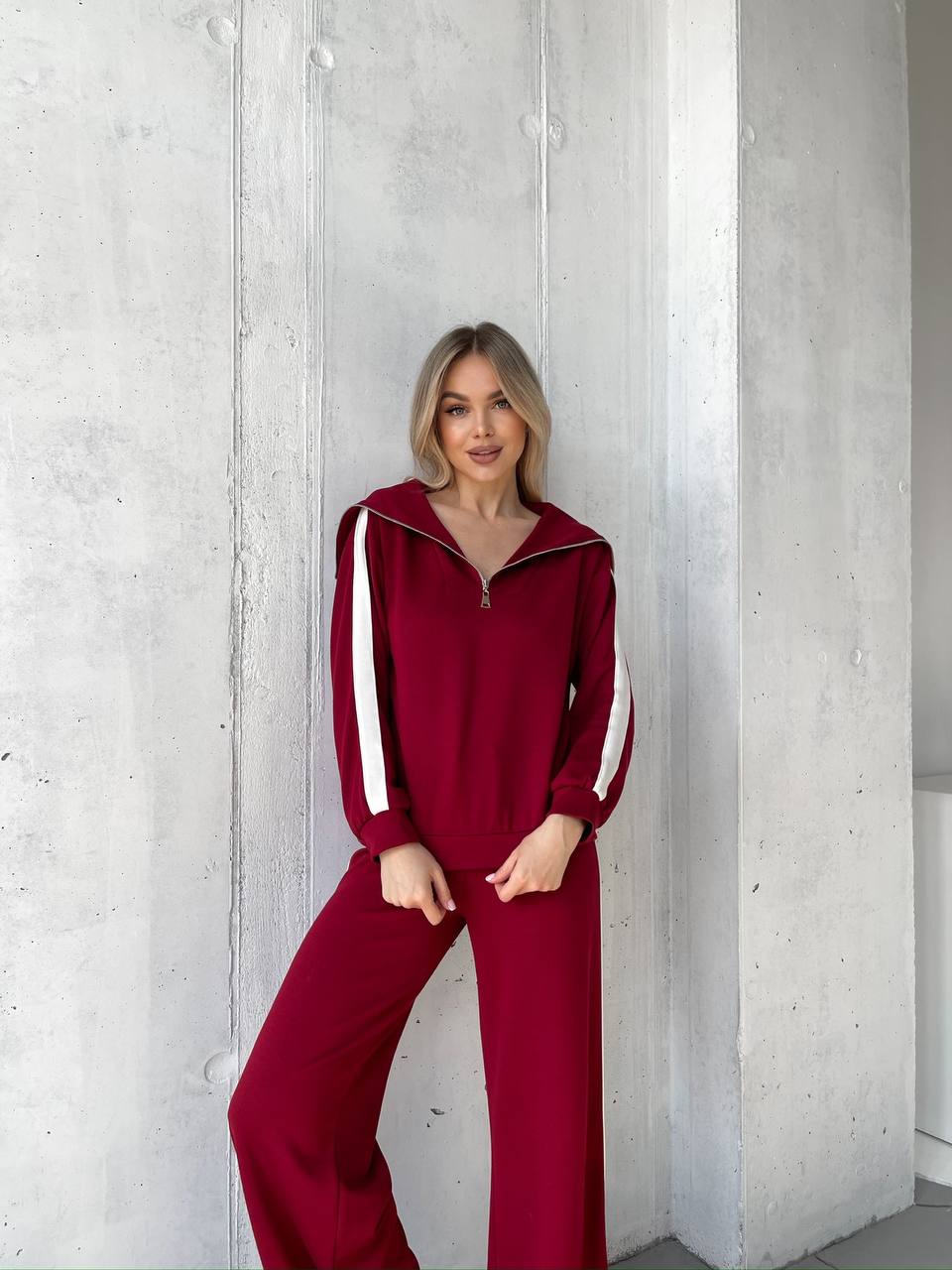 Жіночий Бордовий Трикотажний Костюм з Лампасами – Кофта з Широким Коміром + Штани Палаццо