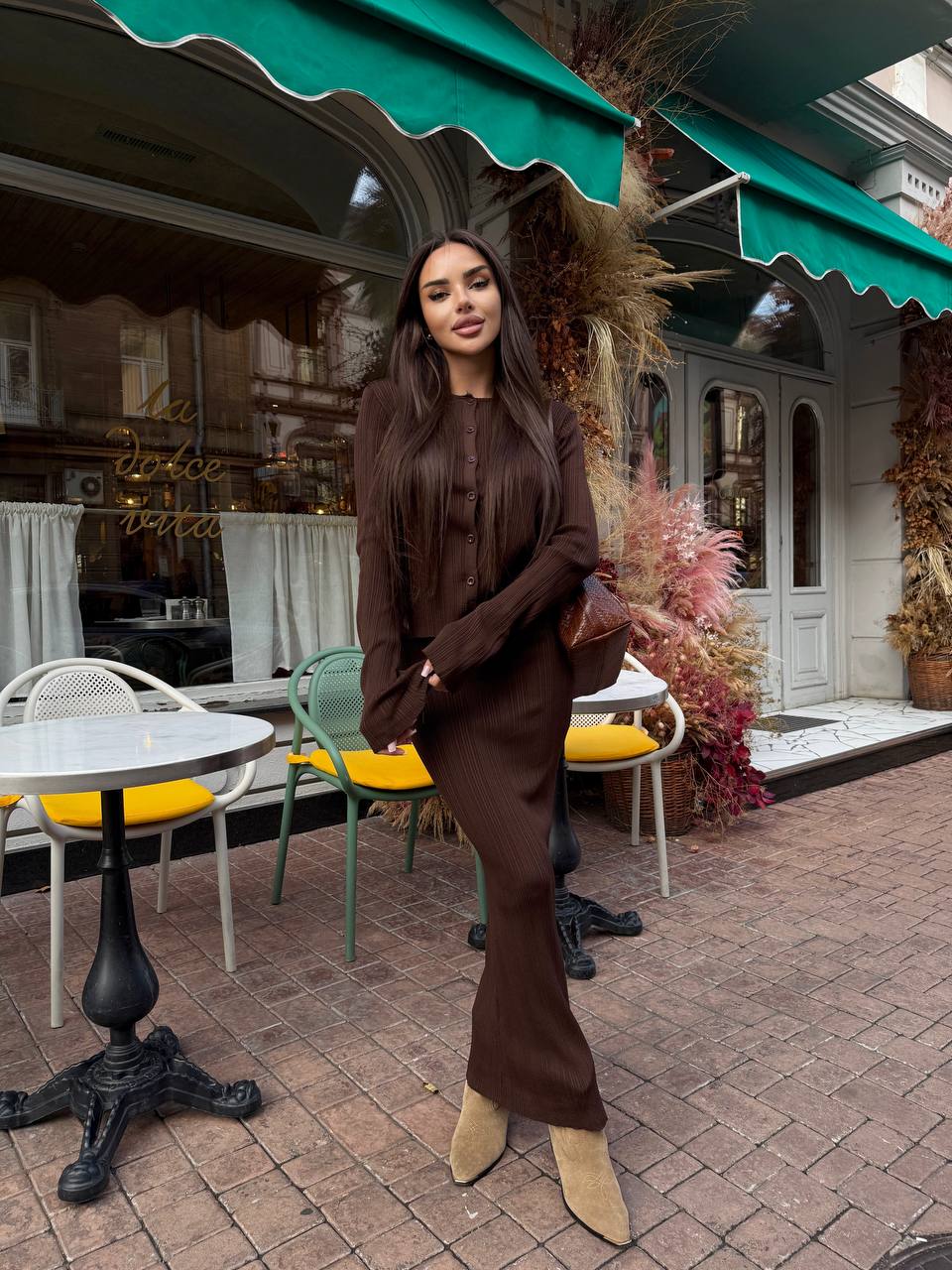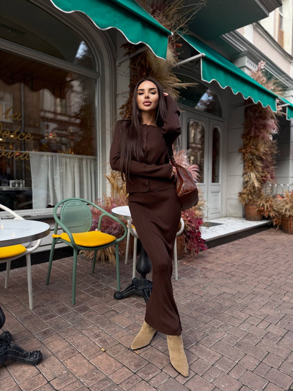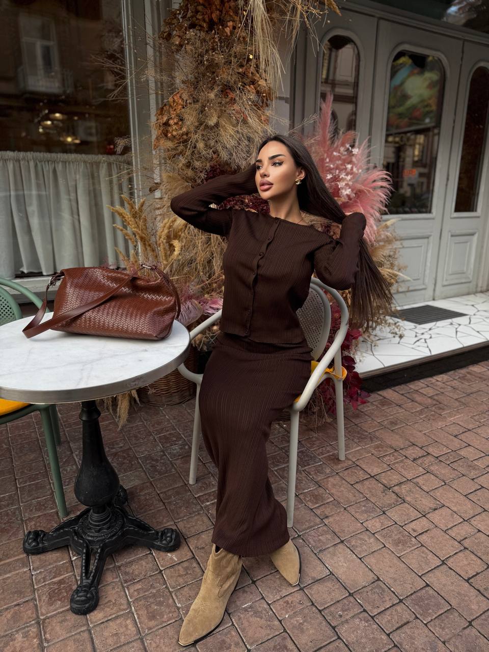 Жіночий Елегантний Коричневий Костюм – Жакет на Ґудзиках + Спідниця Максі