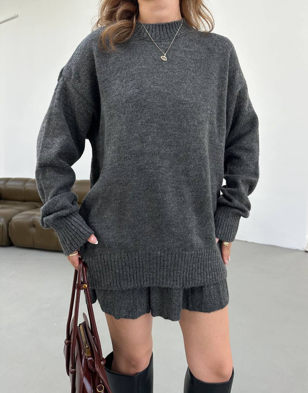 Головна Каталог Жіночий Костюми Casual Жіночий Графітовий Костюм Двійка – Светр Оверсайз + Спідниця Кльош Міні
