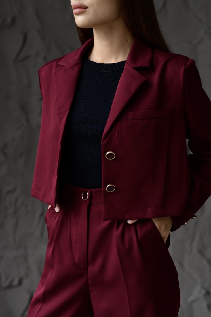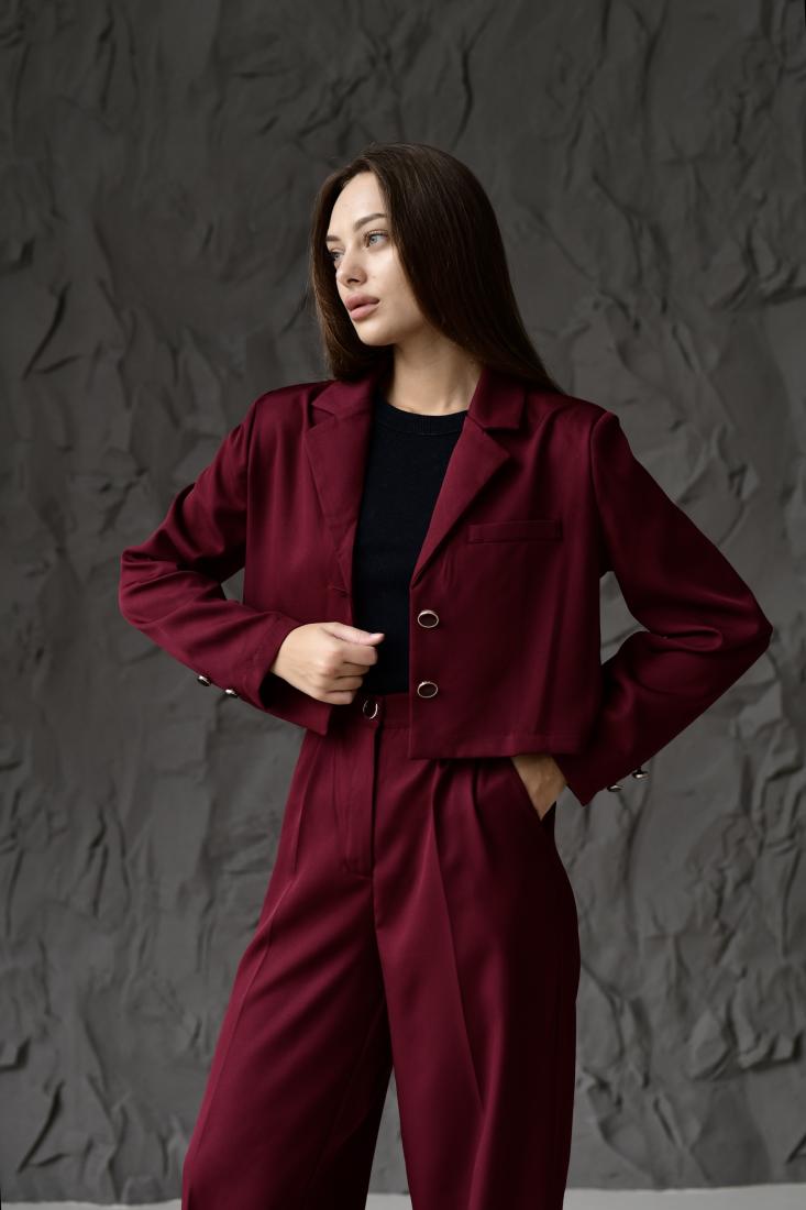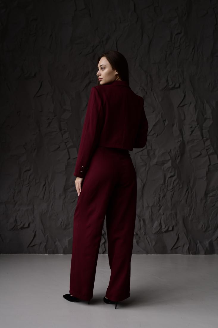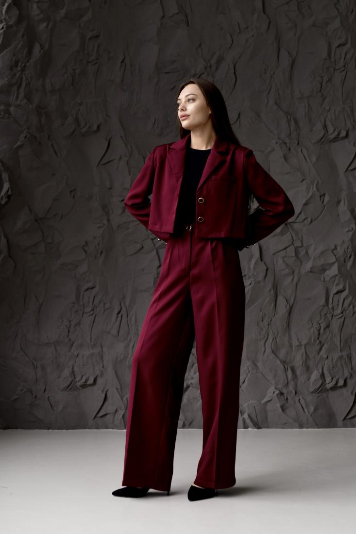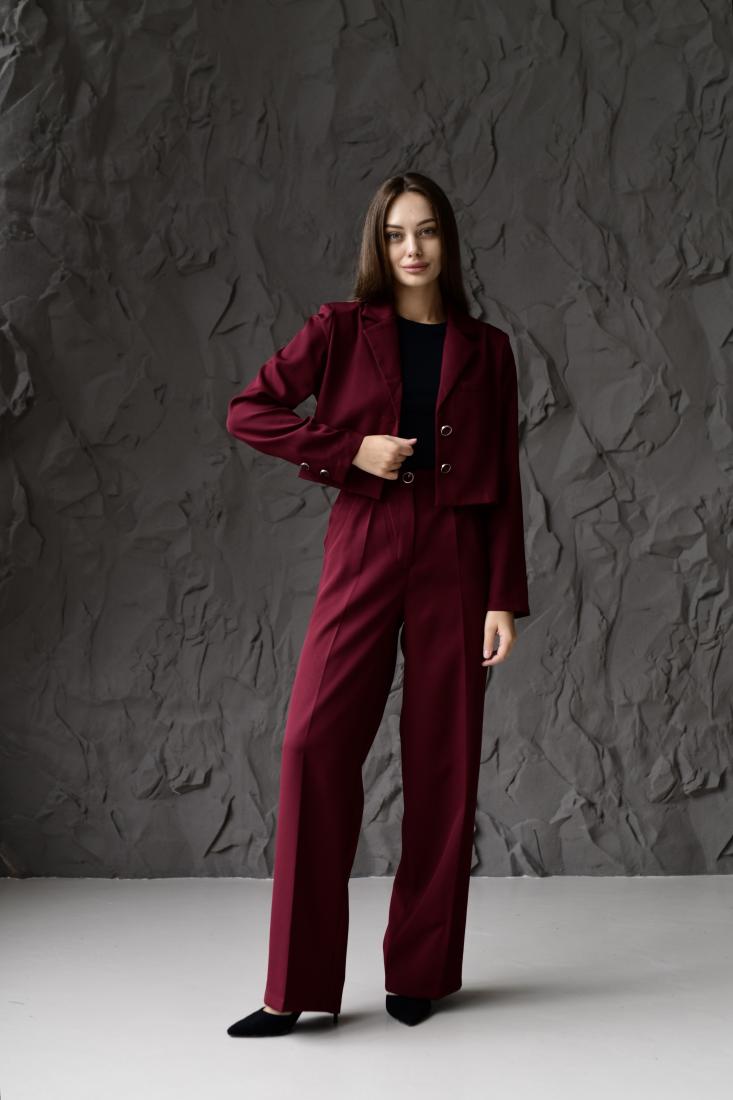 Жіночий Класичний Бордовий Костюм – Укорочений Жакет + Широкі Брюки