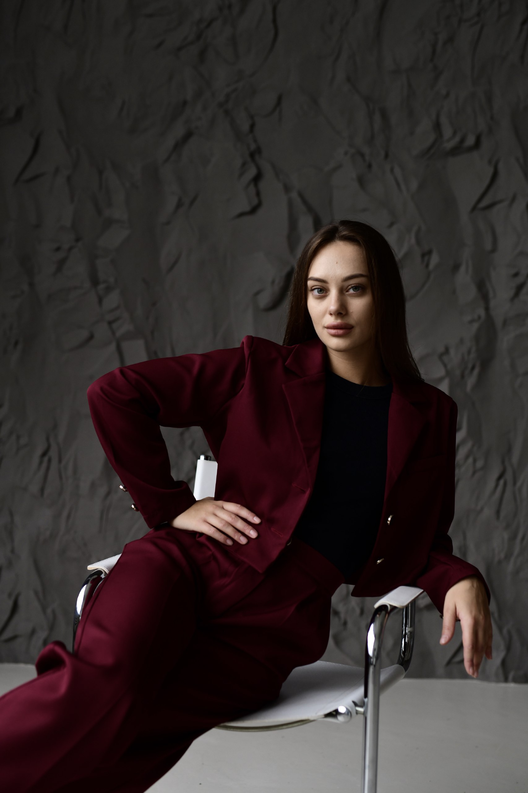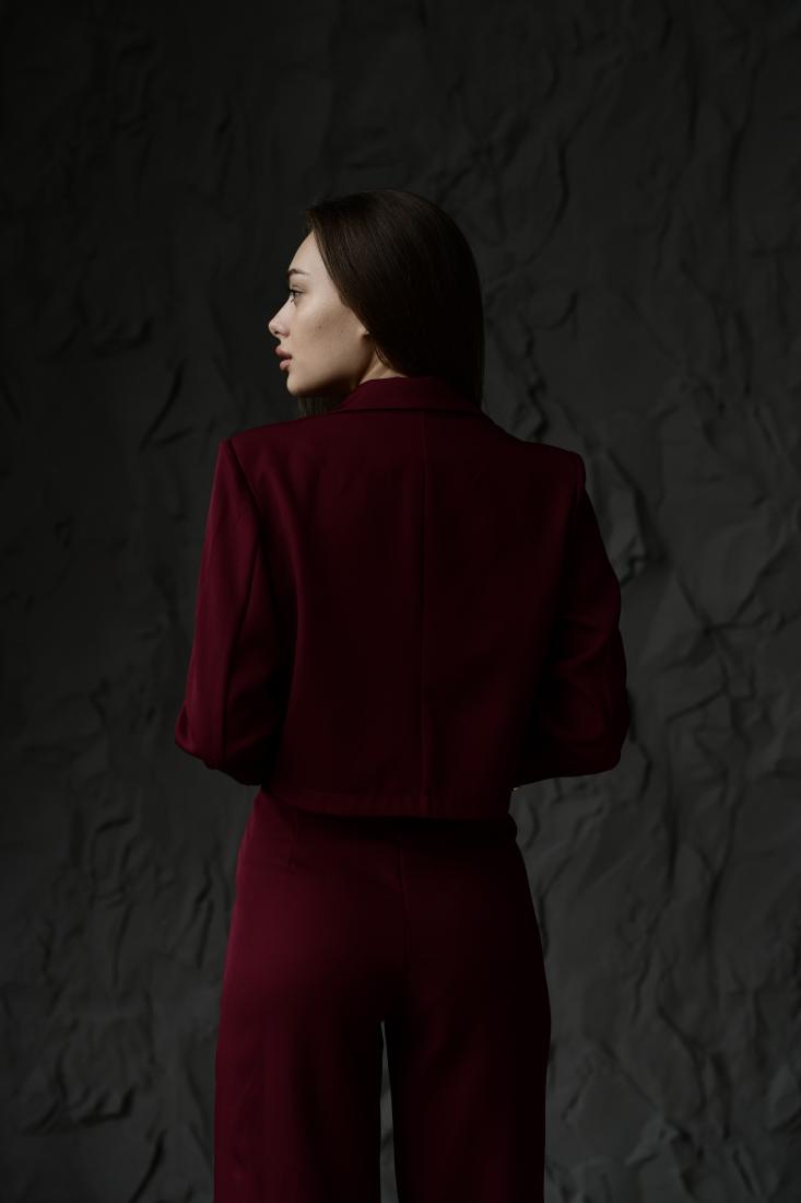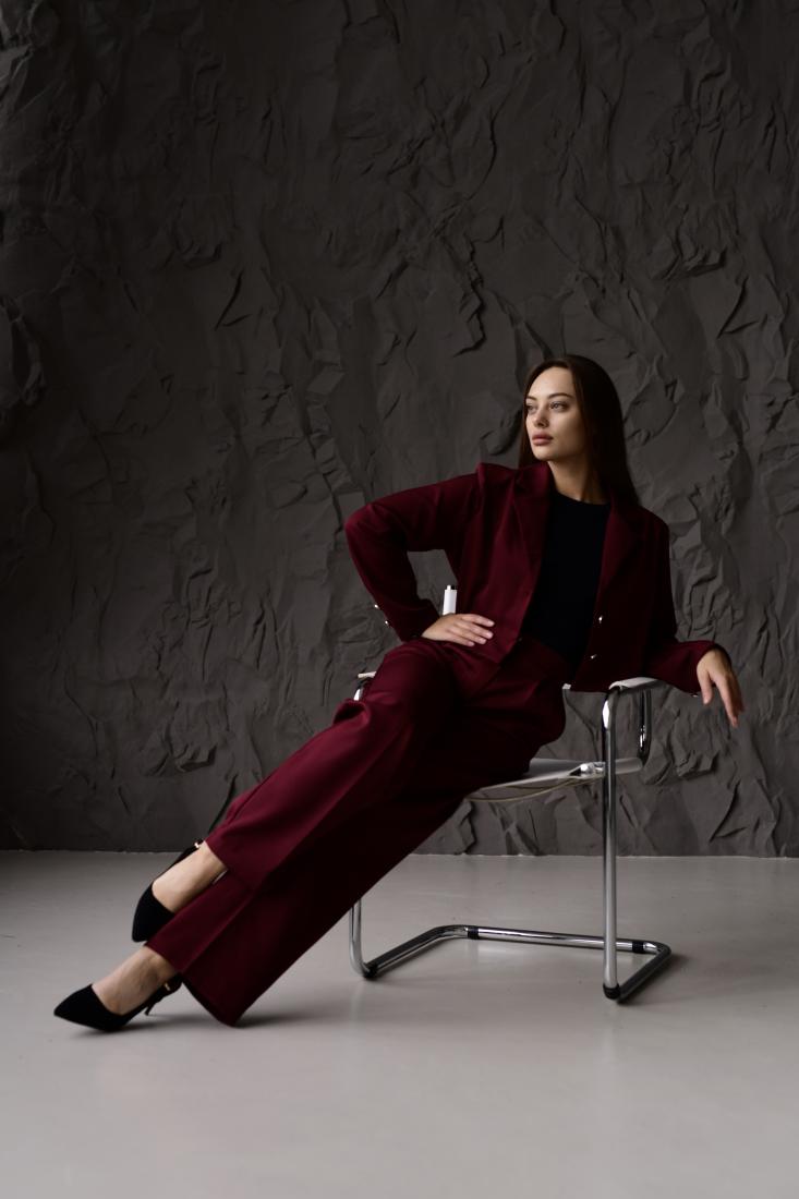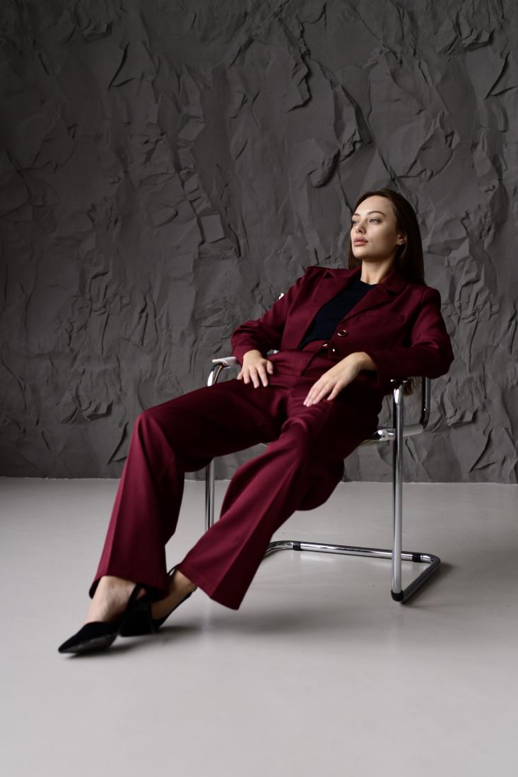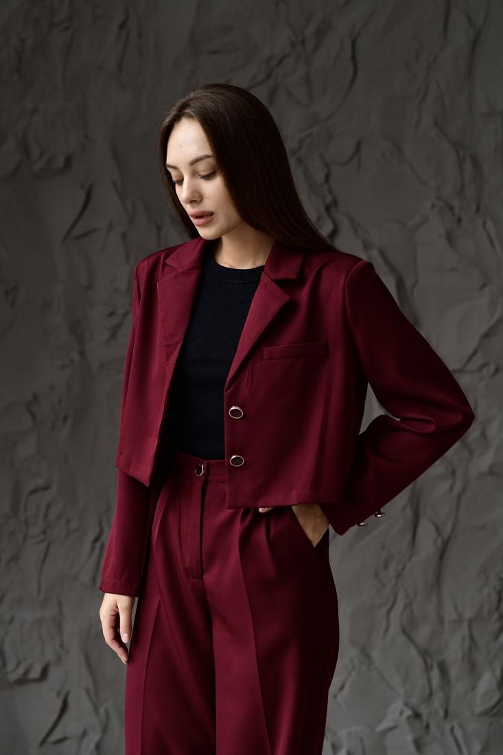 Жіночий Класичний Бордовий Костюм – Укорочений Жакет + Широкі Брюки