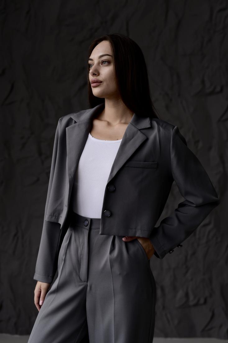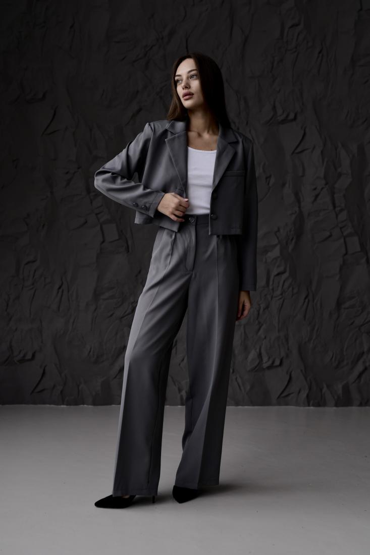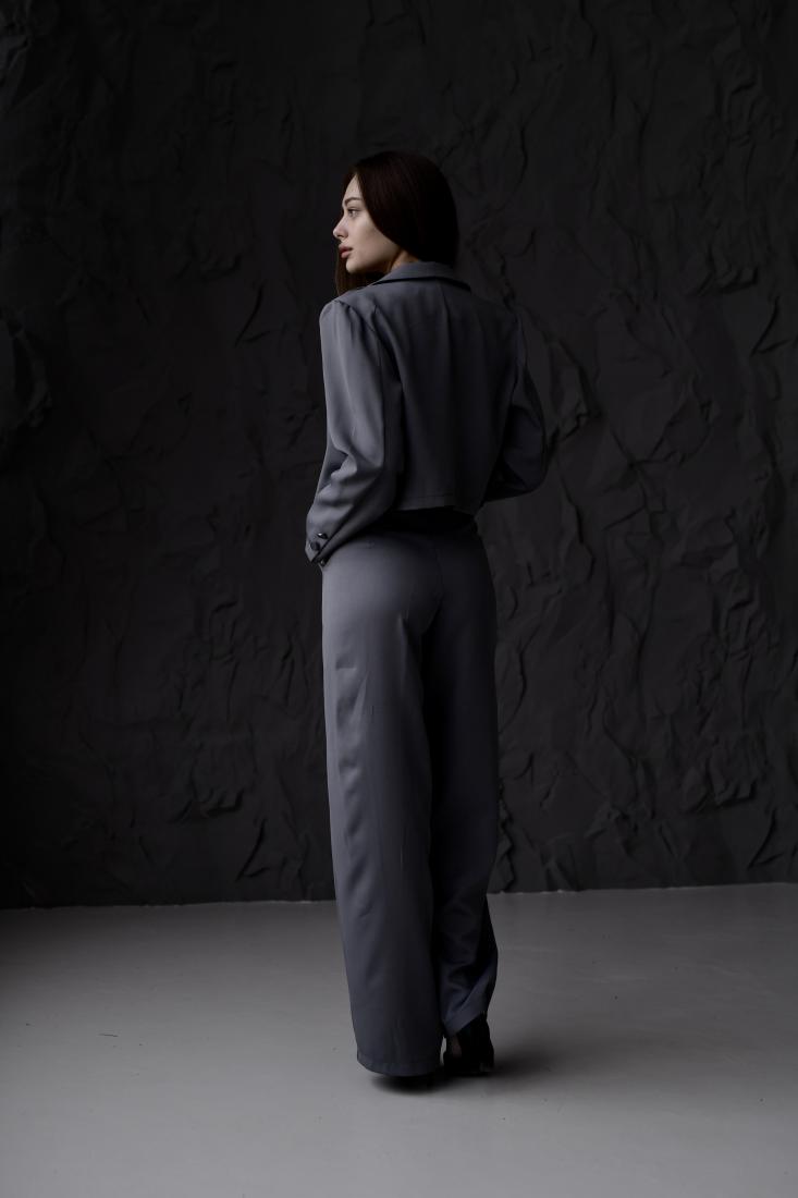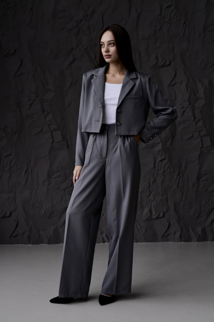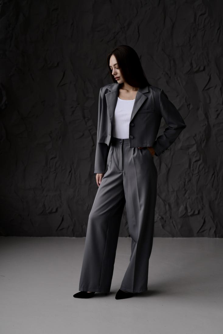 Жіночий Класичний Темно-Сірий Костюм – Укорочений Жакет + Широкі Брюки