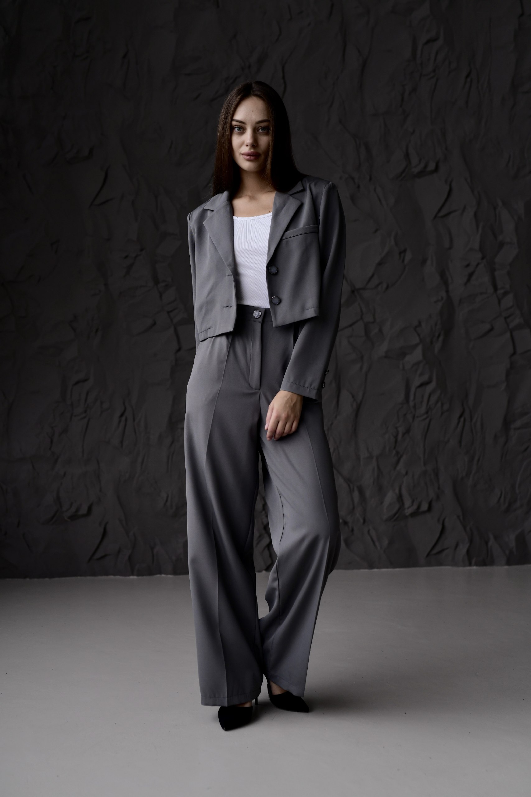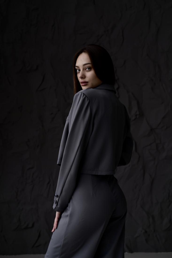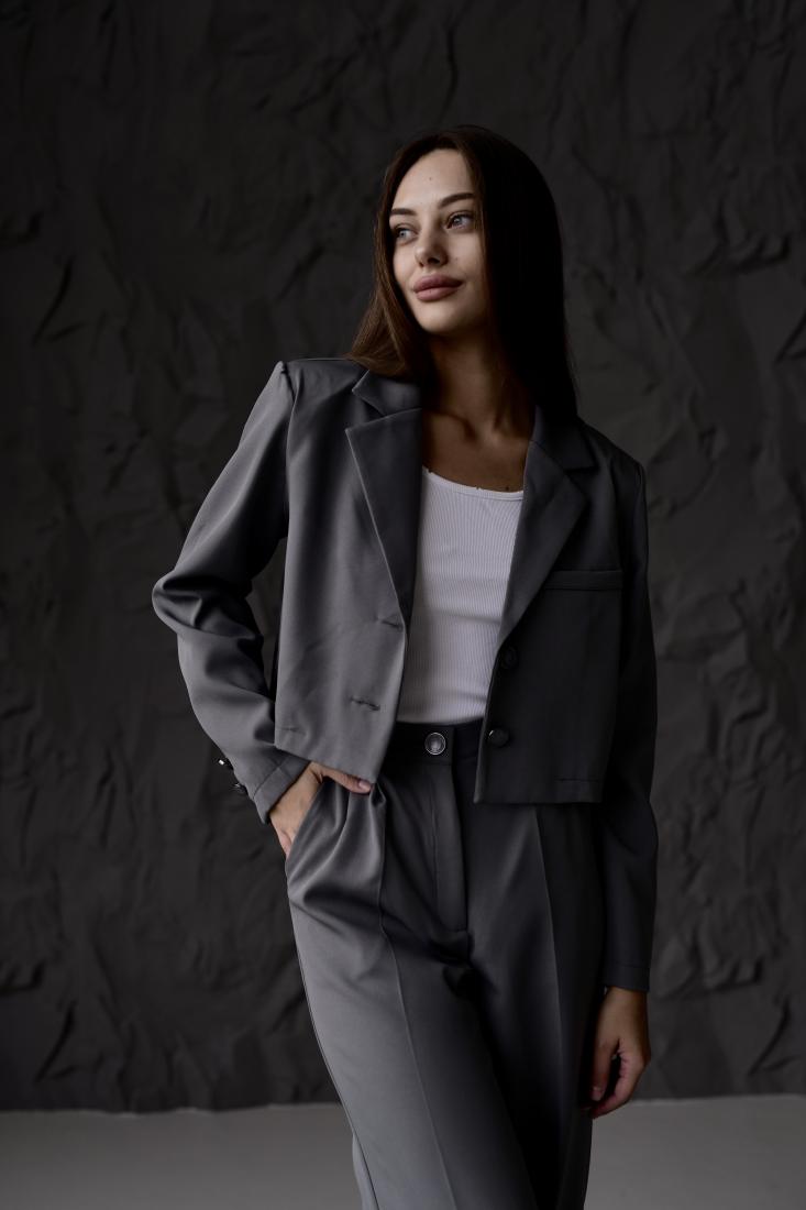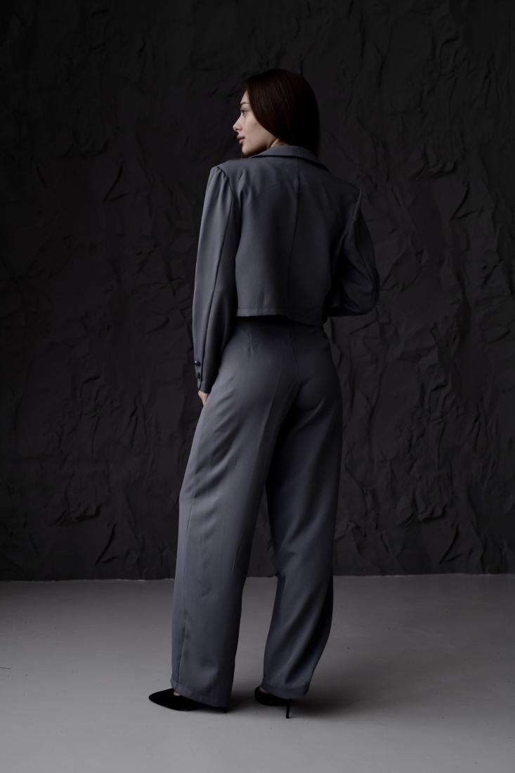 Жіночий Класичний Темно-Сірий Костюм – Укорочений Жакет + Широкі Брюки