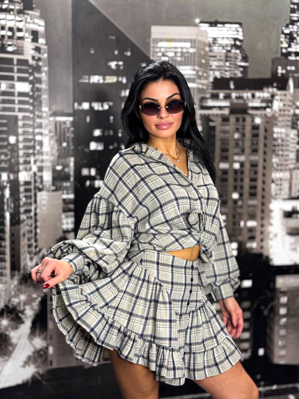 Жіночий Котоновий Сірий Костюм в Клітинку – Сорочка + Спідниця