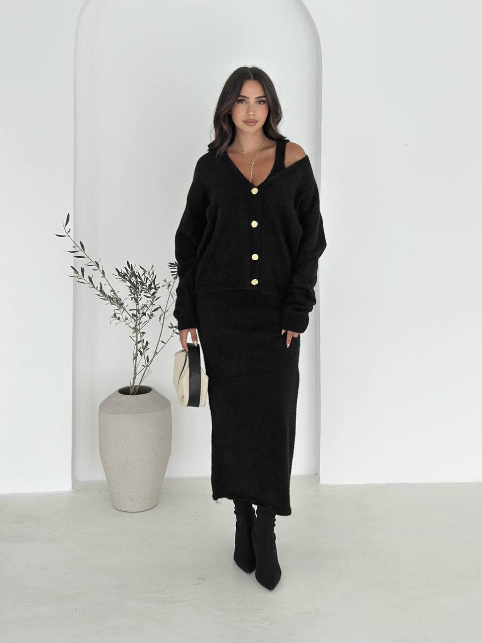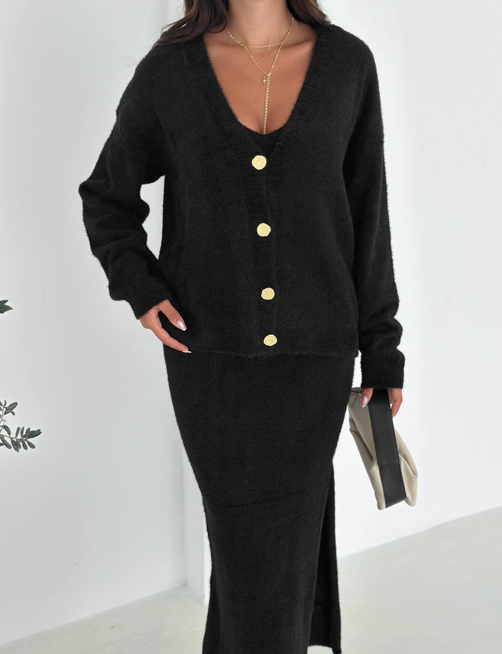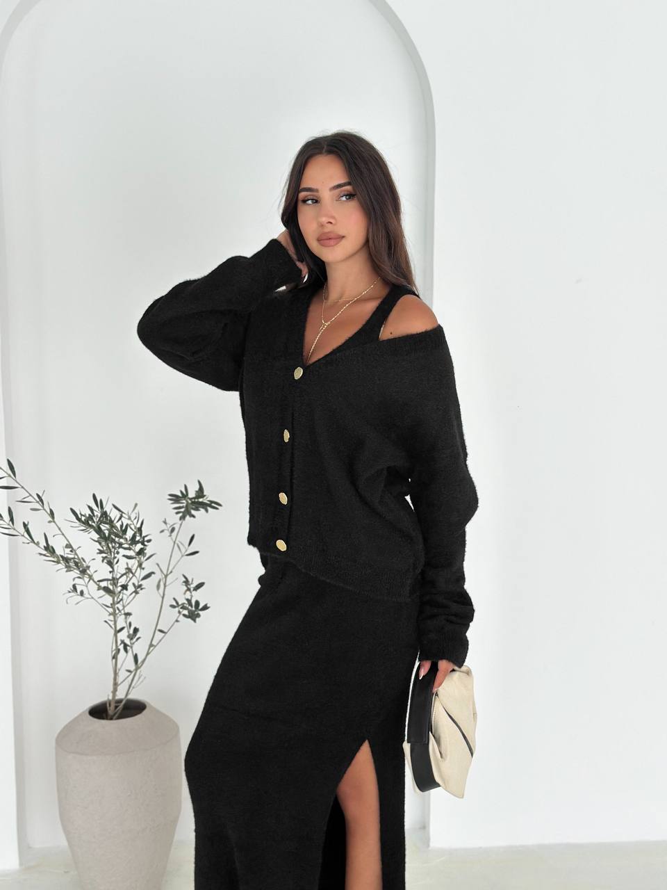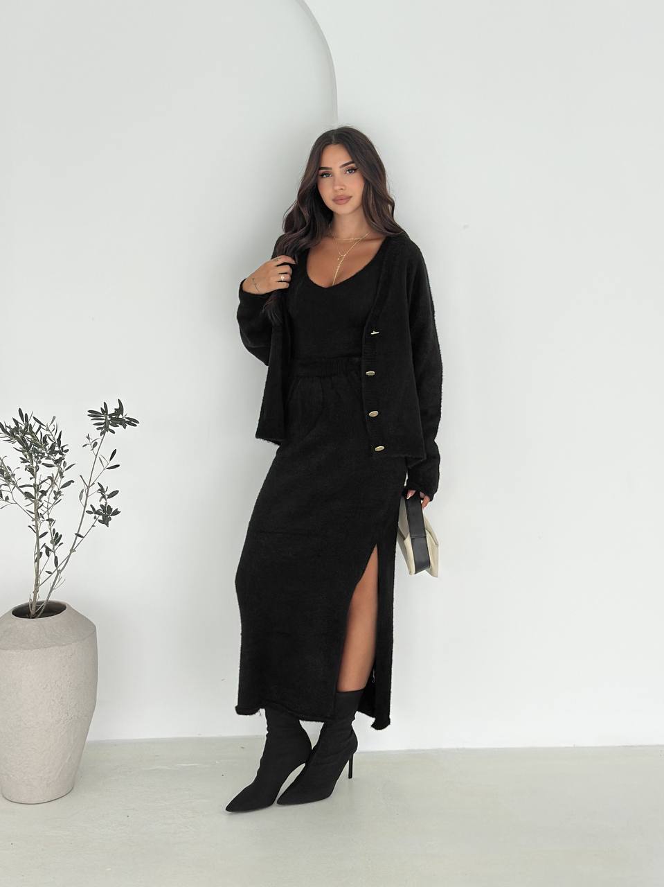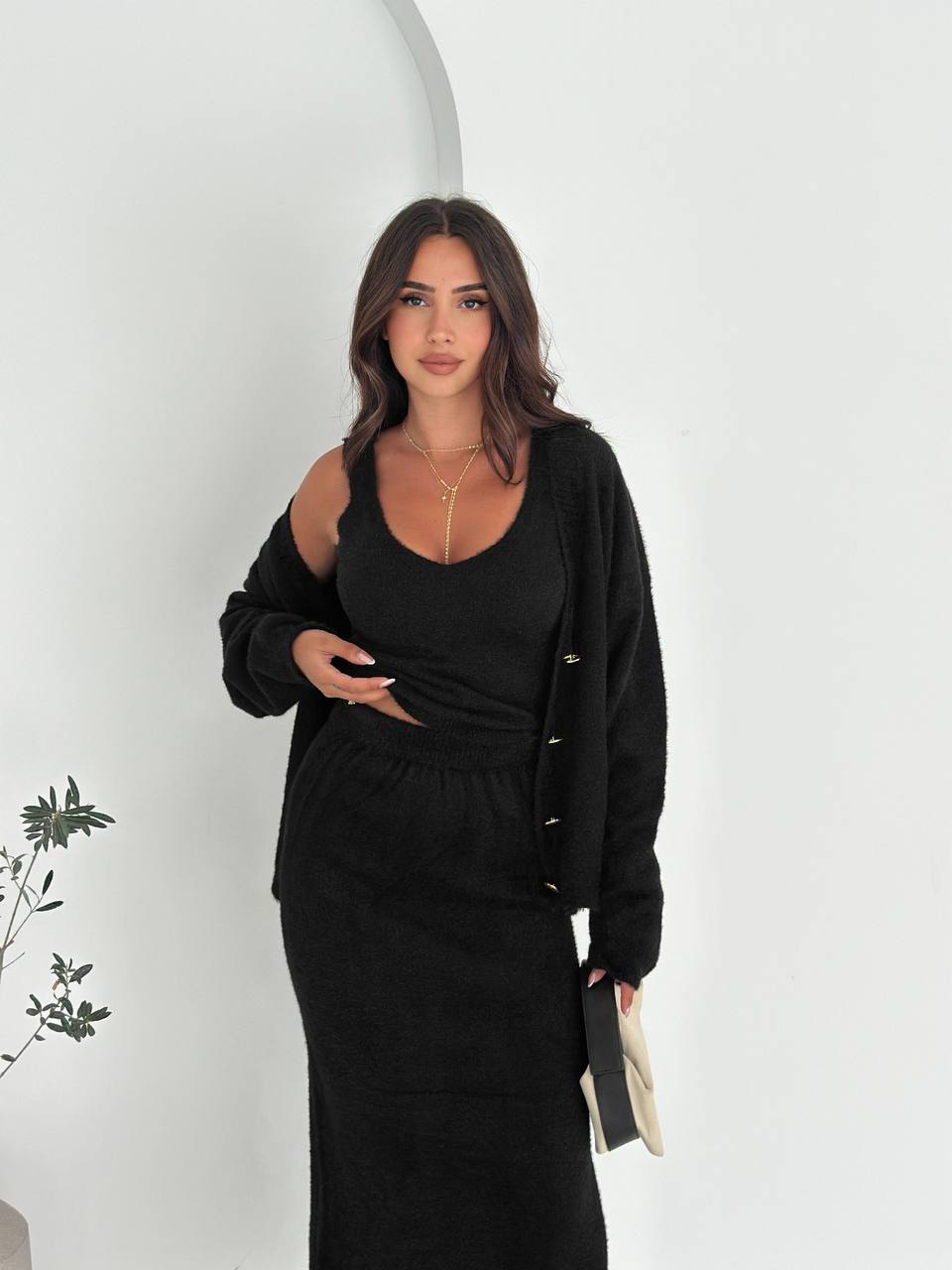 Жіночий М’який Ворсистий Чорний Костюм Трійка – Кардиган + Топ + Спідниця Міді з Розрізом