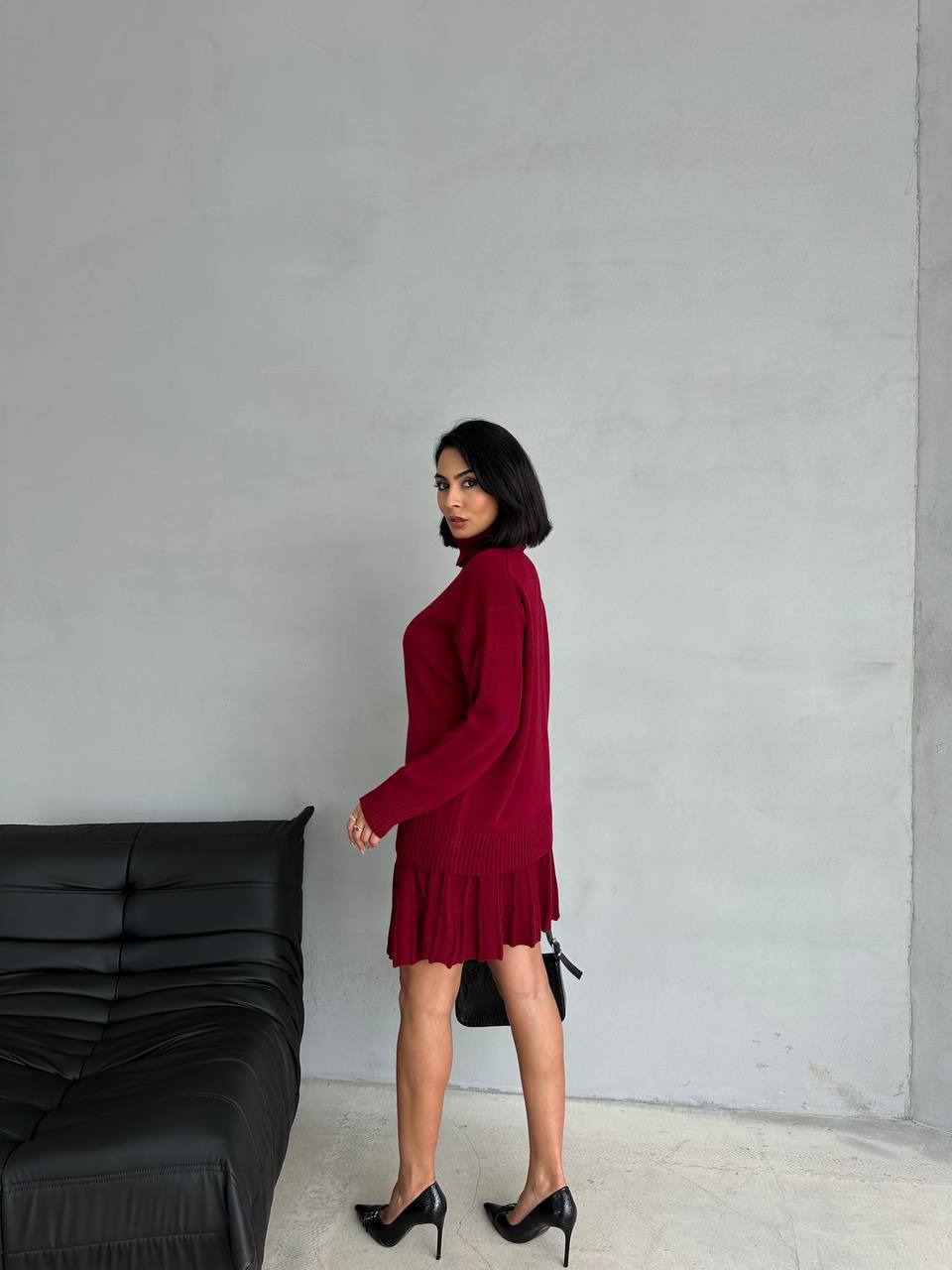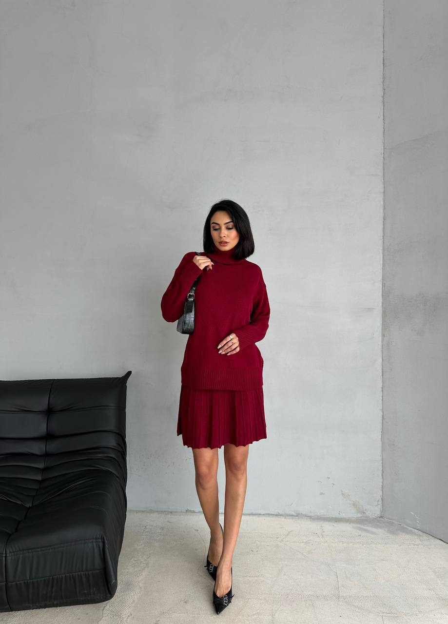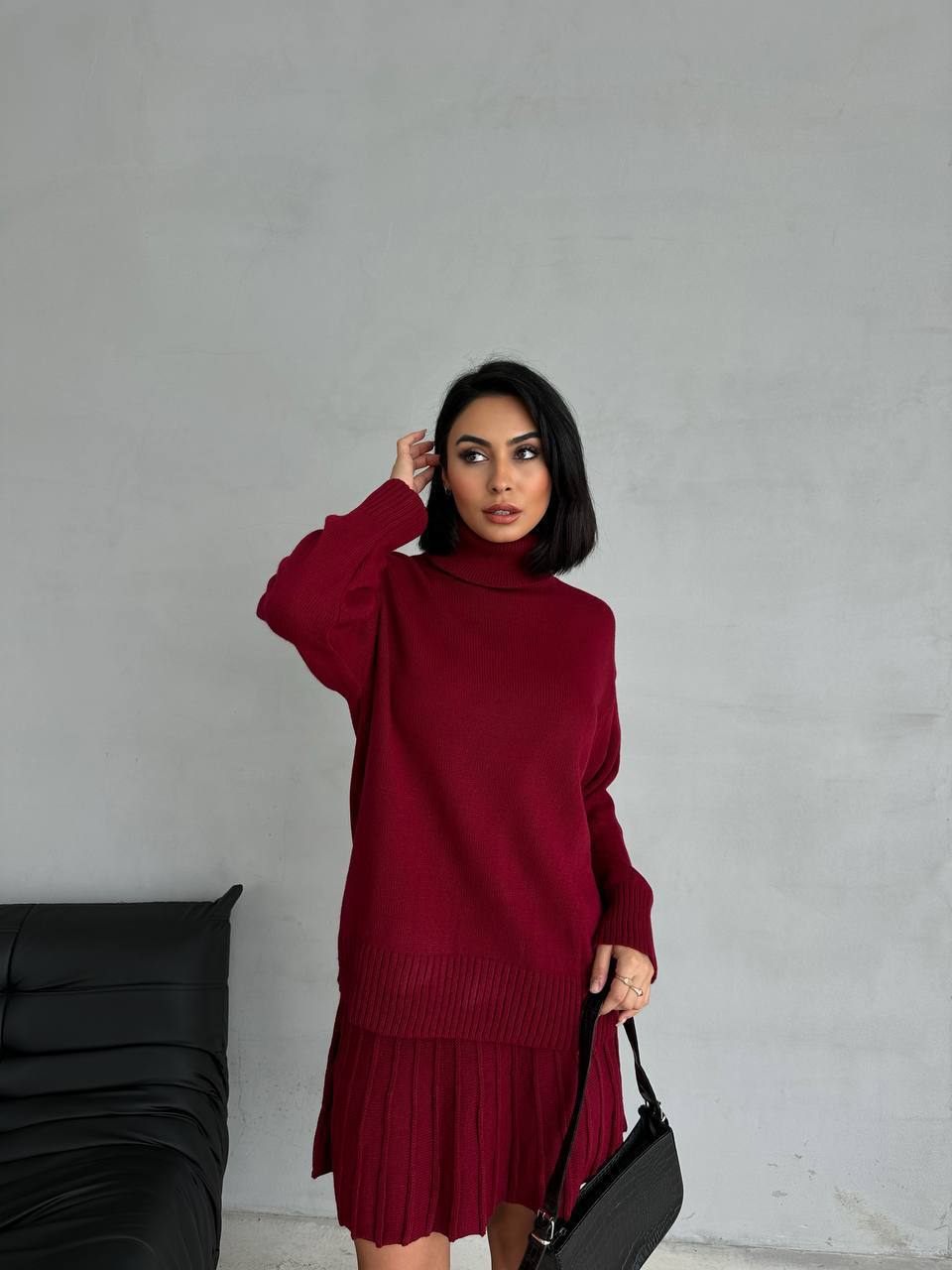 Жіночий Теплий Бордовий Костюм Двійка – Светр з Високим Коміром + Спідниця Міні в Складку