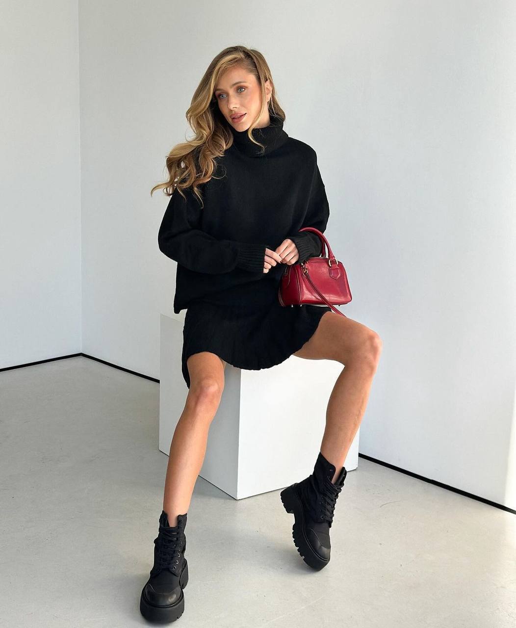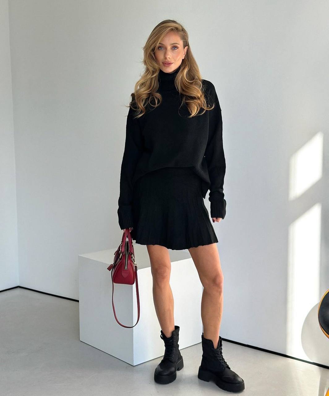 Жіночий Теплий Чорний Костюм Двійка – Светр з Високим Коміром + Спідниця Міні в Складку
