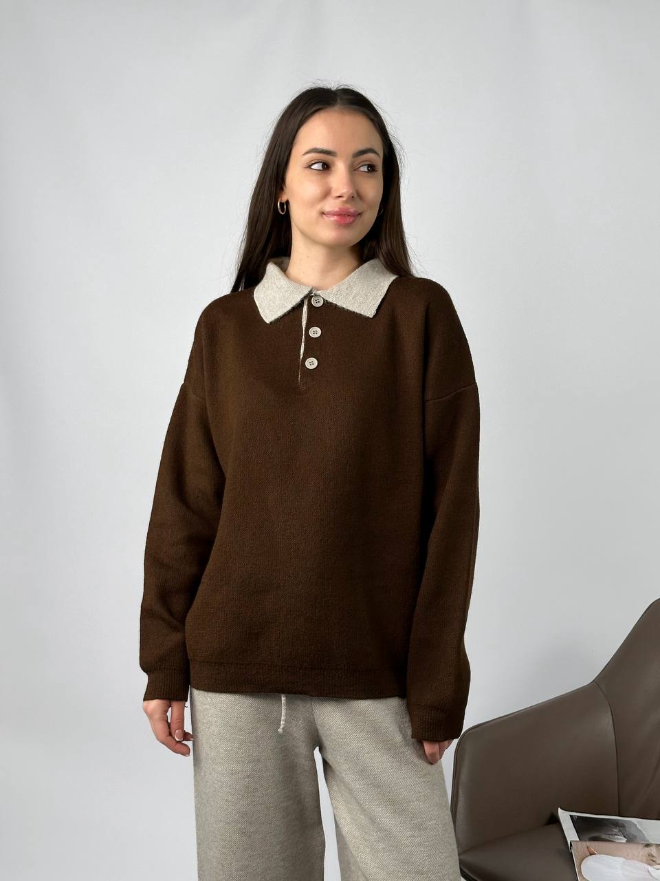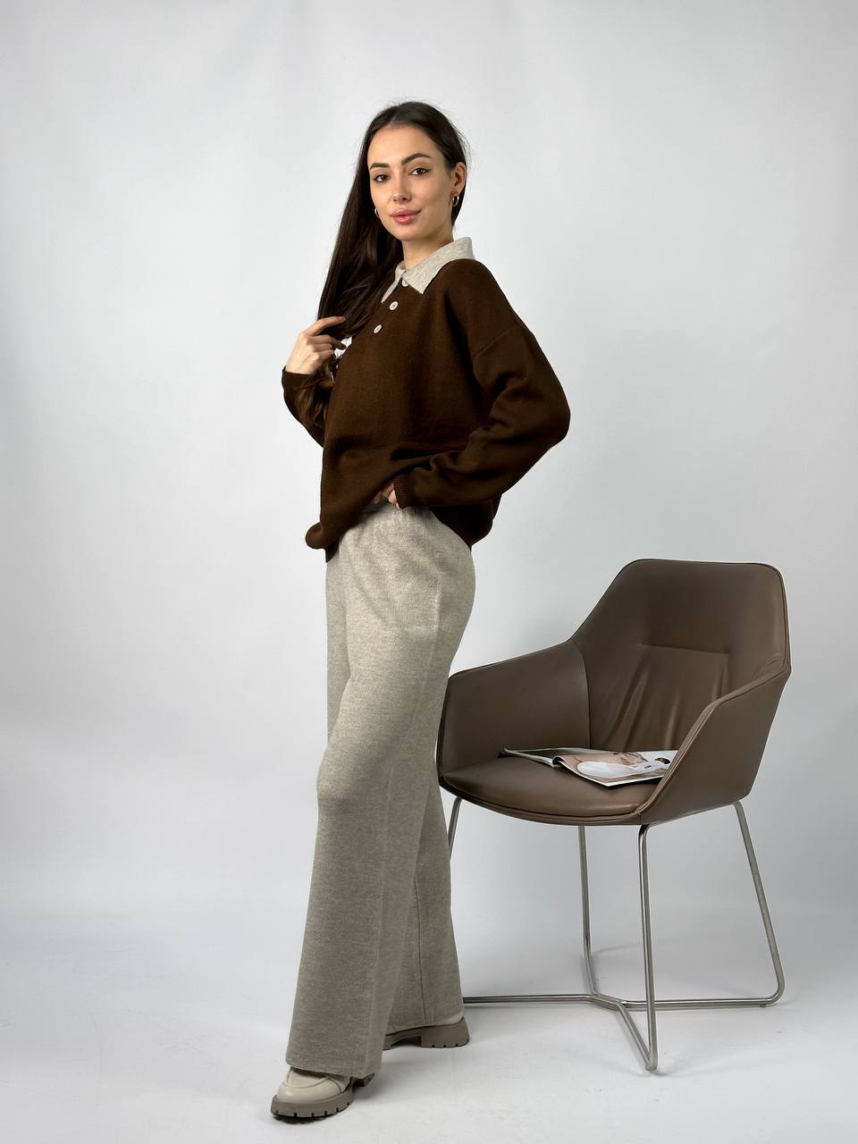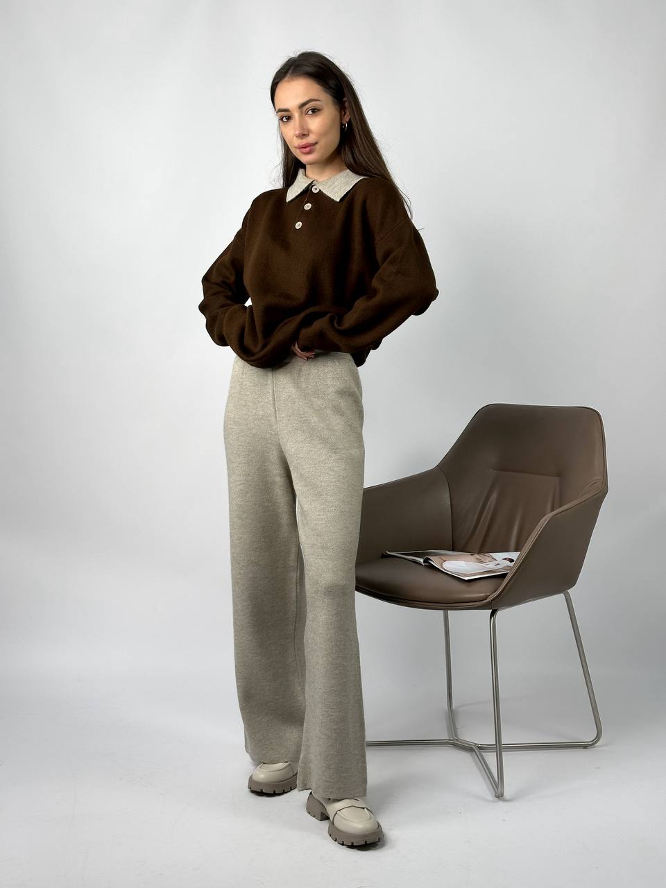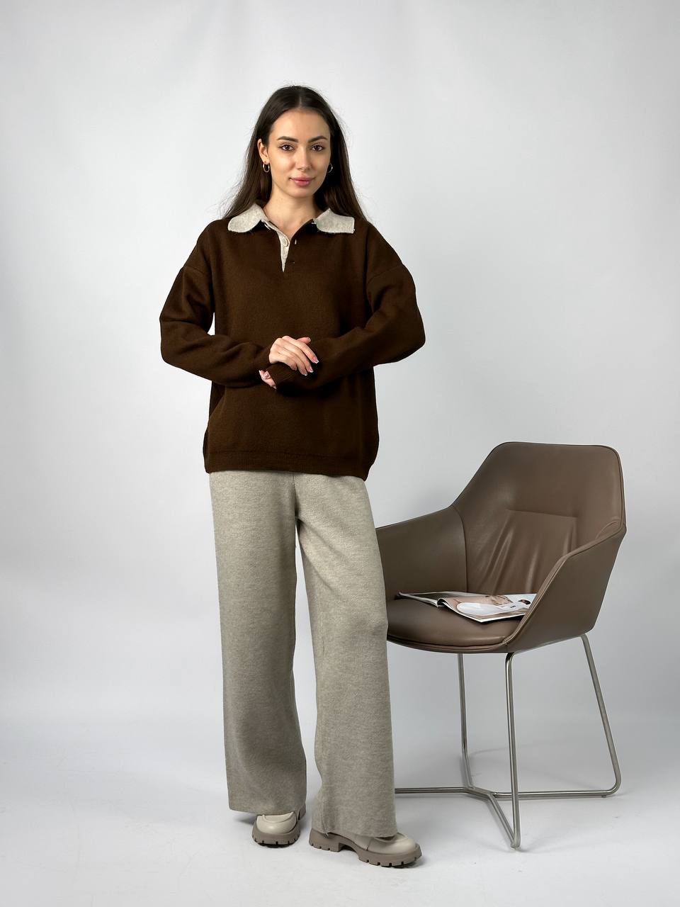 Жіночий Теплий Коричнево-Бежевий Костюм Вільного Крою – Кофта Поло + Широкі Штани
