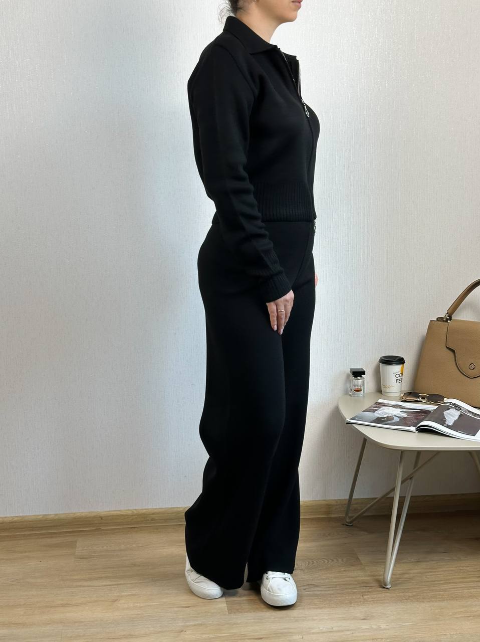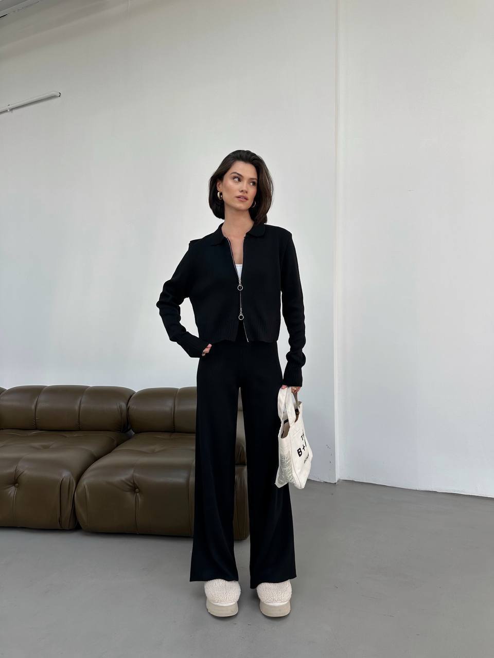 Жіночий Трикотажний Базовий Чорний Костюм – Кофта Поло на Блискавці + Вільні Штани Палаццо