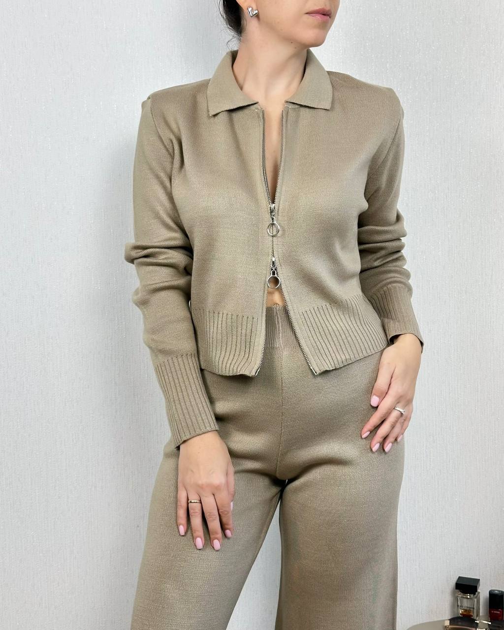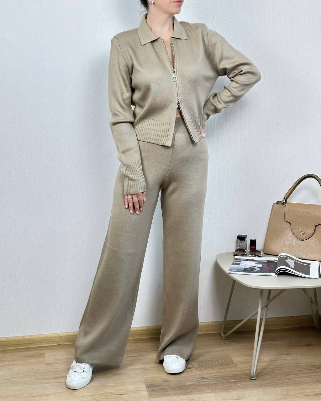 Жіночий Трикотажний Базовий Пісочний Костюм – Кофта Поло на Блискавці + Вільні Штани Палаццо