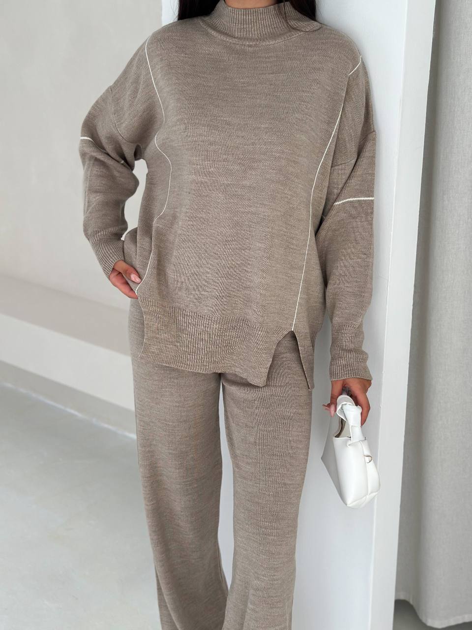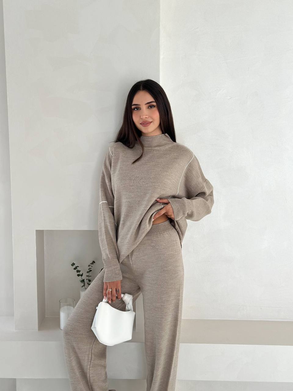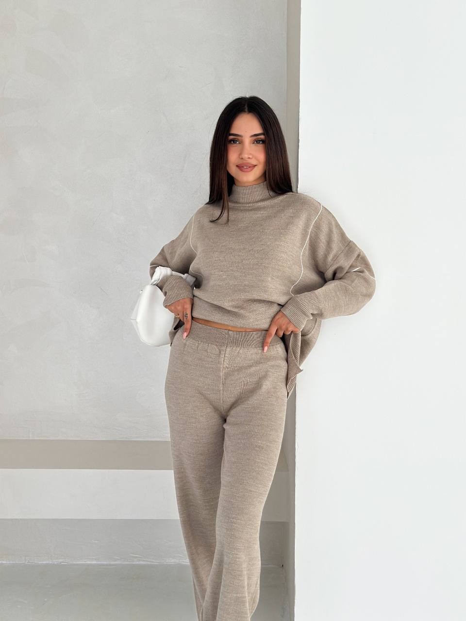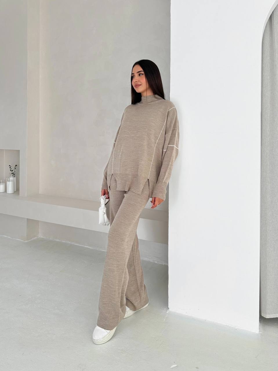 Жіночий Трикотажний Бежевий Костюм Двійка Оверсайз з Кантом – Светр Вільного Крою + Широкі Штани