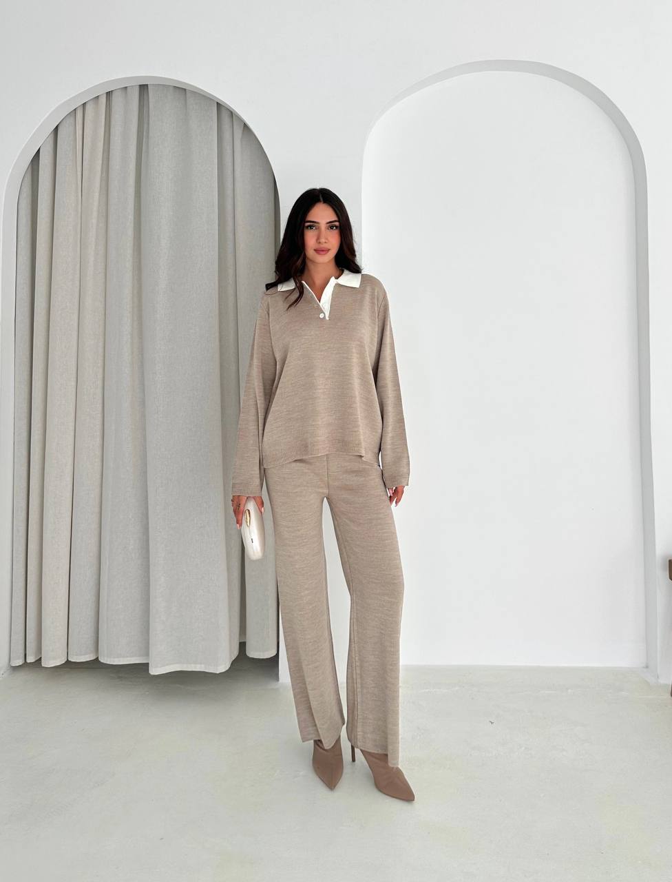 Жіночий Трикотажний Бежевий Костюм з Контрастним Коміром – Светр Оверсайз + Широкі Штани