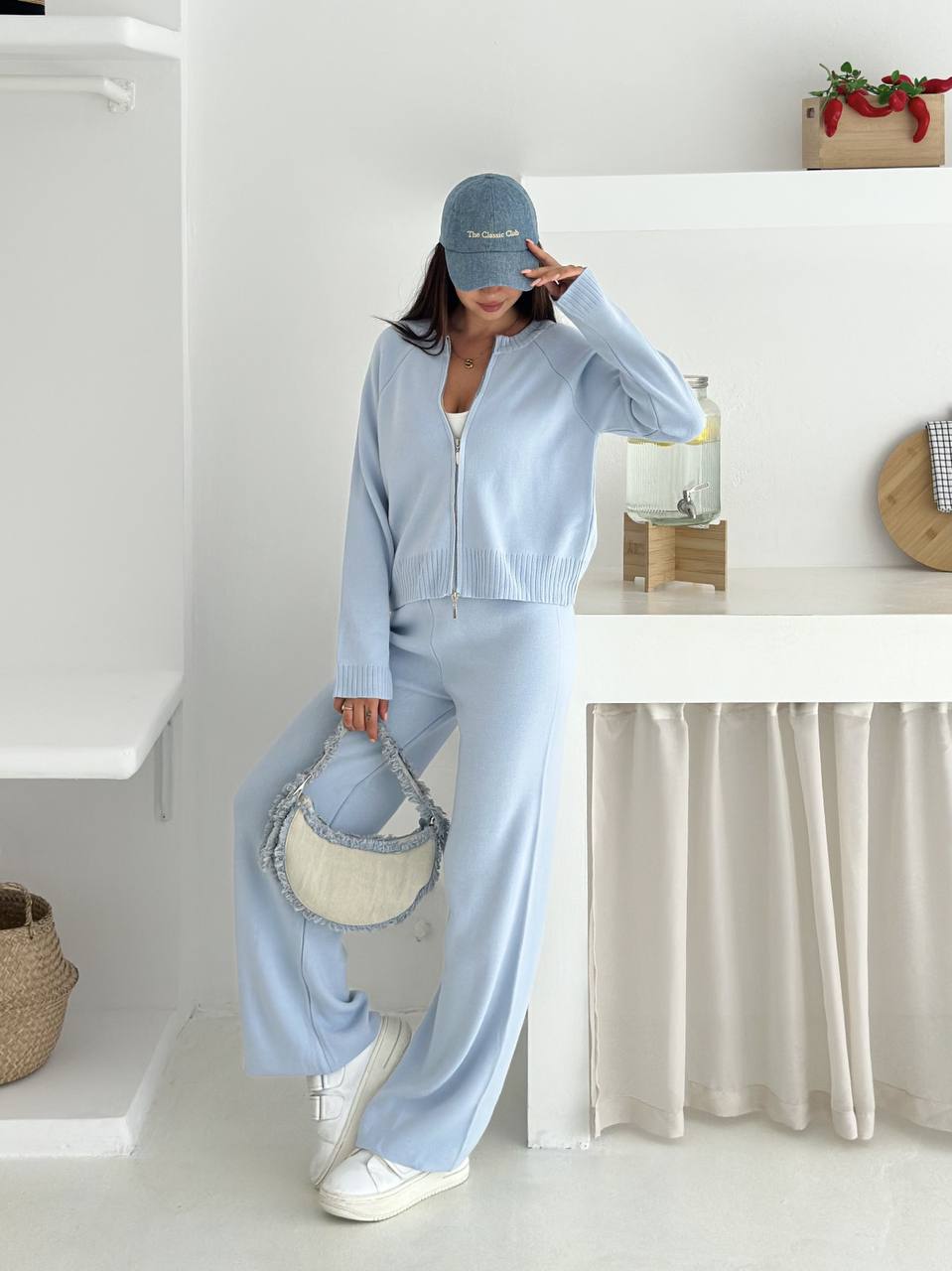 Жіночий Трикотажний Блакитний Костюм Двійка – Джемпер на Блискавці + Штани Палаццо