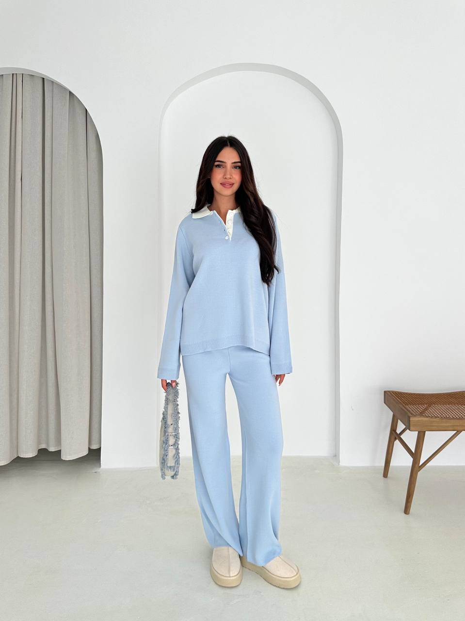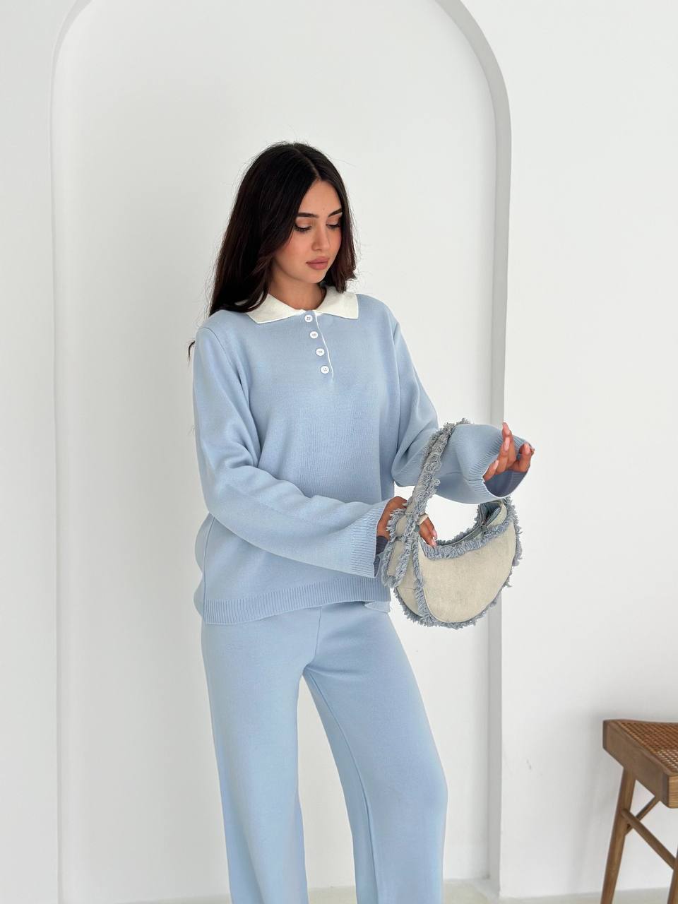 Жіночий Трикотажний Блакитний Костюм з Контрастним Коміром – Светр Оверсайз + Широкі Штани