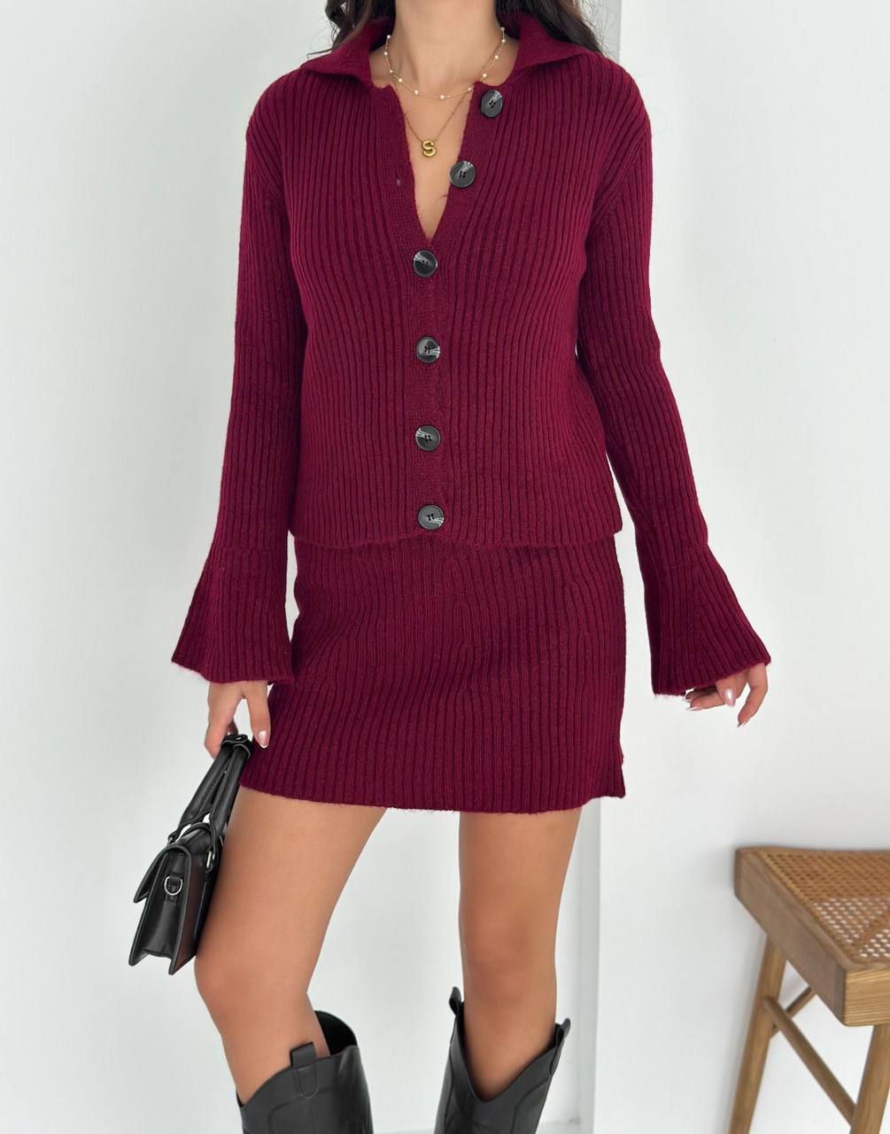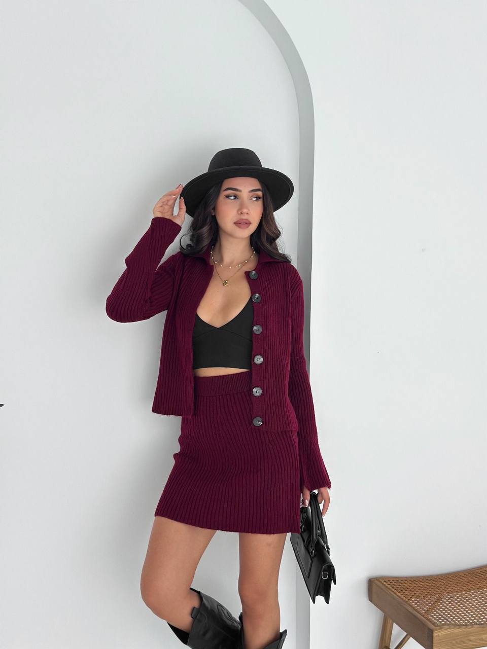 Жіночий Трикотажний Бордовий Костюм Двійка в Рубчик – Жакет з Коміром + Спідниця Міні