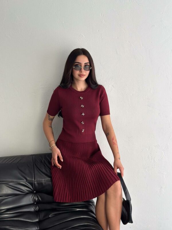 Жіночий Трикотажний Бордовий Костюм – Футболка з Бантиками + Спідниця Трапеція Міні Плісе