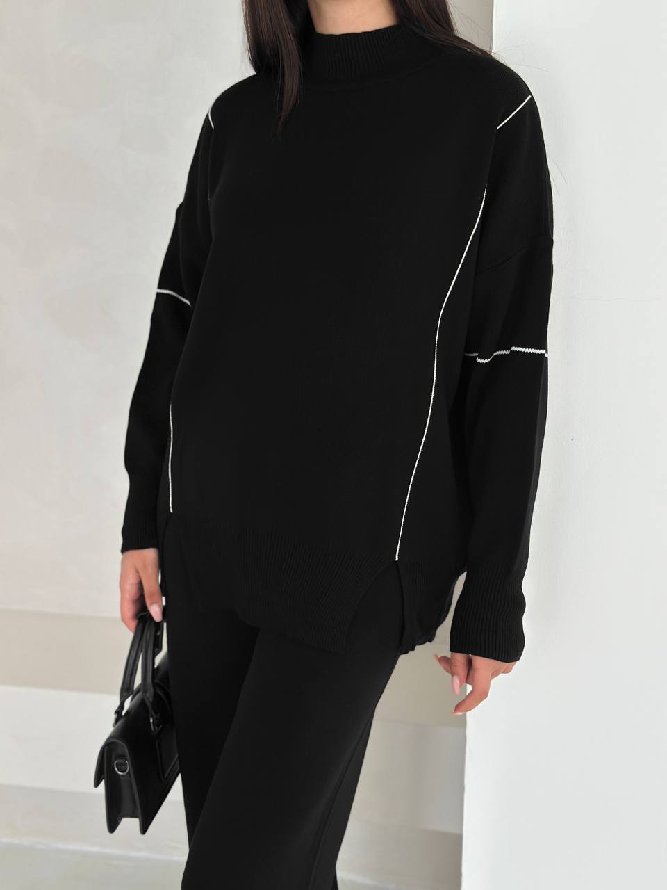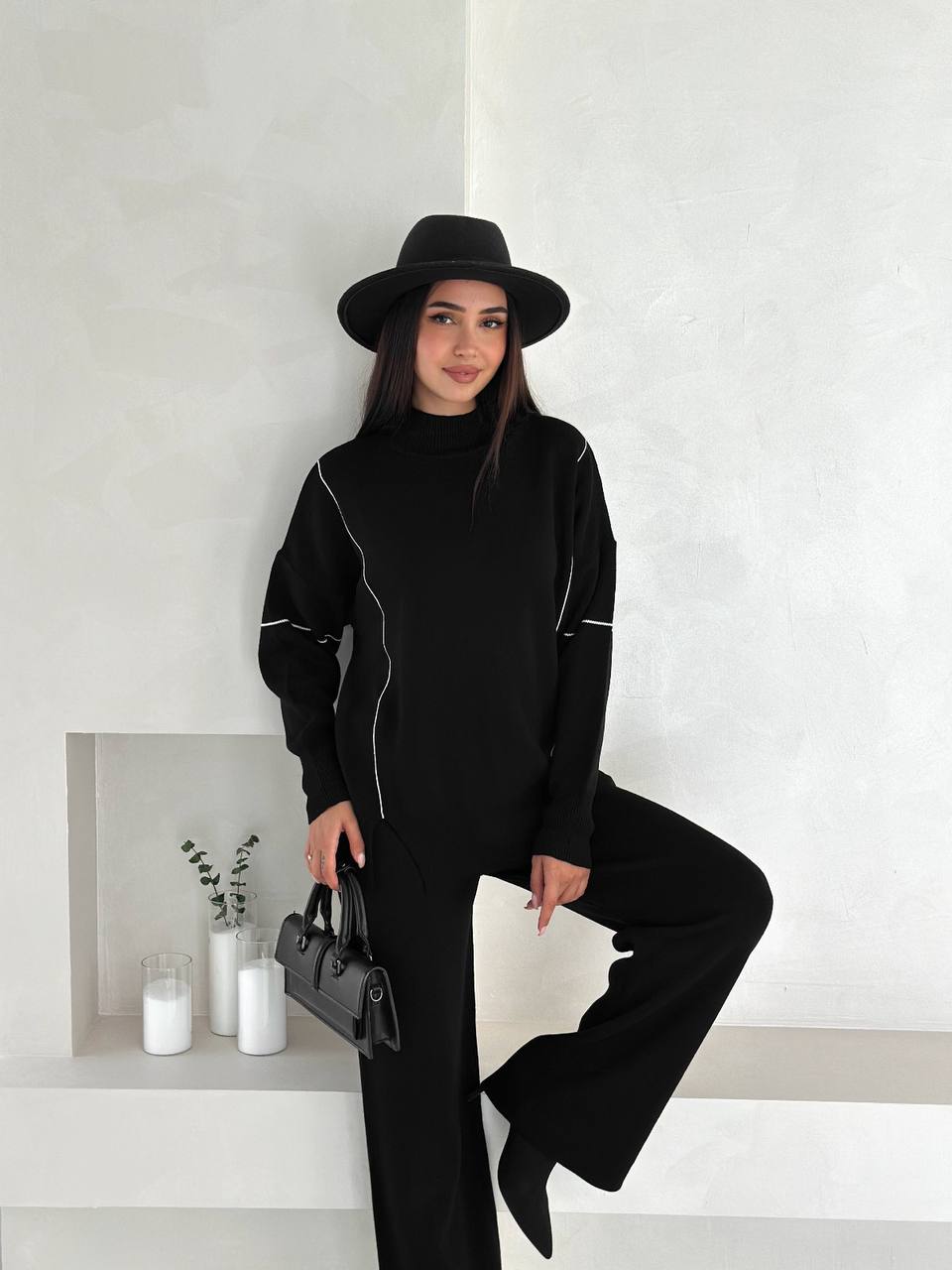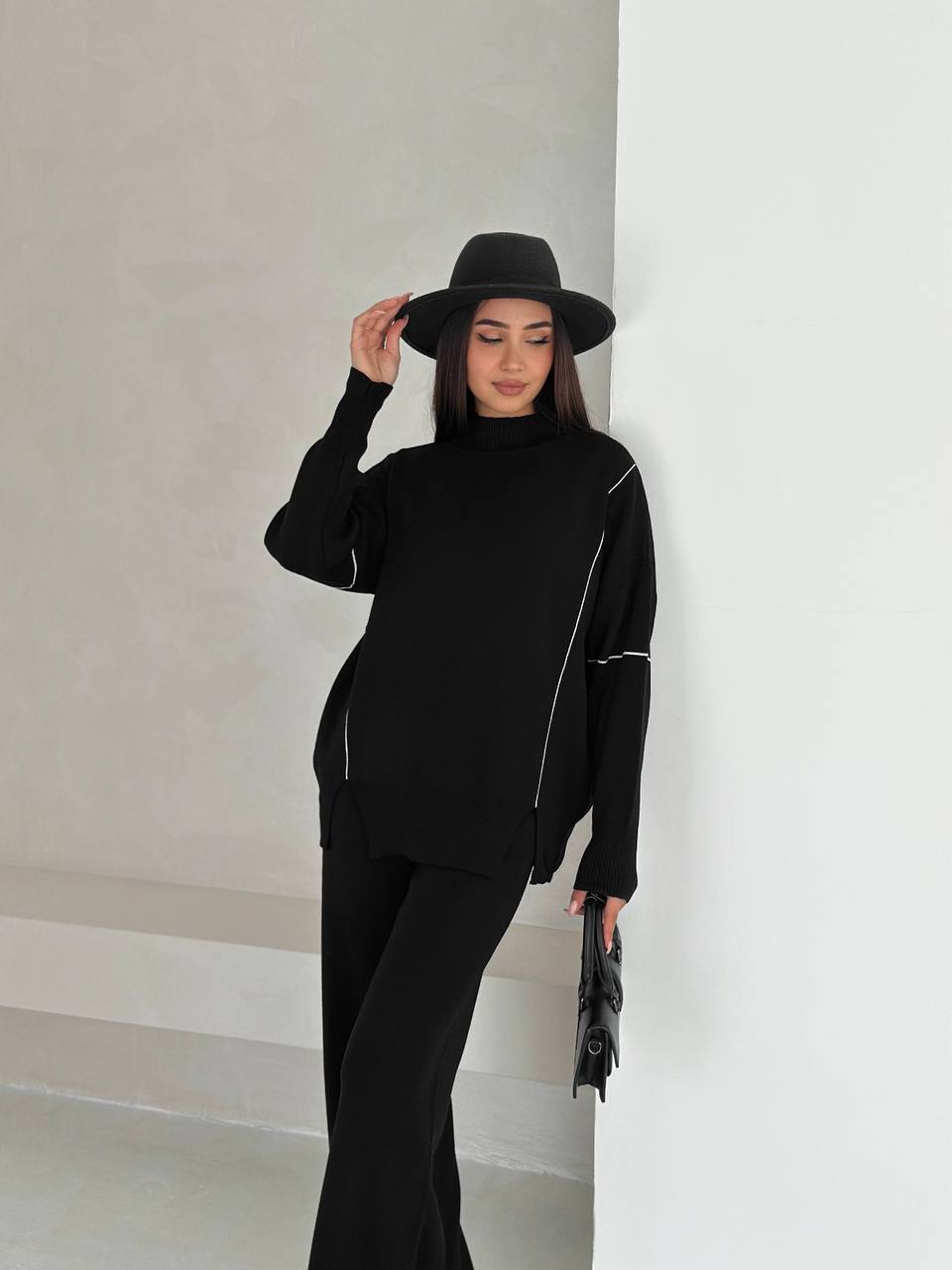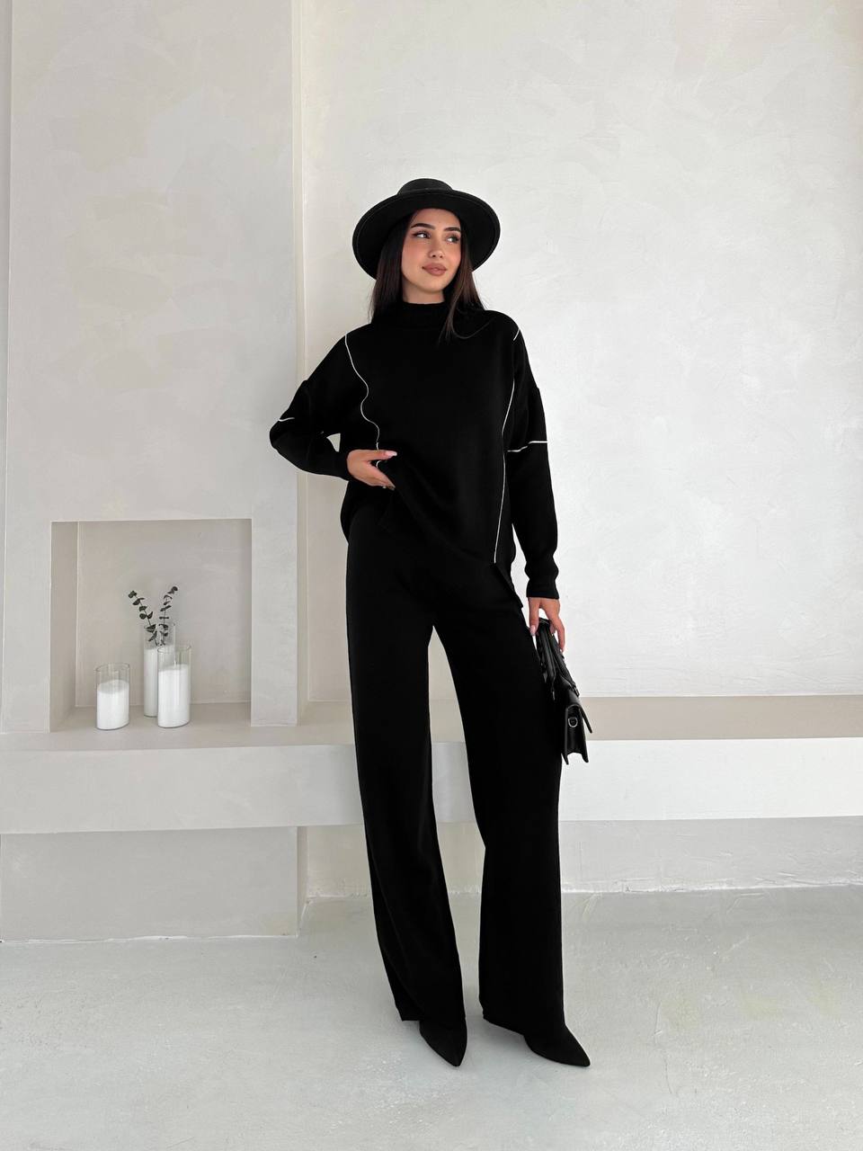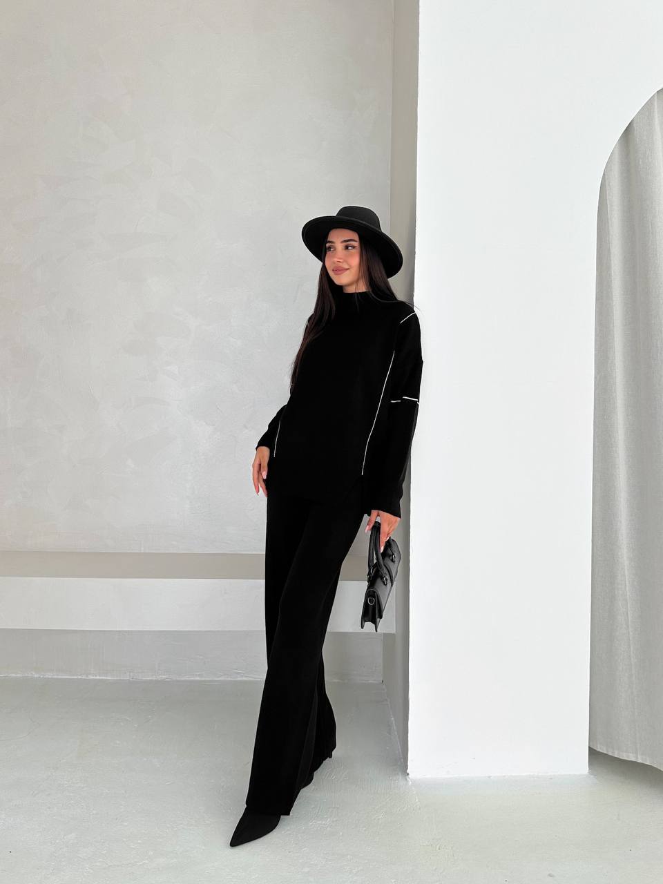 Жіночий Трикотажний Чорний Костюм Двійка Оверсайз з Кантом – Светр Вільного Крою + Широкі Штани
