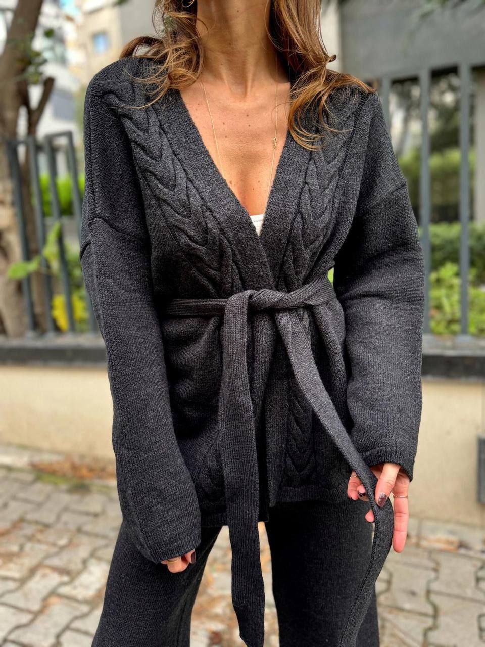 Жіночий Трикотажний Чорний Костюм – Кардиган на Запах з Поясом + Штани Прямого Крою