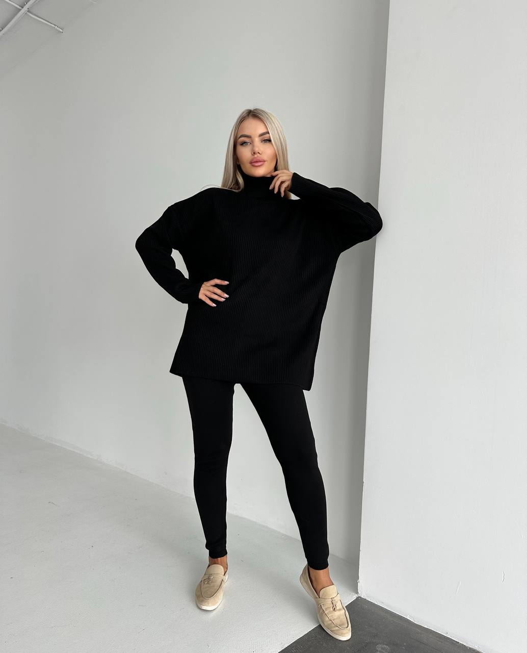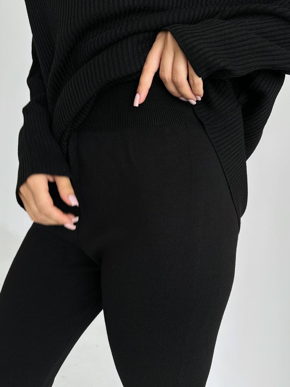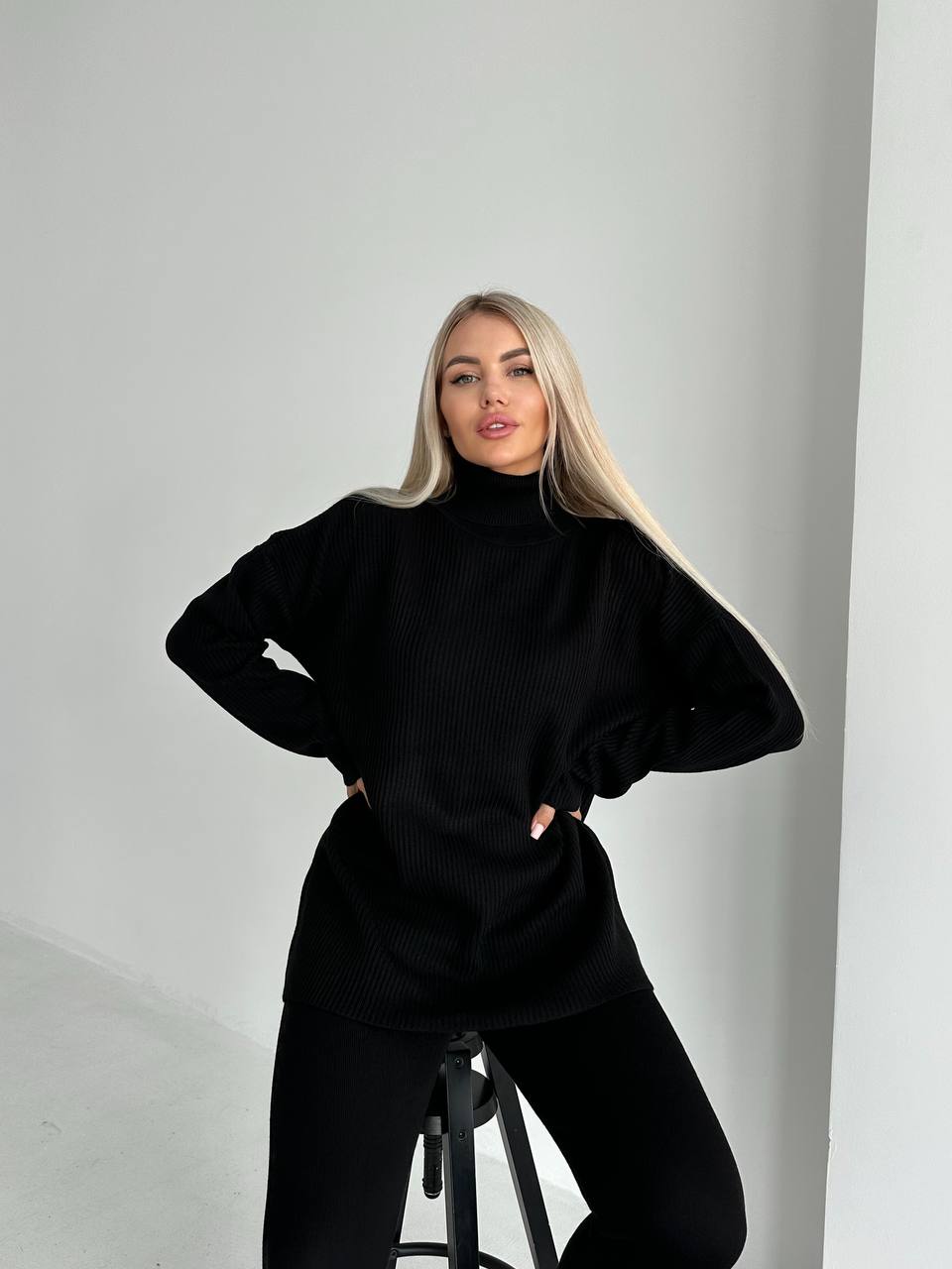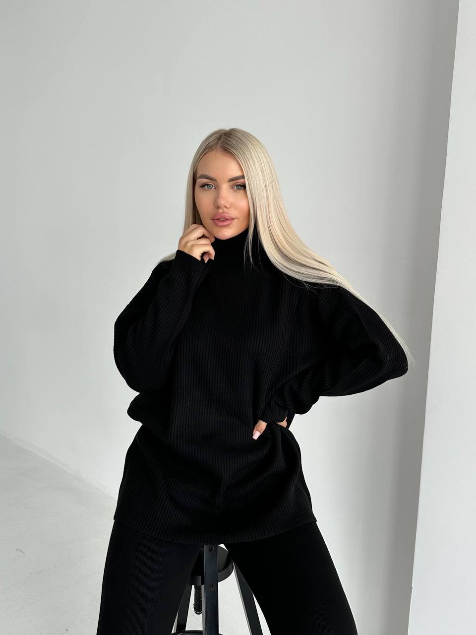 Жіночий Трикотажний Чорний Костюм – Об’ємний Светр під Горло + Вузькі Штани