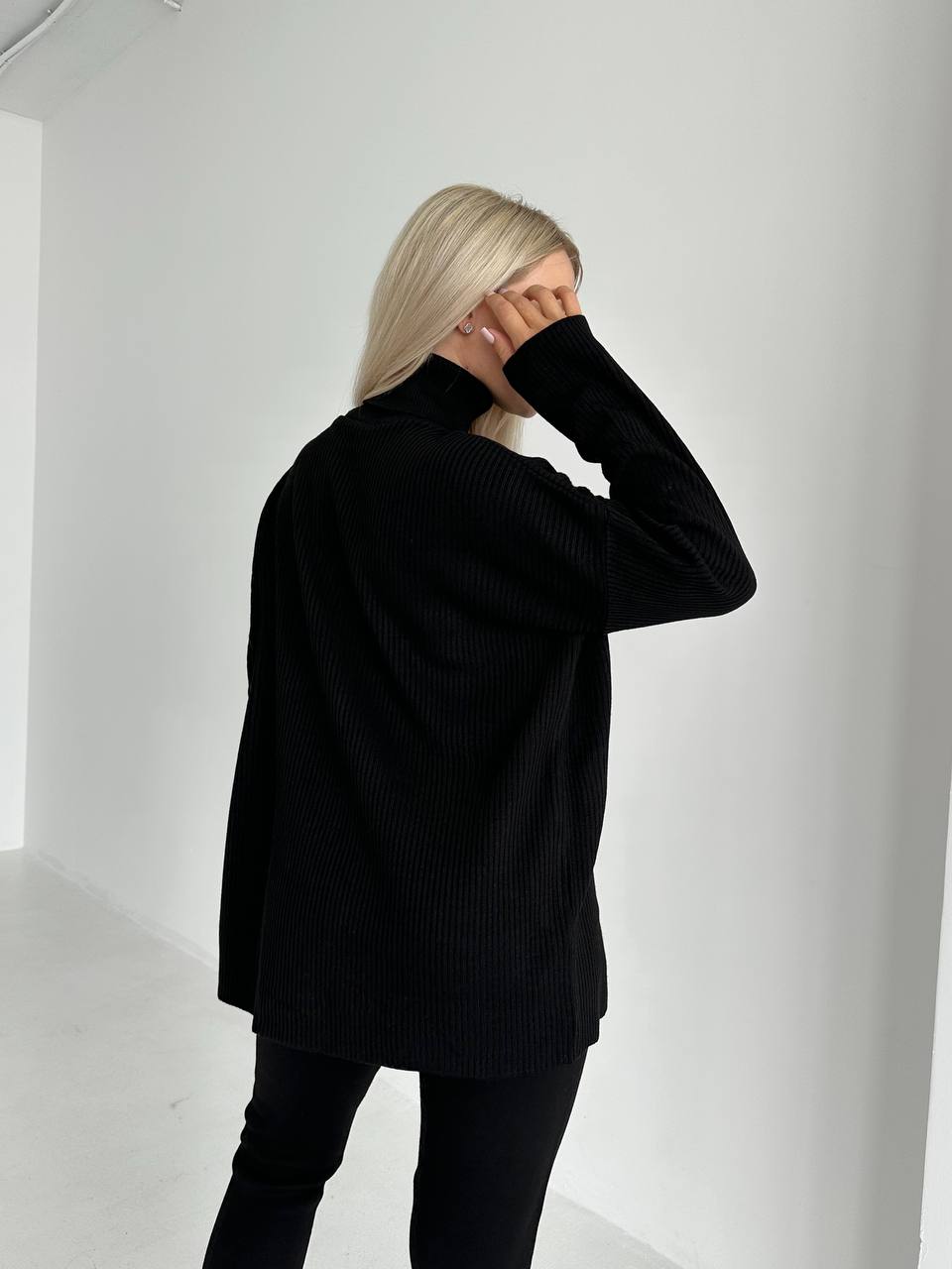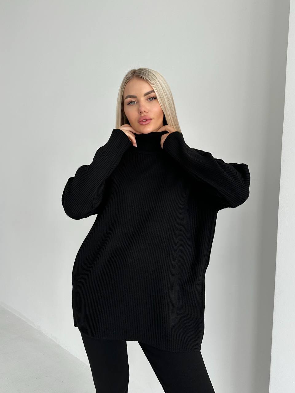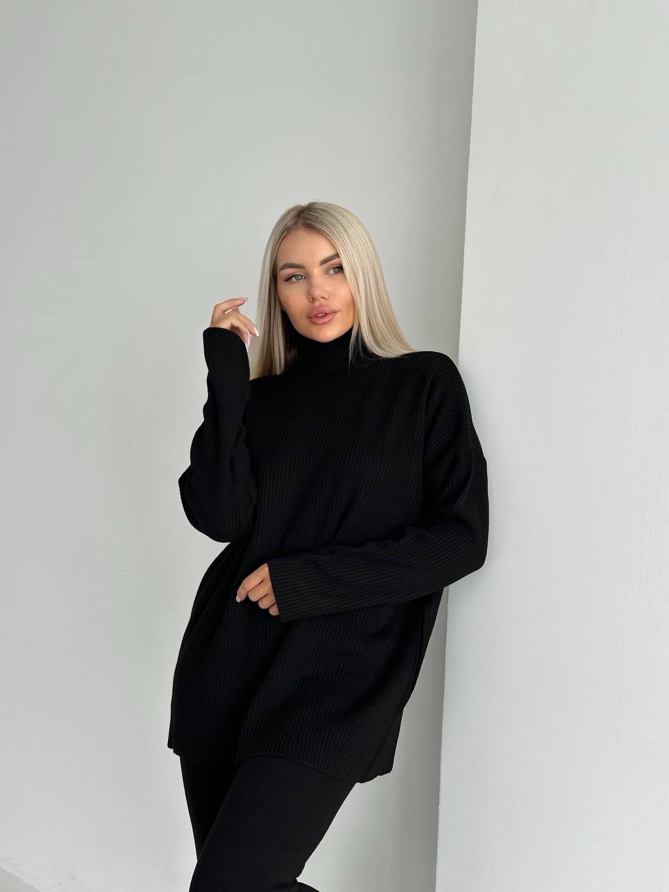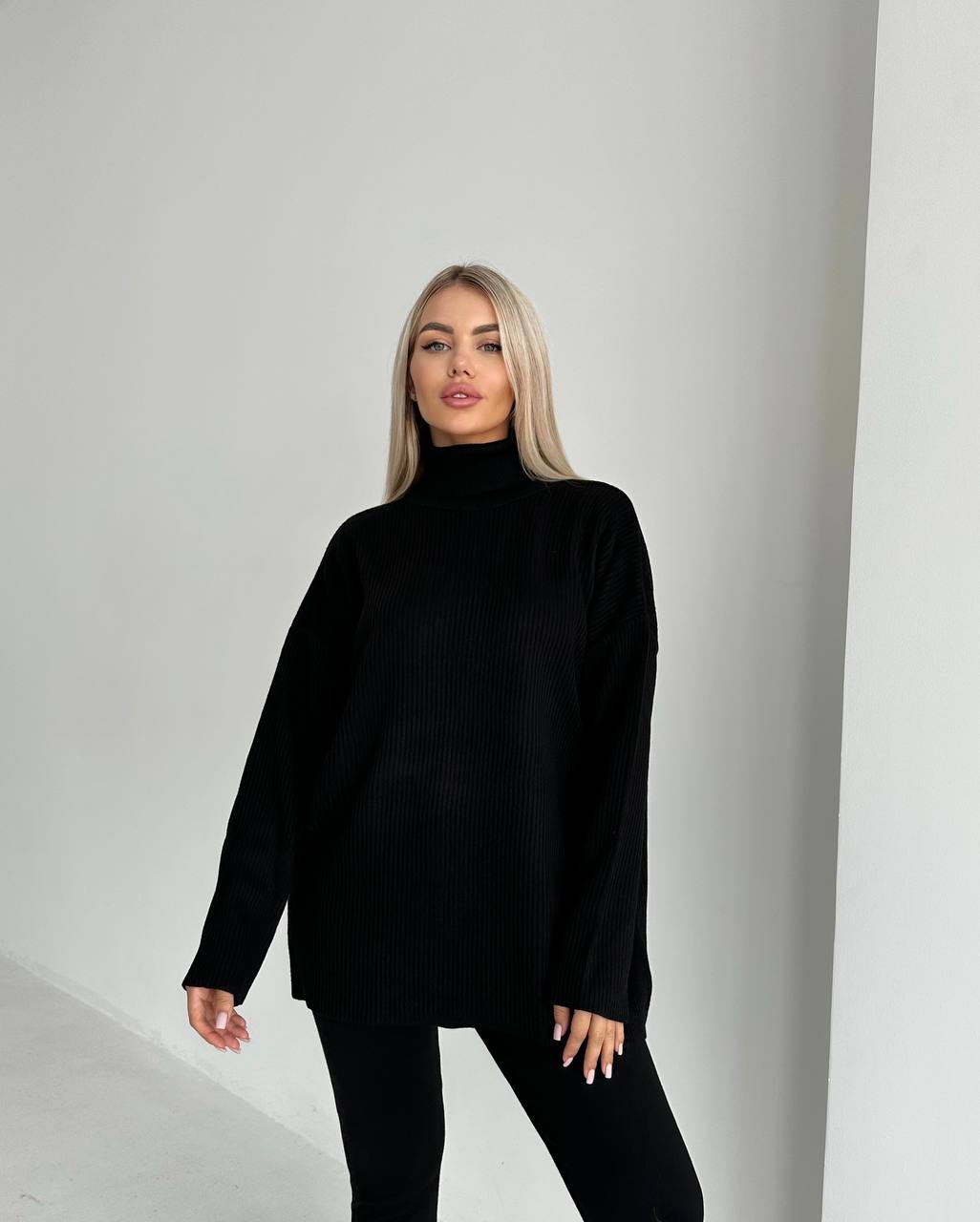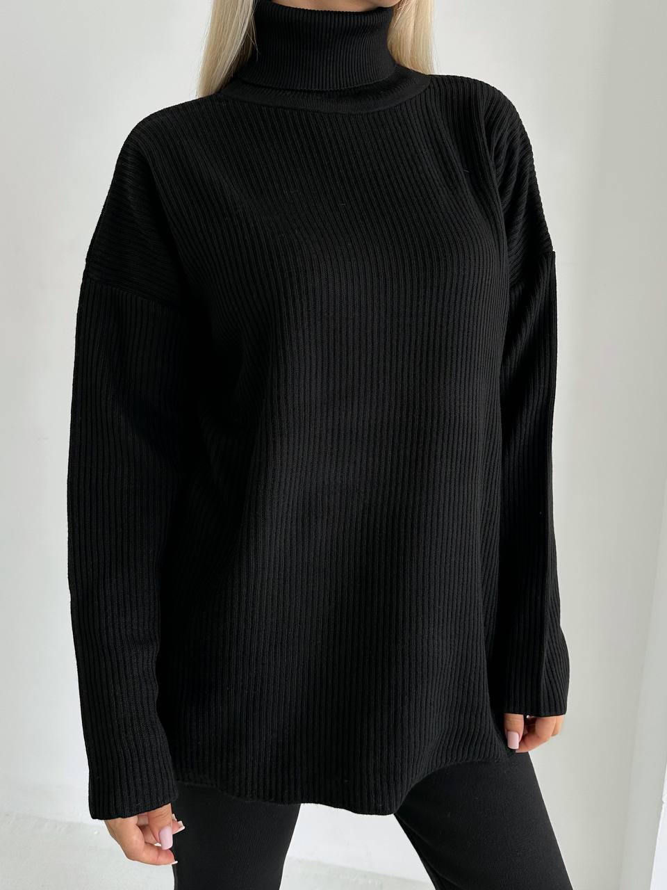 Жіночий Трикотажний Чорний Костюм – Об’ємний Светр під Горло + Вузькі Штани