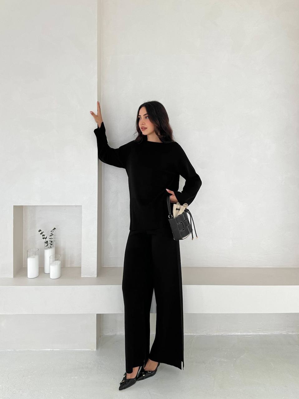 Жіночий Трикотажний Чорний Костюм Оверсайз – Об’ємний Светр + Широкі Штани