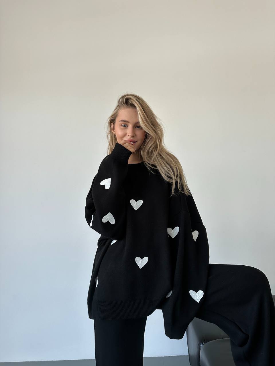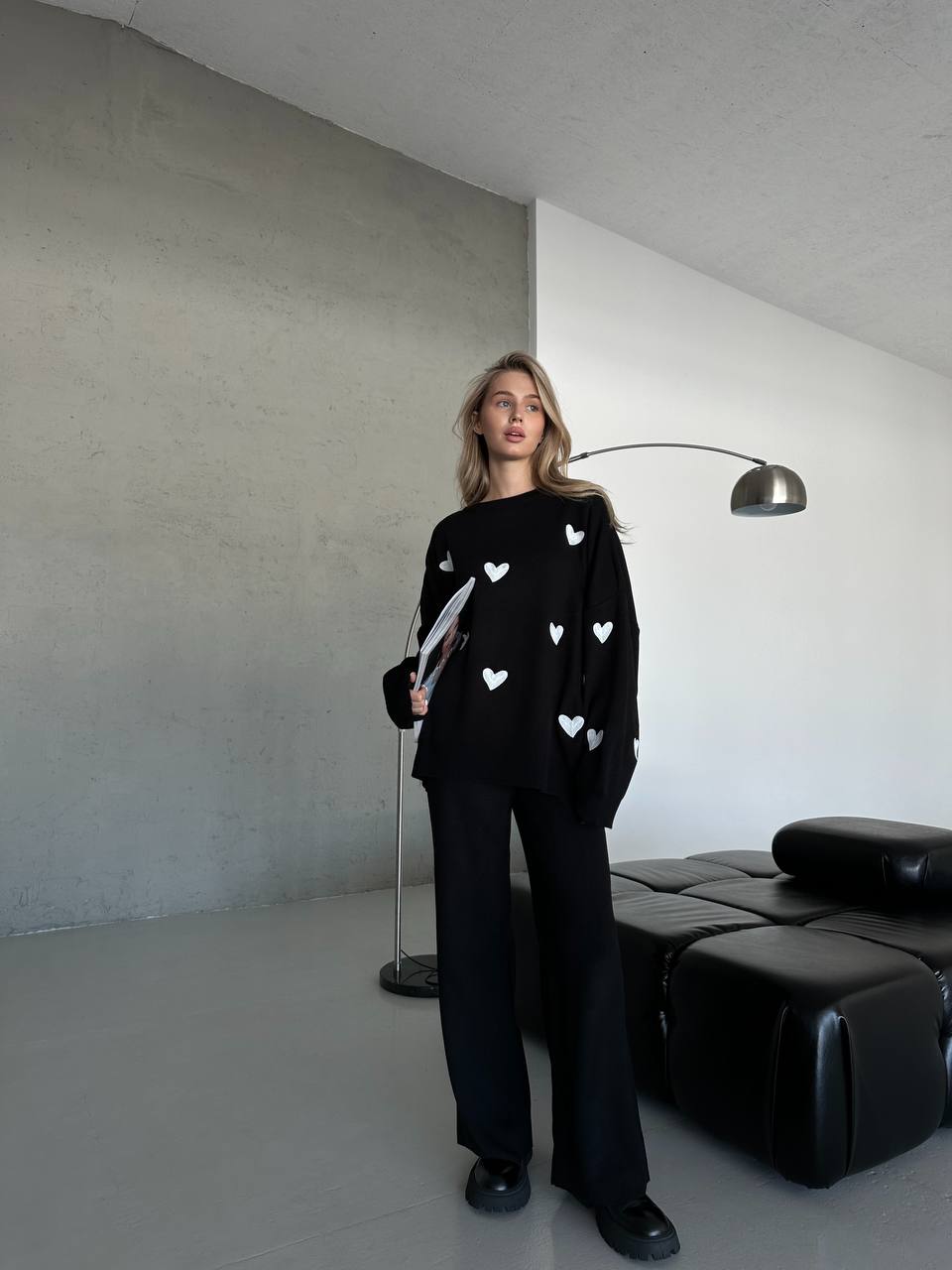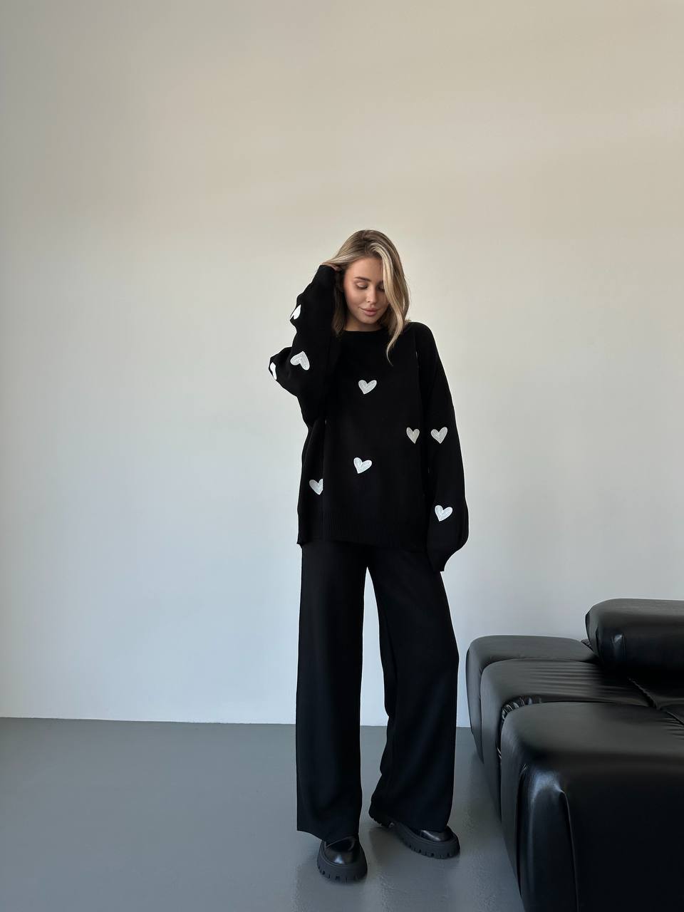 Жіночий Трикотажний Чорний Костюм Оверсайз з Білими Сердечками – Об’ємний Светр + Штани Палаццо