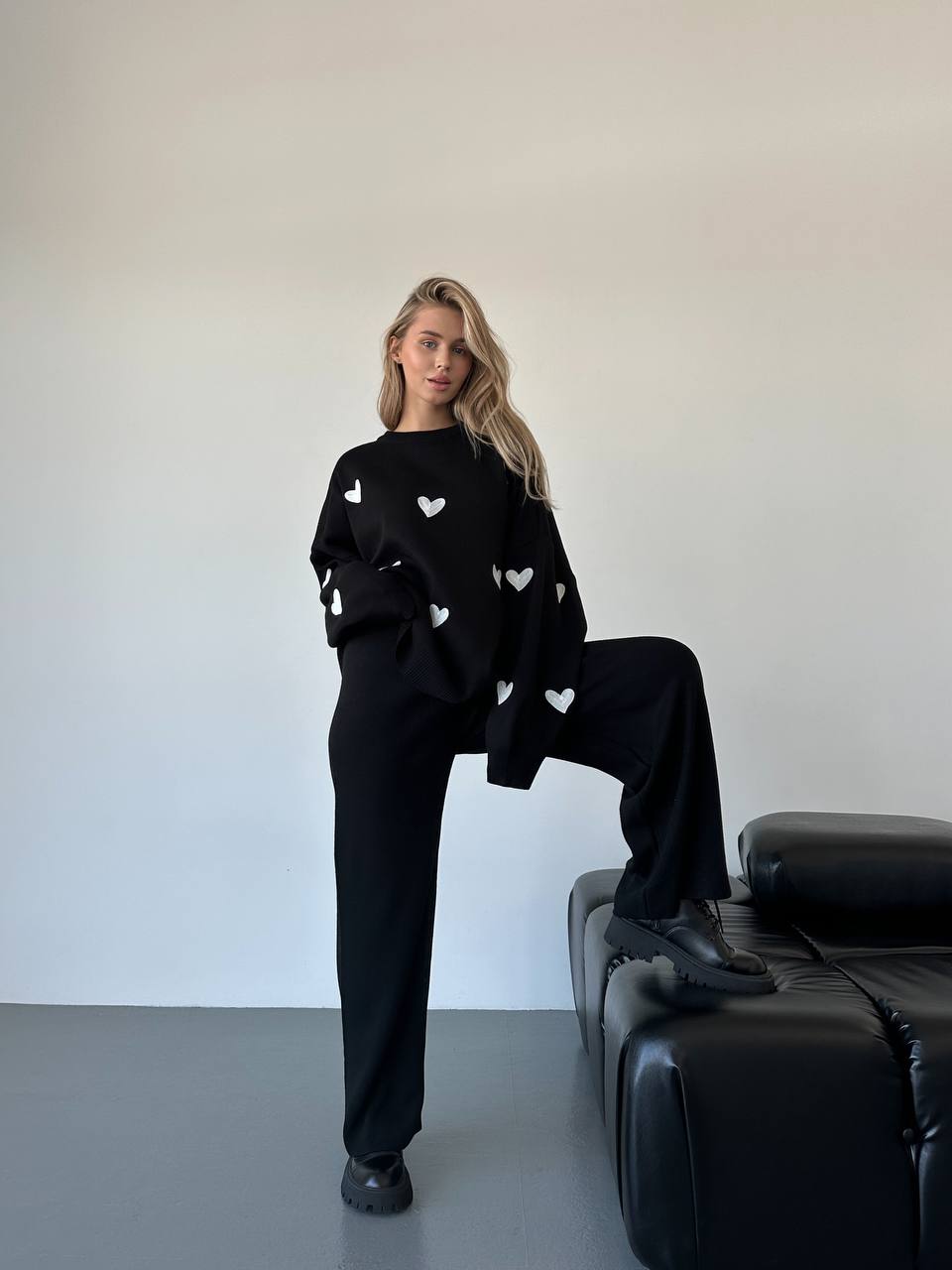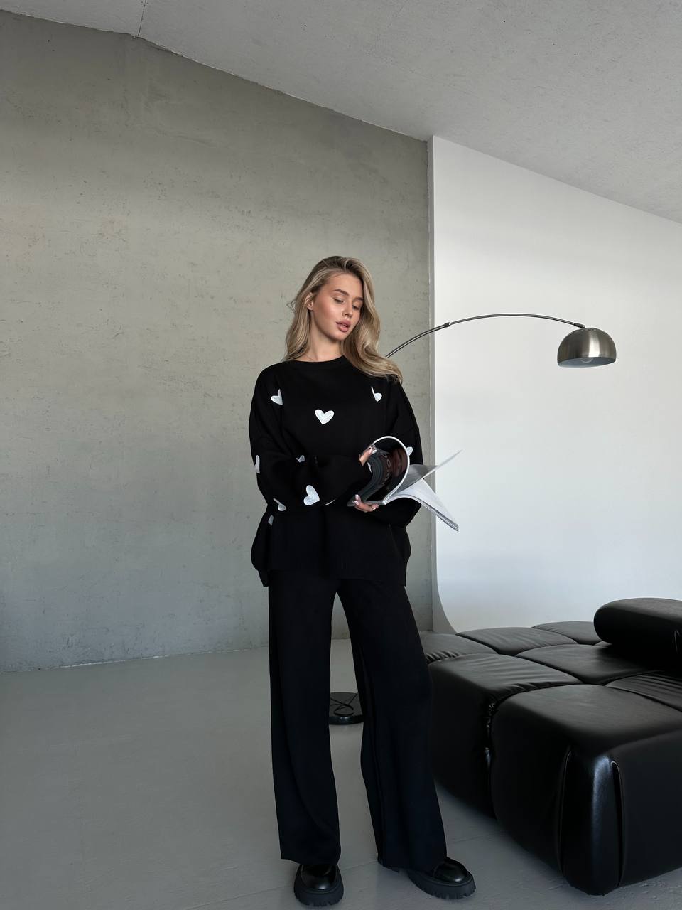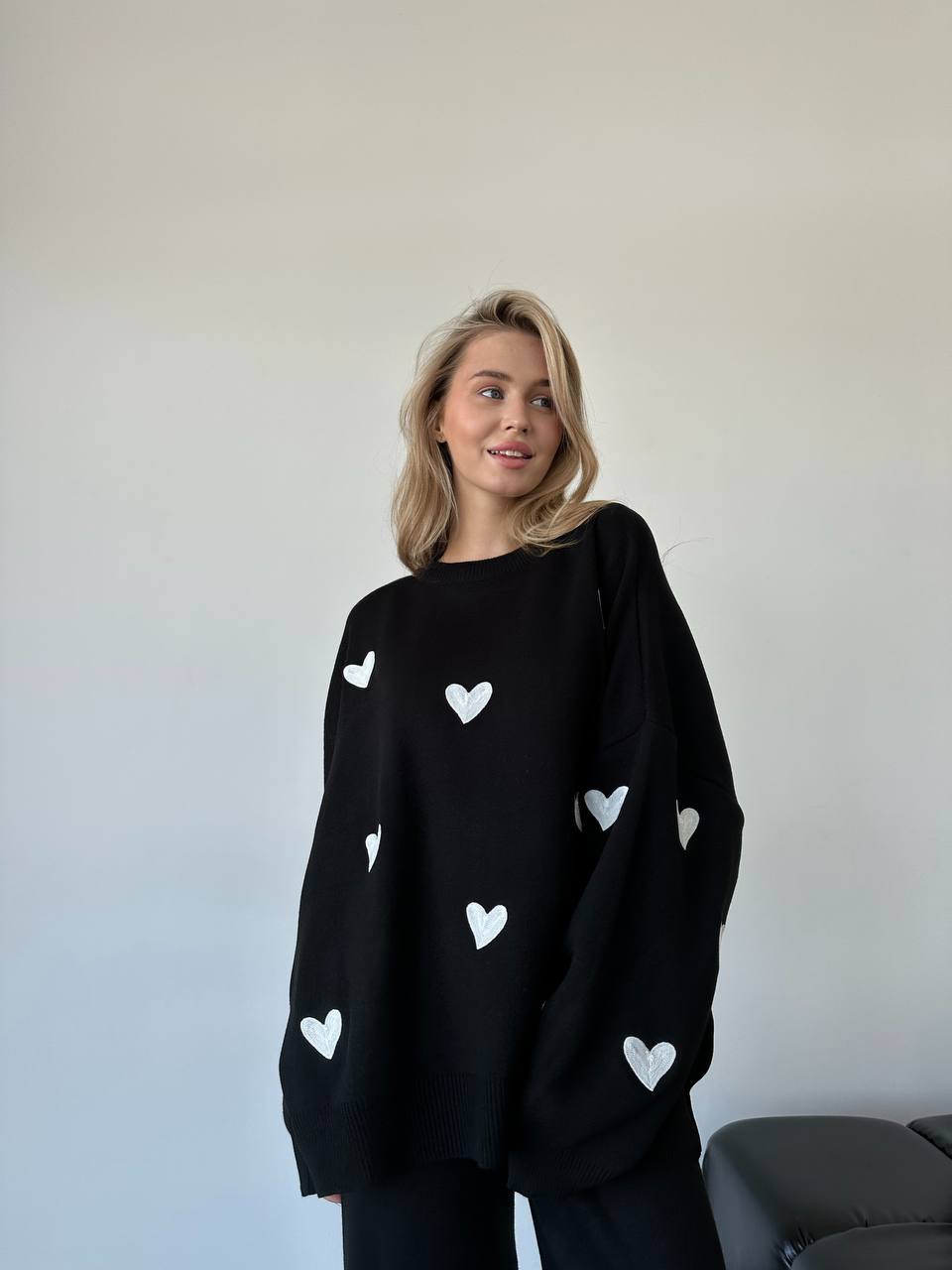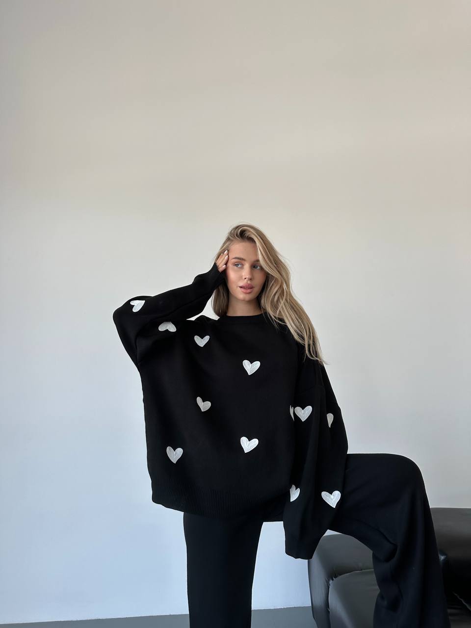 Жіночий Трикотажний Чорний Костюм Оверсайз з Білими Сердечками – Об’ємний Светр + Штани Палаццо