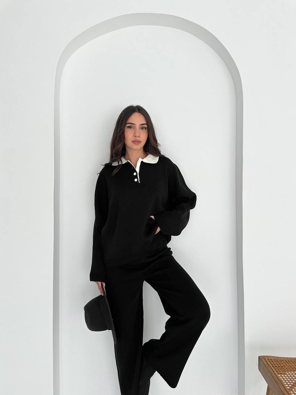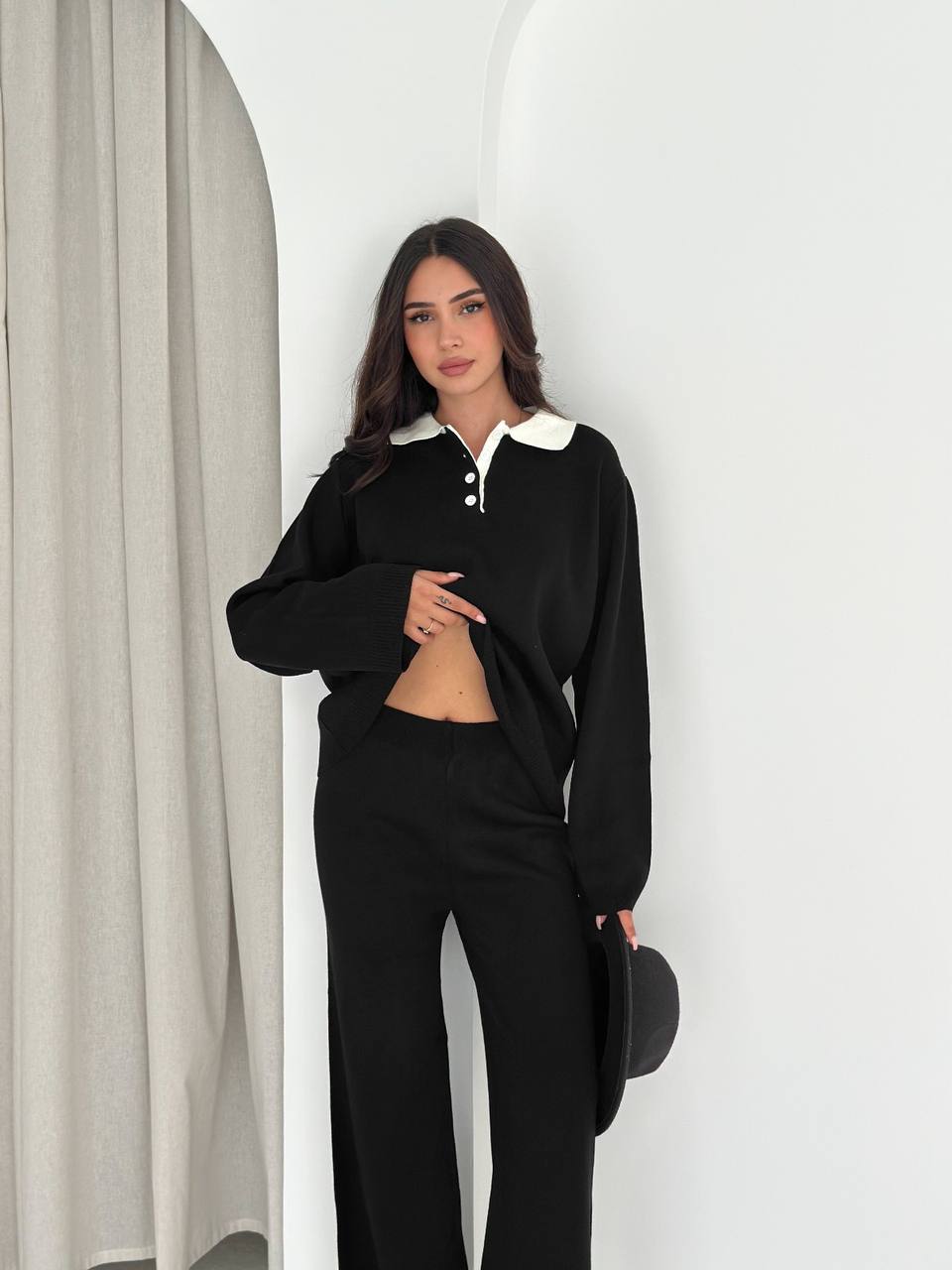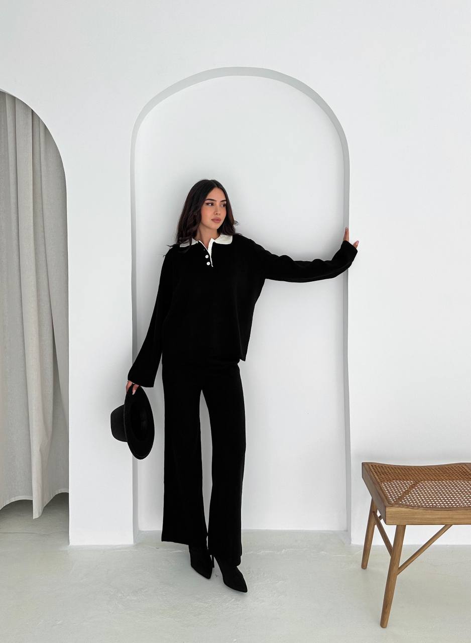 Жіночий Трикотажний Чорний Костюм з Контрастним Коміром – Светр Оверсайз + Широкі Штани