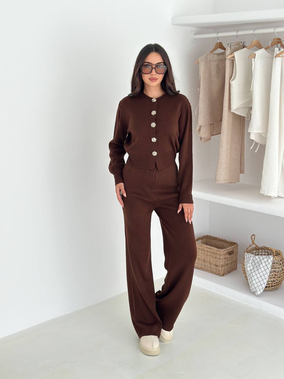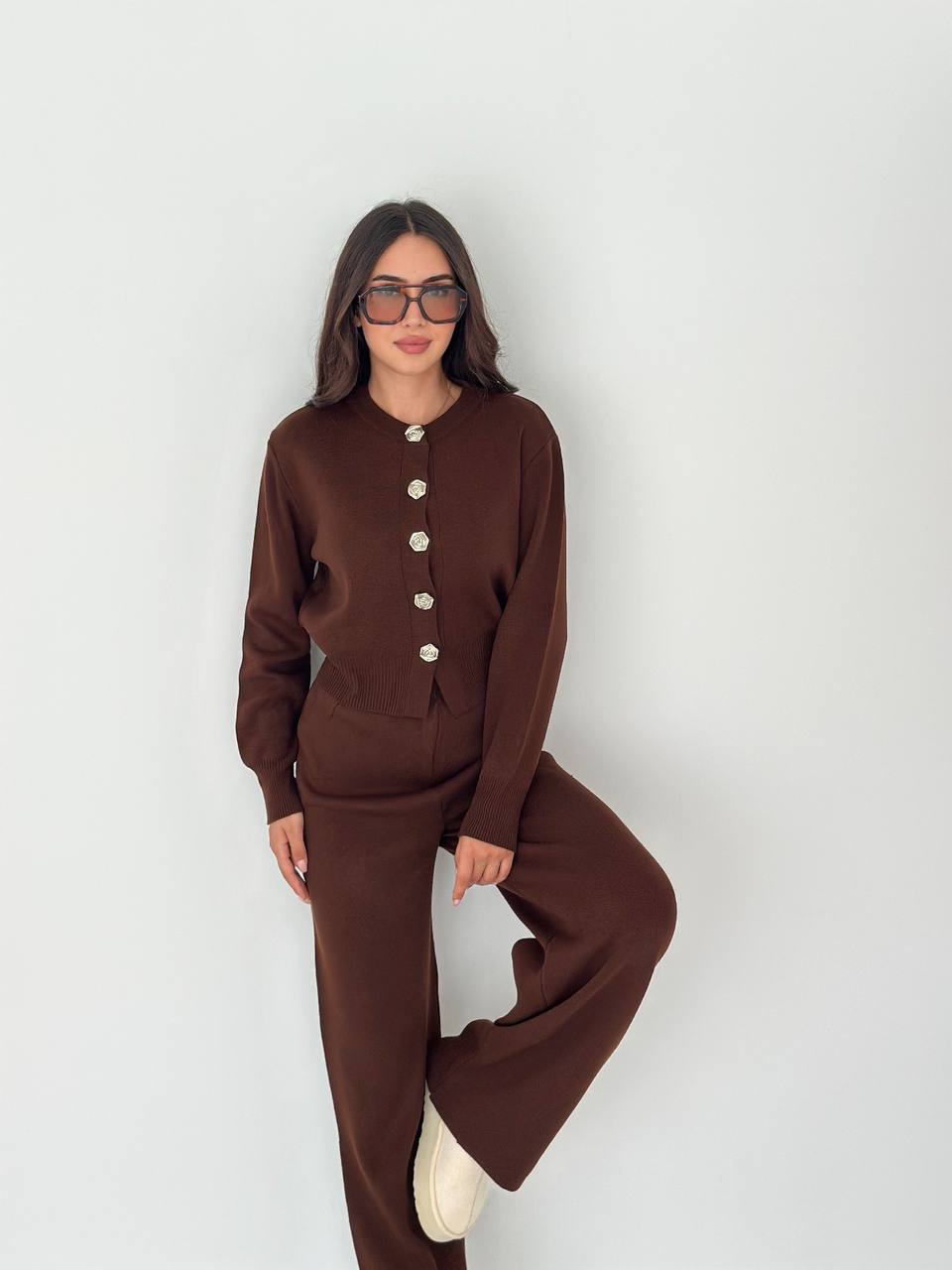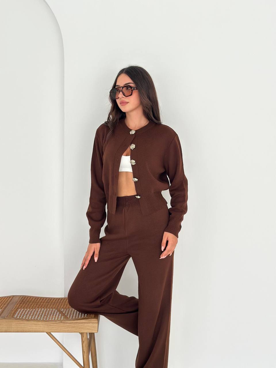Жіночий Трикотажний Коричневий Костюм Двійка – Укорочений Жакет + Вільні Штани Прямого Крою