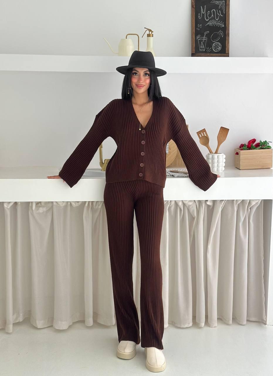 Жіночий Трикотажний Коричневий Костюм Оверсайз у Фактурну Смужку – Кардиган + Широкі Штани