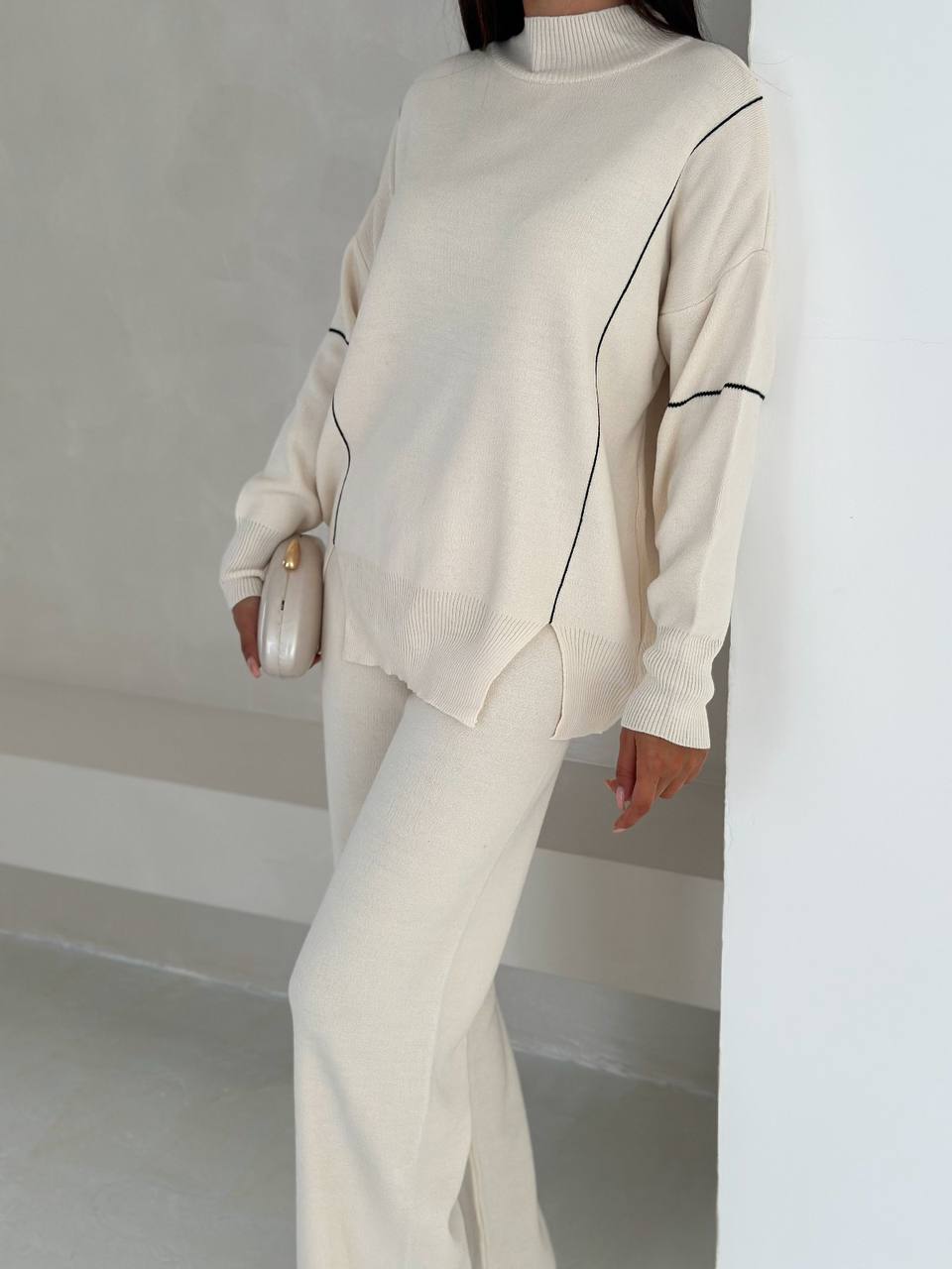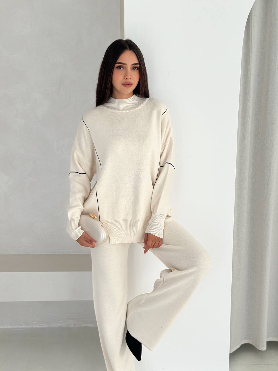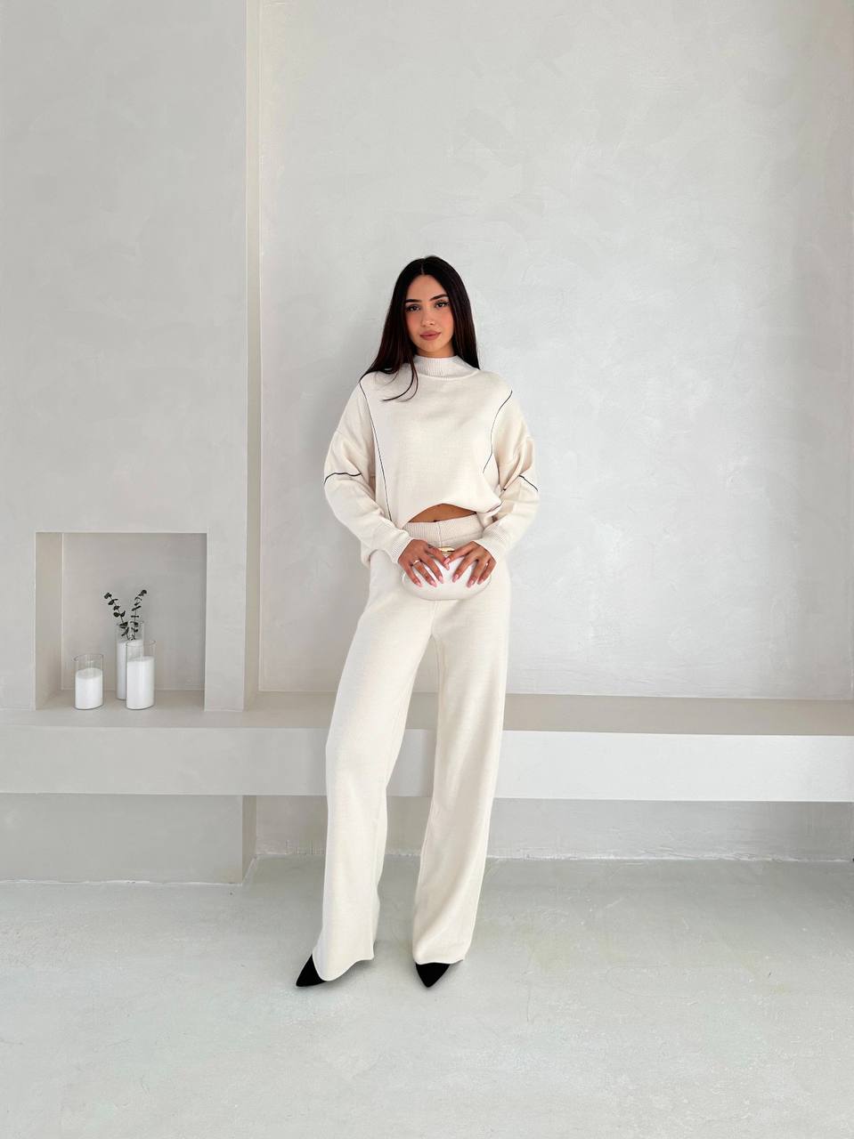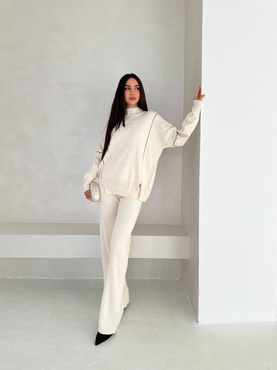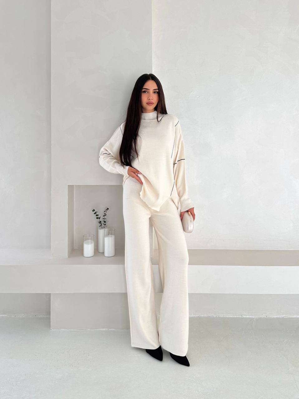 Жіночий Трикотажний Молочний Костюм Двійка Оверсайз з Кантом – Светр Вільного Крою + Широкі Штани
