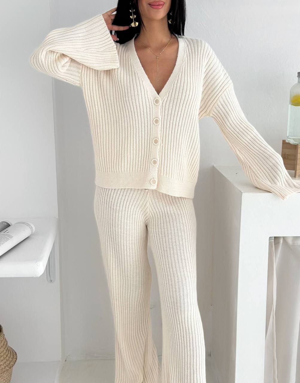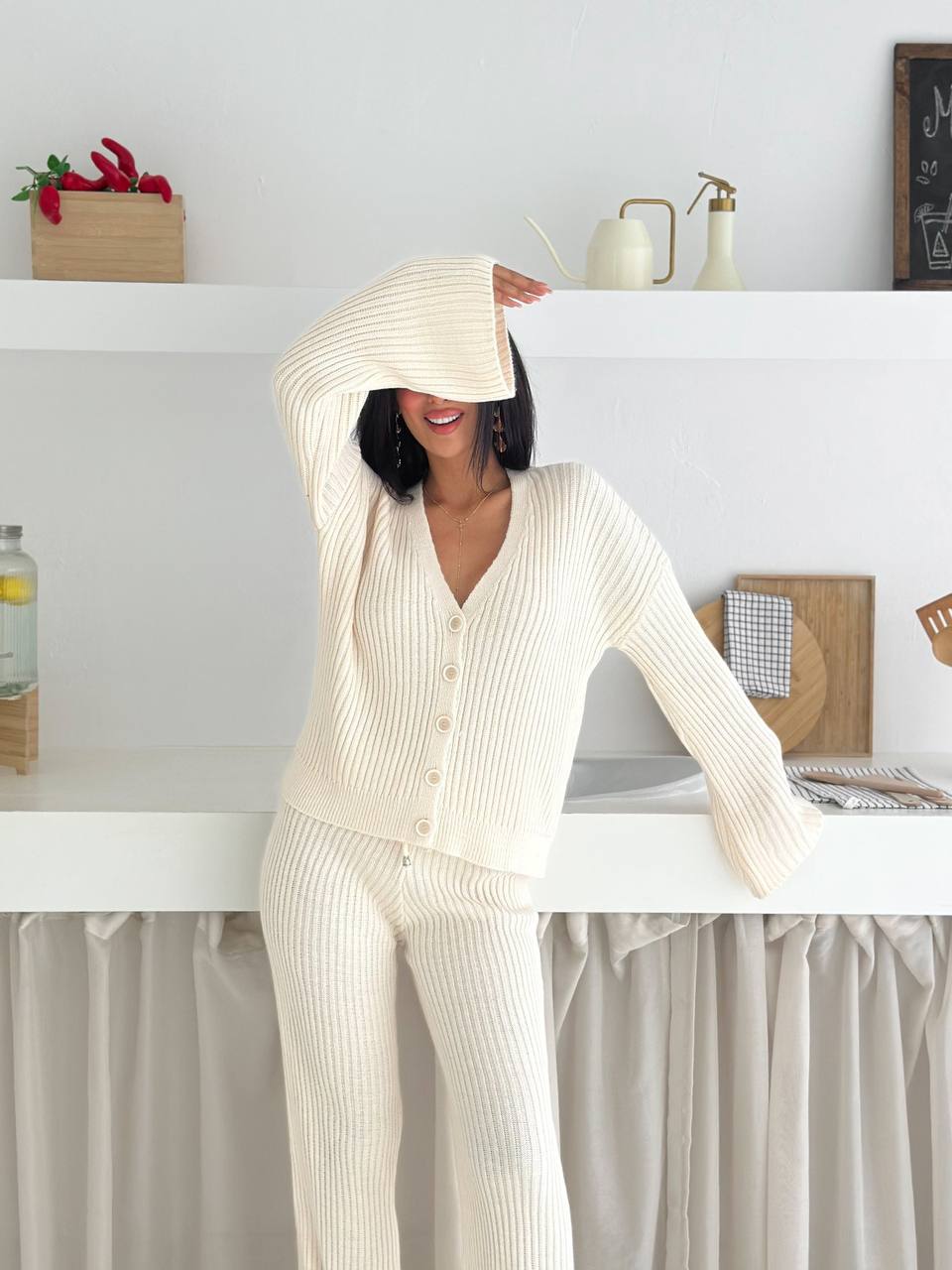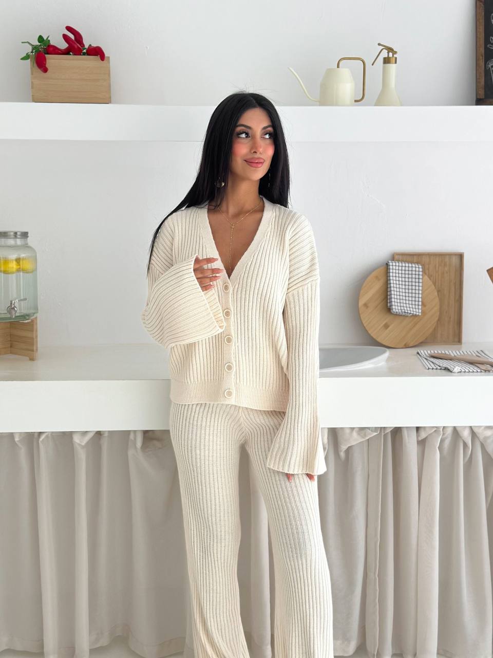 Жіночий Трикотажний Молочний Костюм Оверсайз у Фактурну Смужку – Кардиган + Широкі Штани