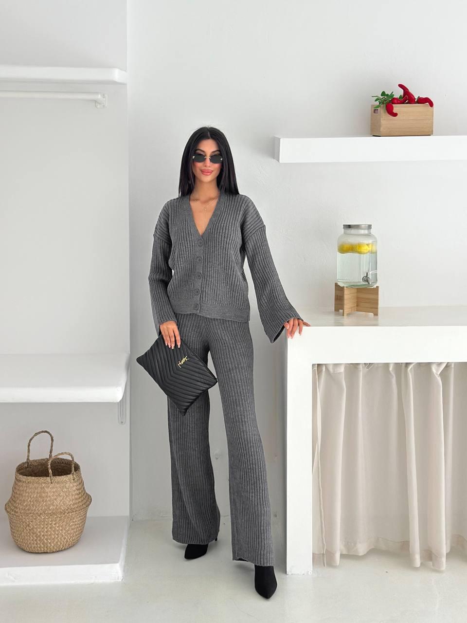 Жіночий Трикотажний Сірий Костюм Оверсайз у Фактурну Смужку – Кардиган + Широкі Штани