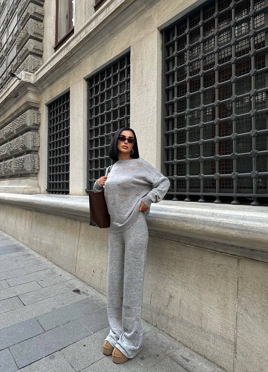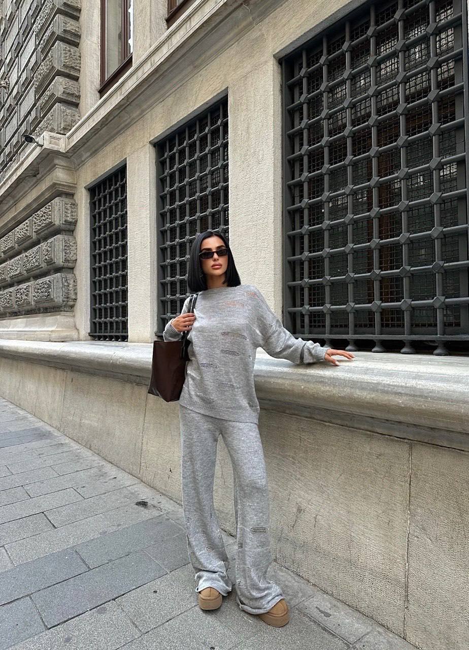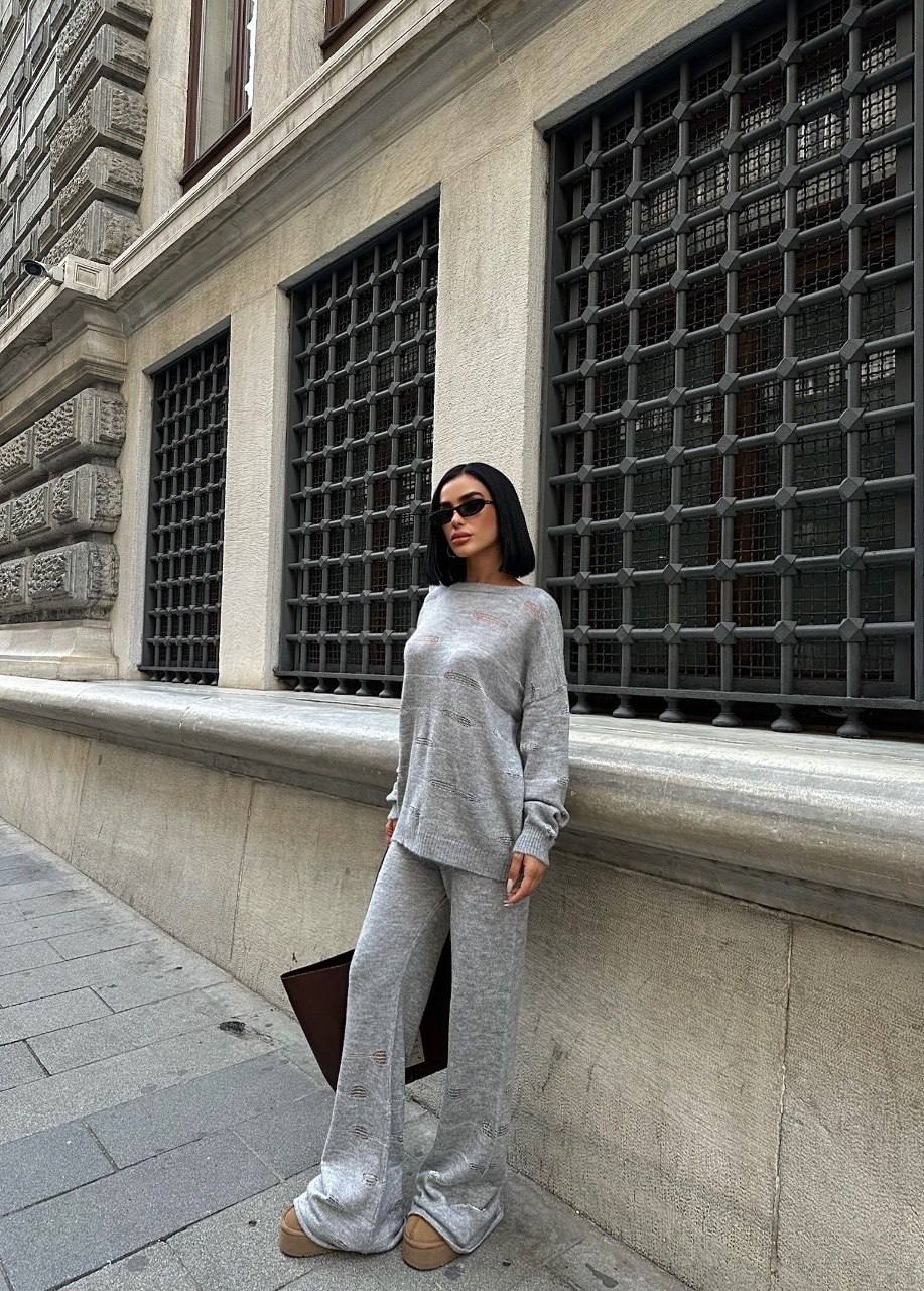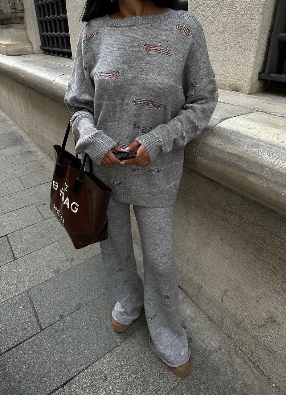 Жіночий Трикотажний Сірий Костюм Оверсайз з Блискучими Вставками (Кофта + Штани)