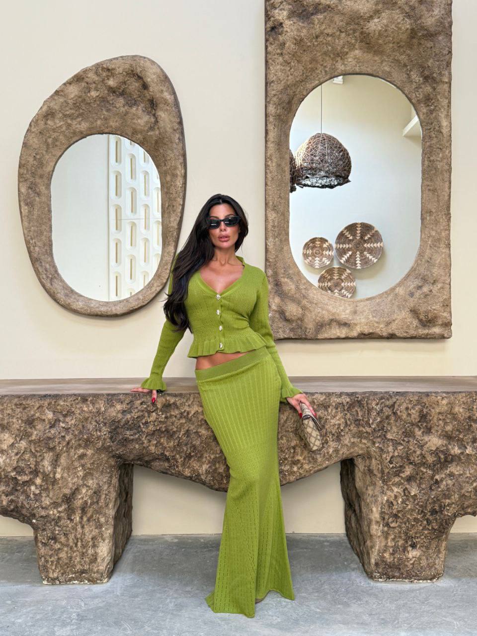 Жіночий Трикотажний Зелений Костюм Двійка – Жакет з Рюшами + Спідниця Максі