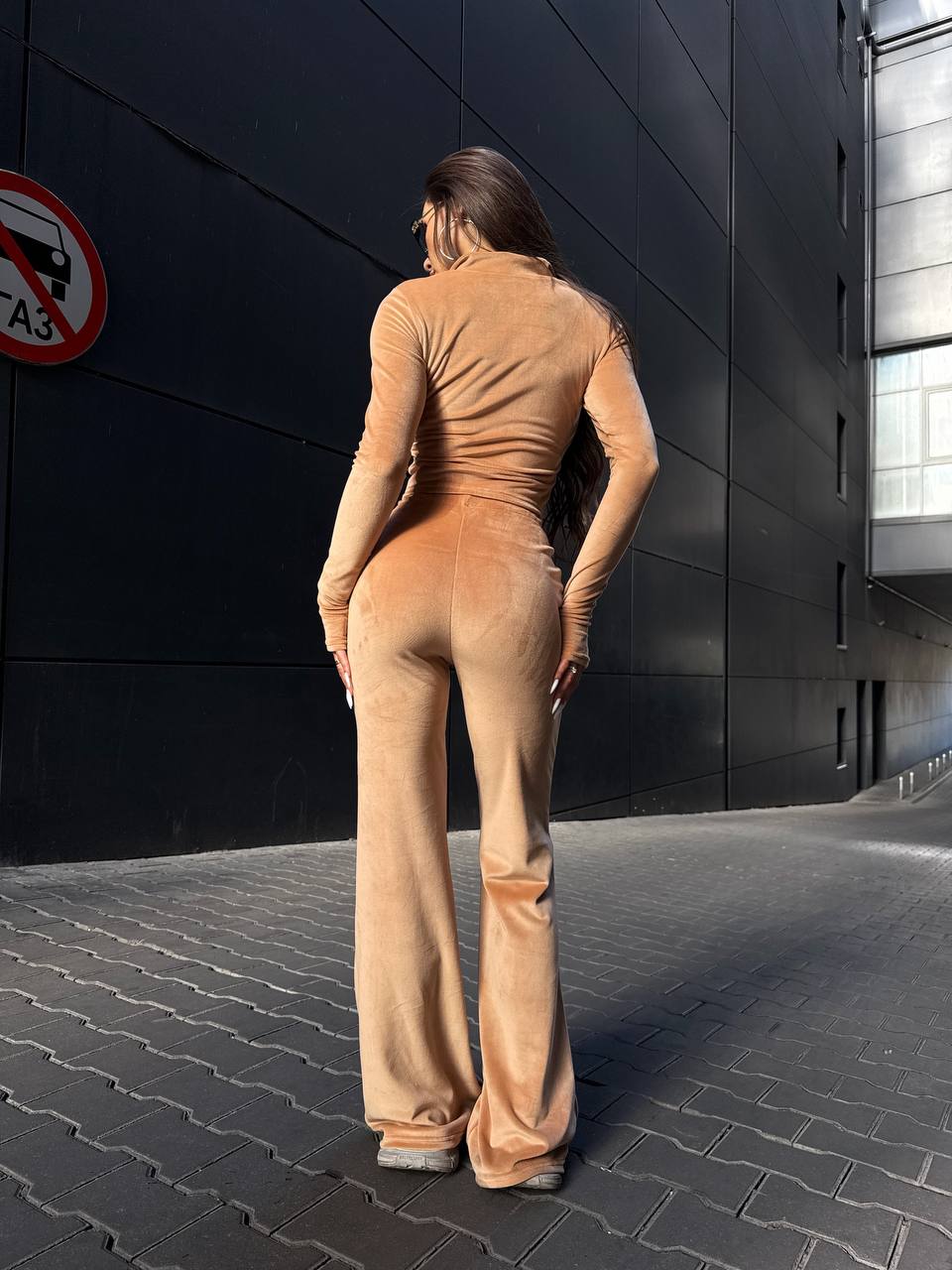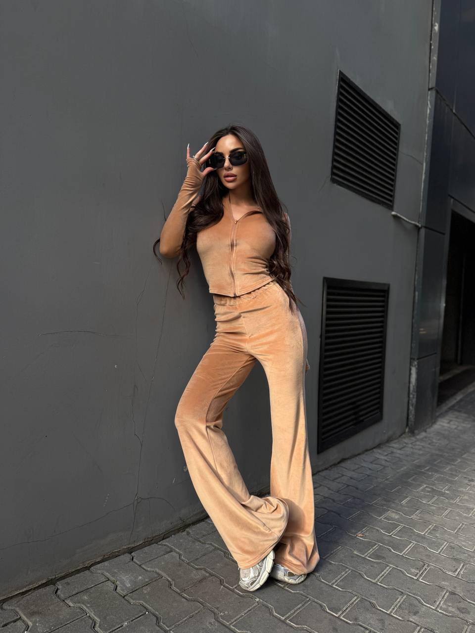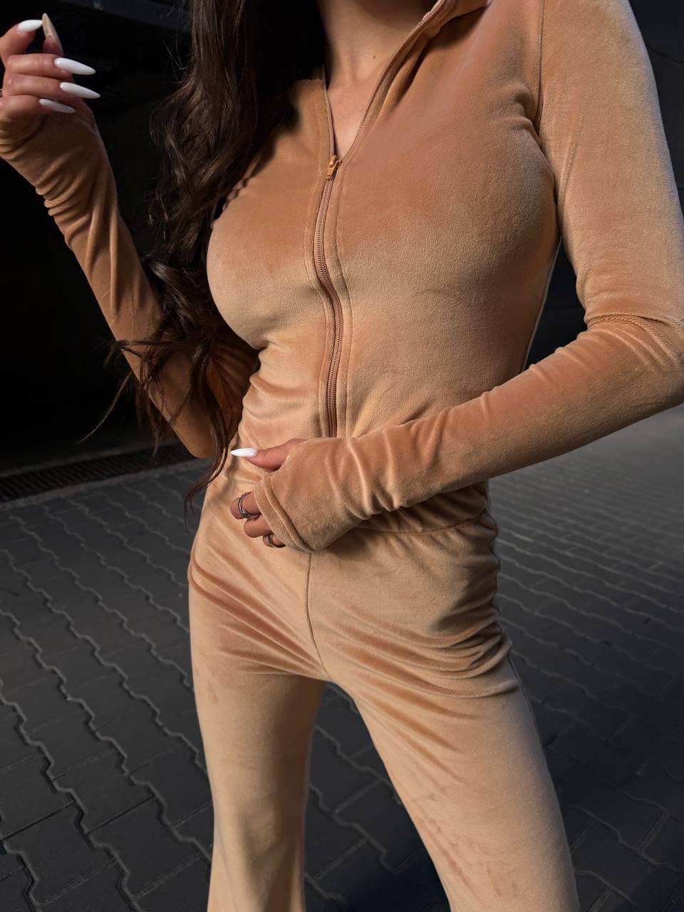 Жіночий Велюровий Бежевий Костюм Двійка – Укорочена Кофта на Блискавці + Штани Кльош