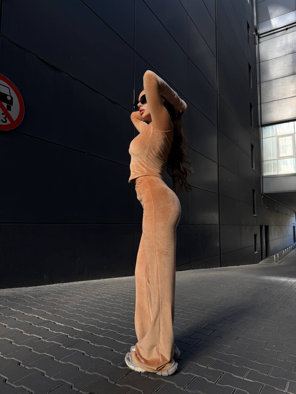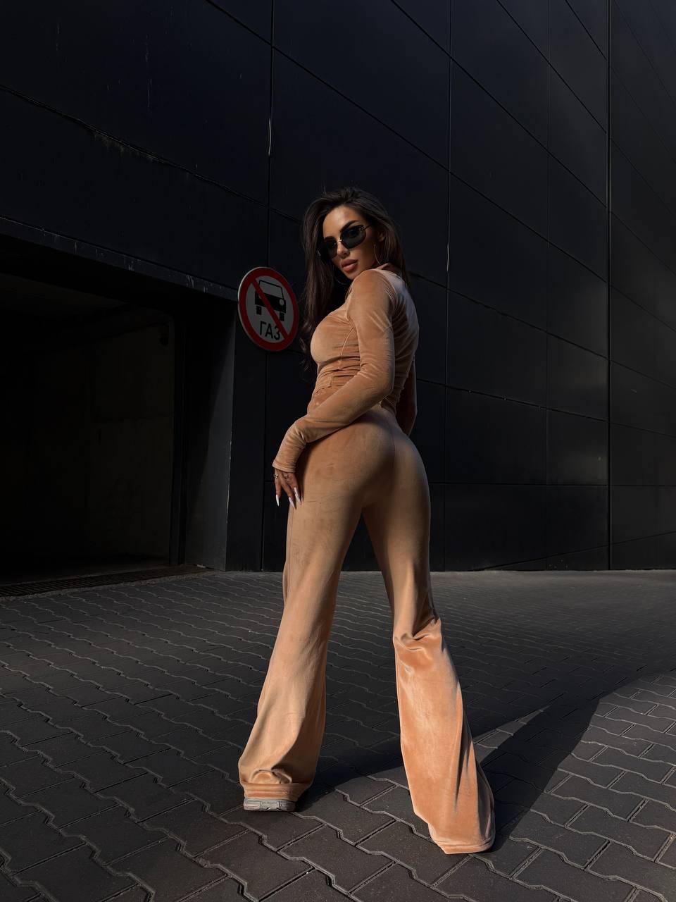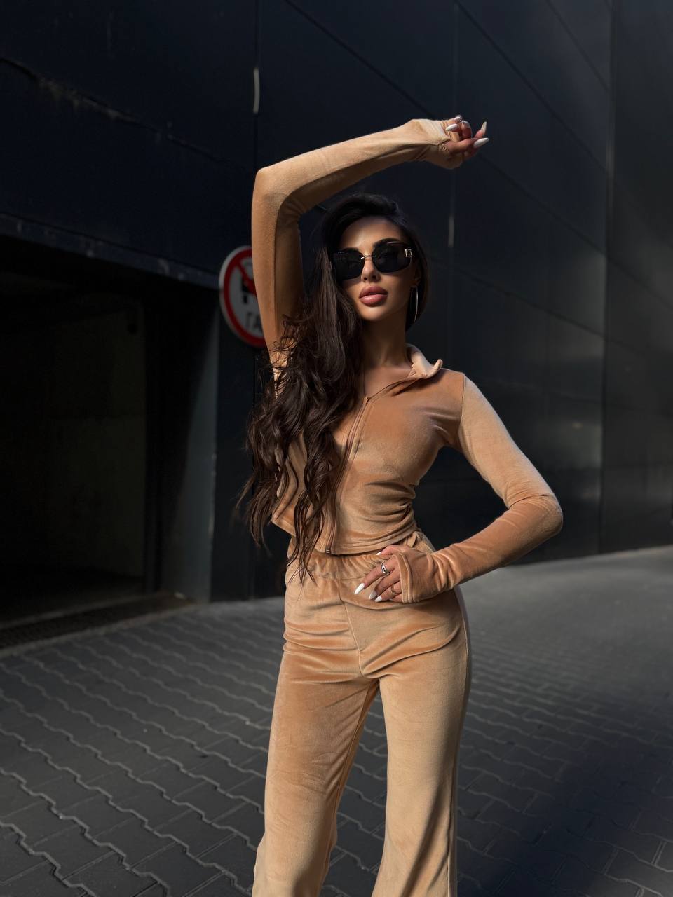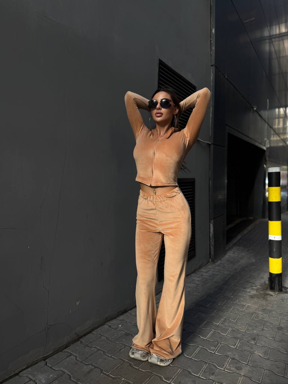 Жіночий Велюровий Бежевий Костюм Двійка – Укорочена Кофта на Блискавці + Штани Кльош