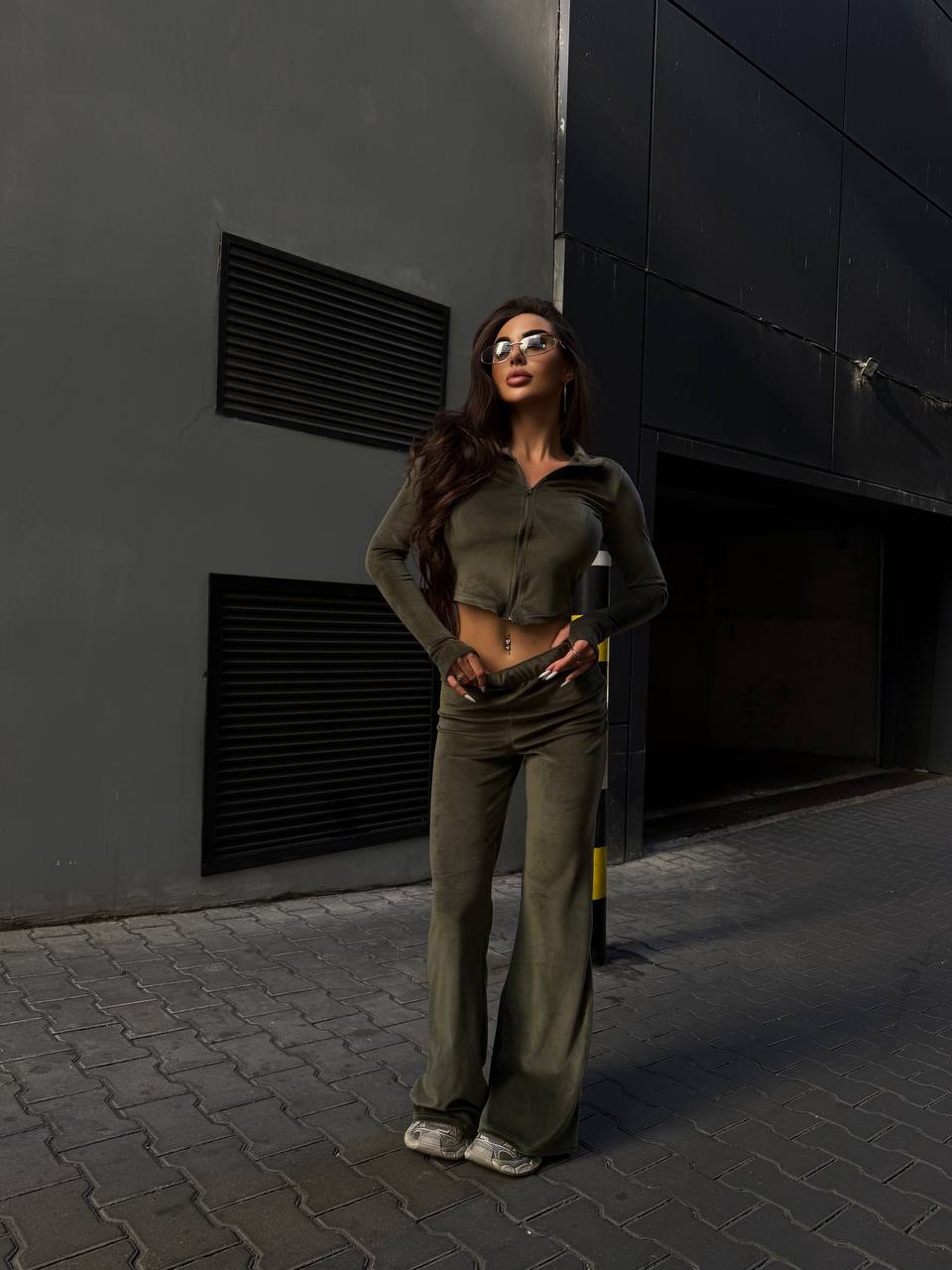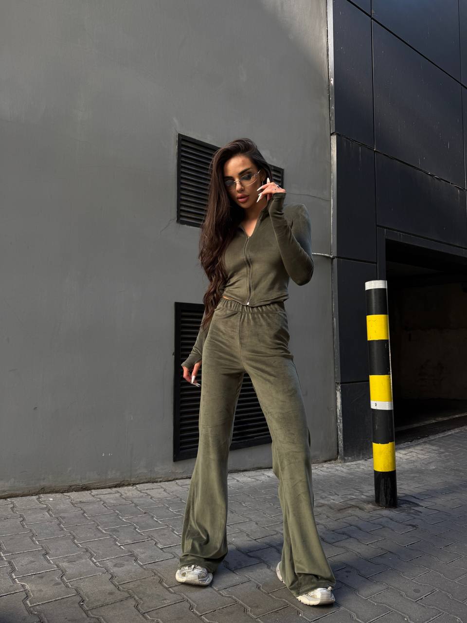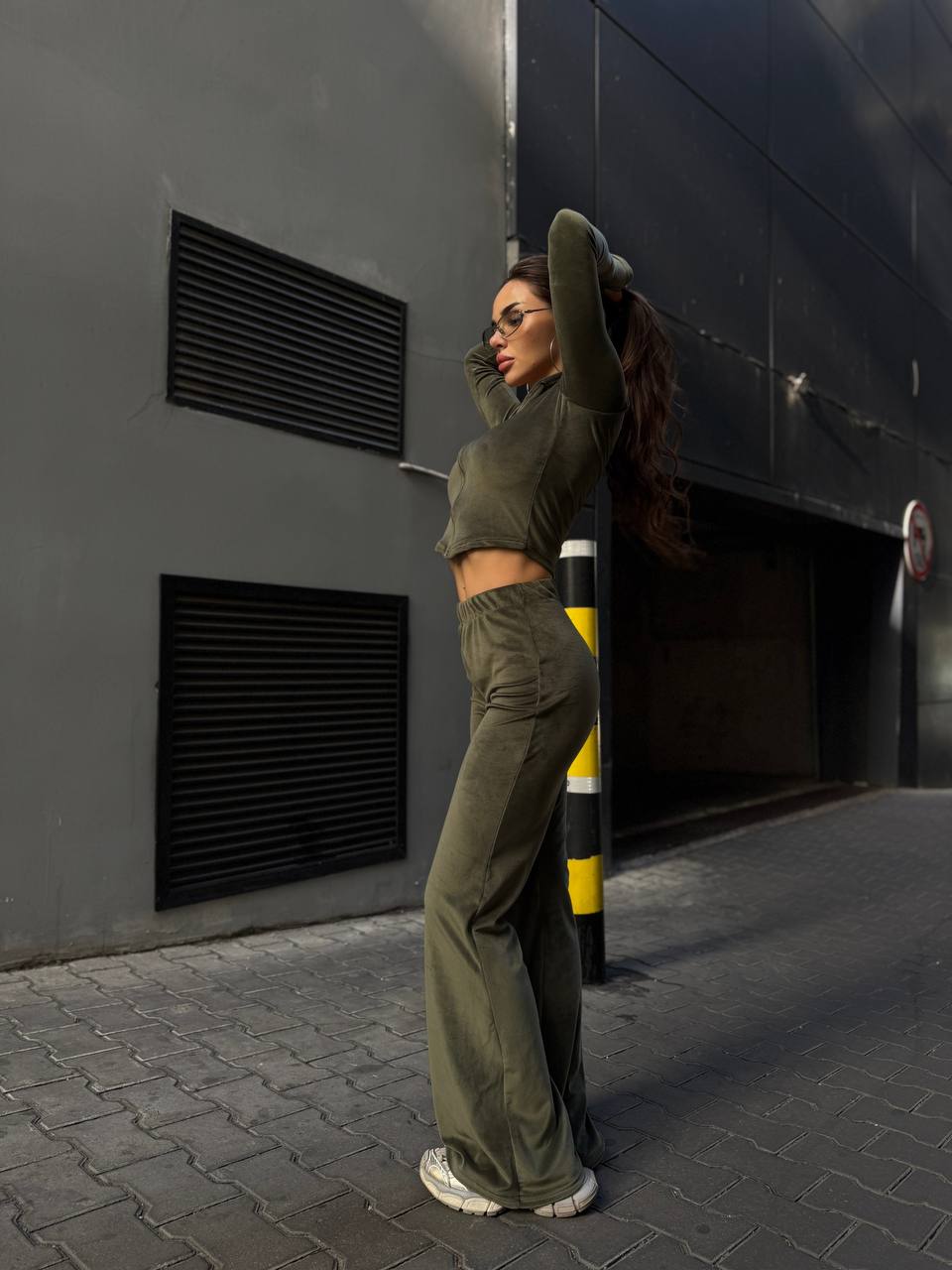 Жіночий Велюровий Костюм Хакі Двійка – Укорочена Кофта на Блискавці + Штани Кльош